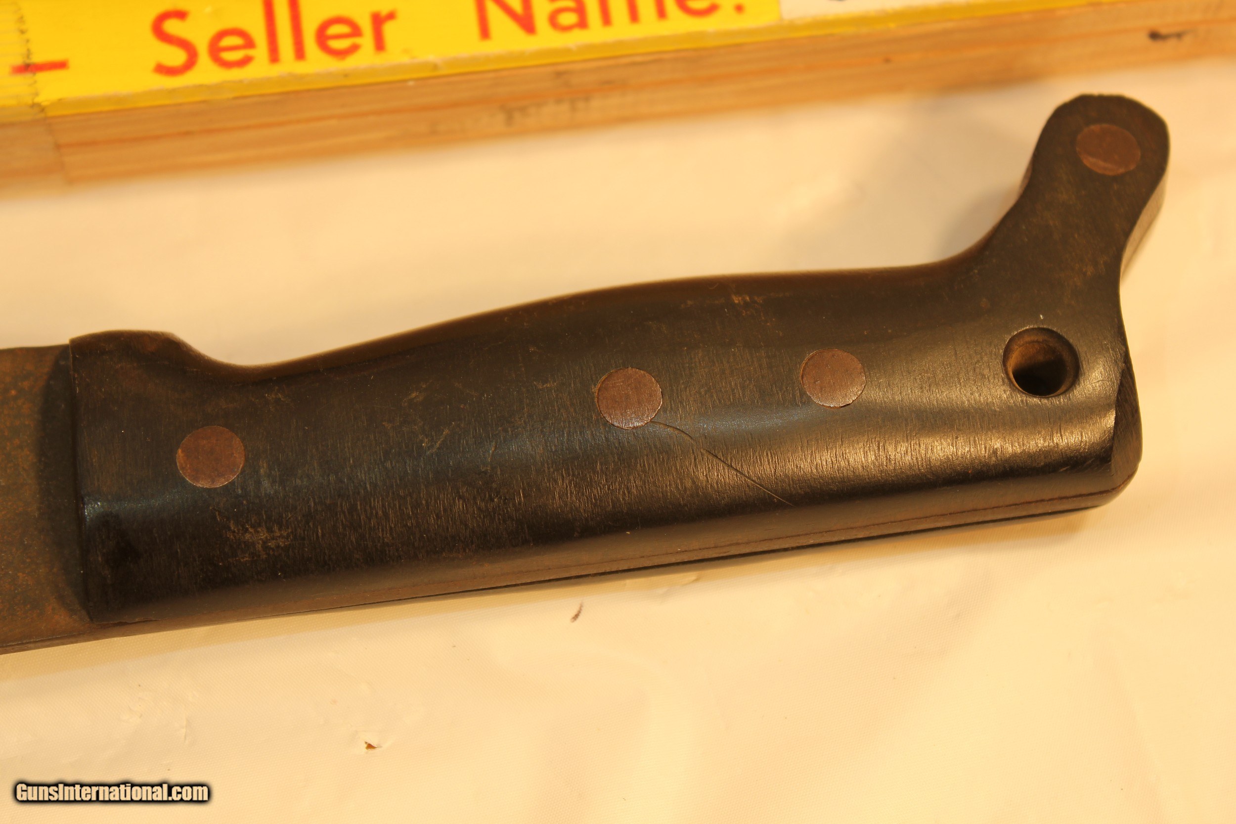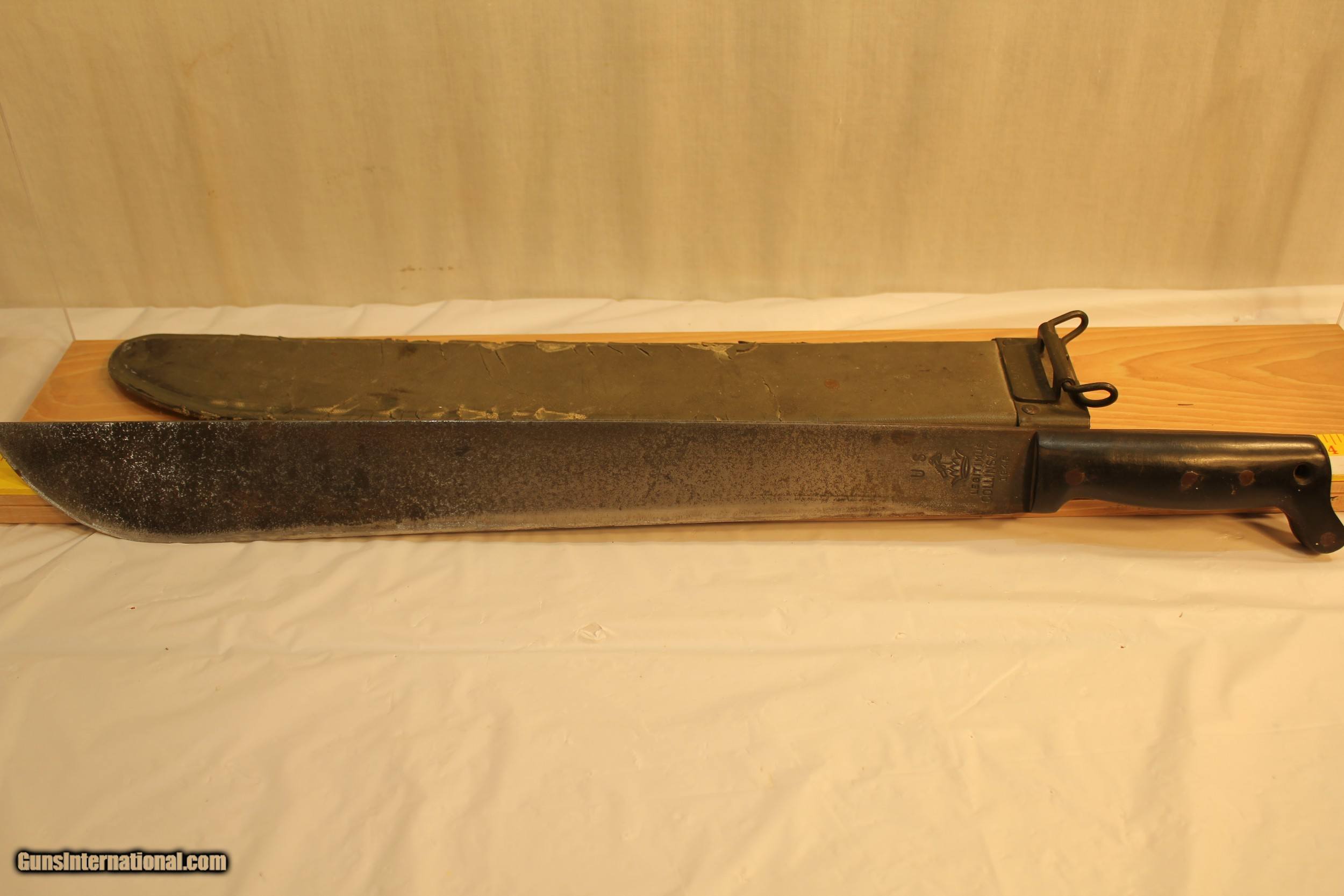 Description: This WW II Machete and scabbard are dated 1945. The blade was made by Legitimus Collins and Co. The scabbard is a little worse for wear and is marked BM Co. 1945. $25.00 Shipping via Priority Mail SOLD |
