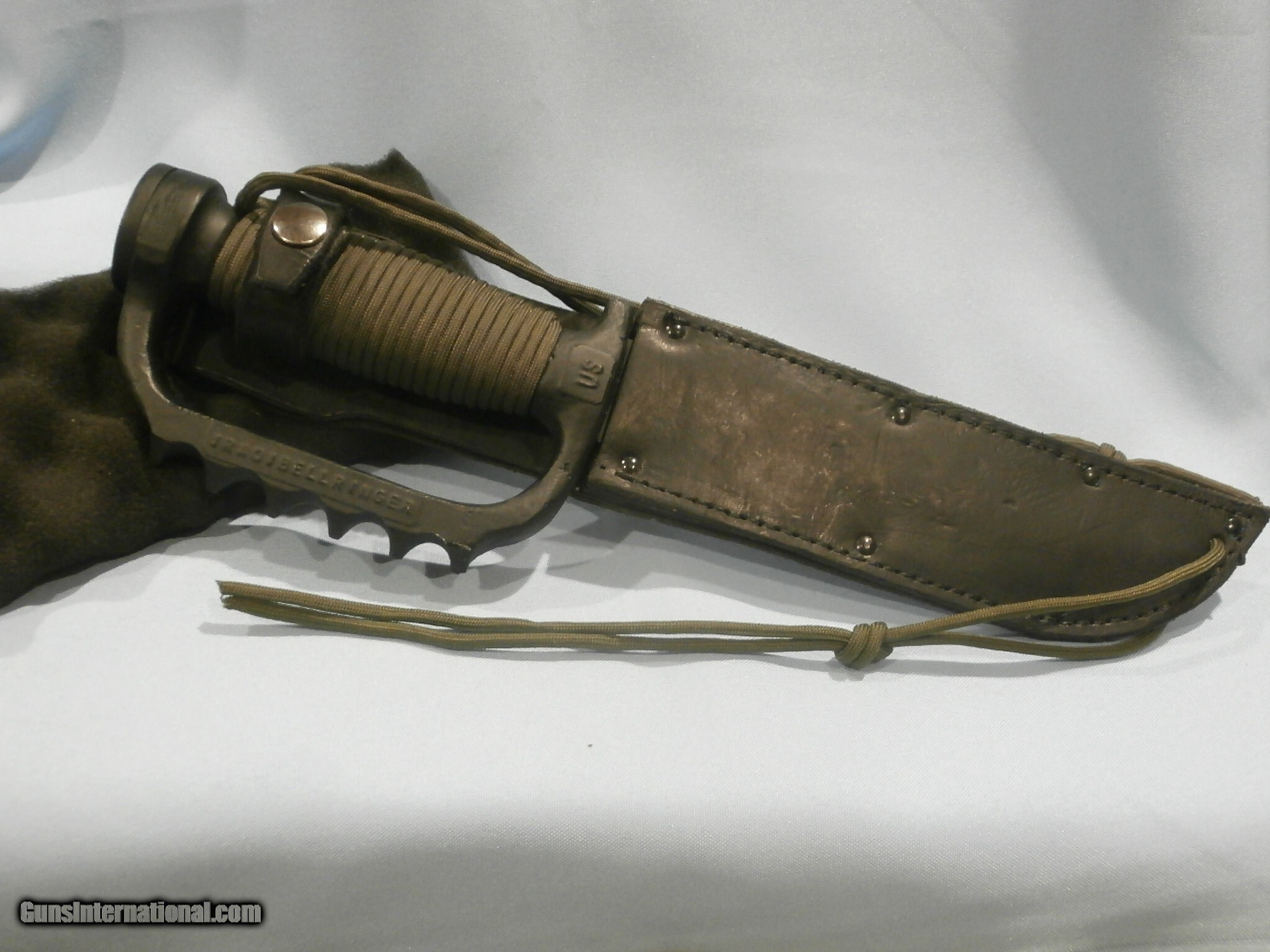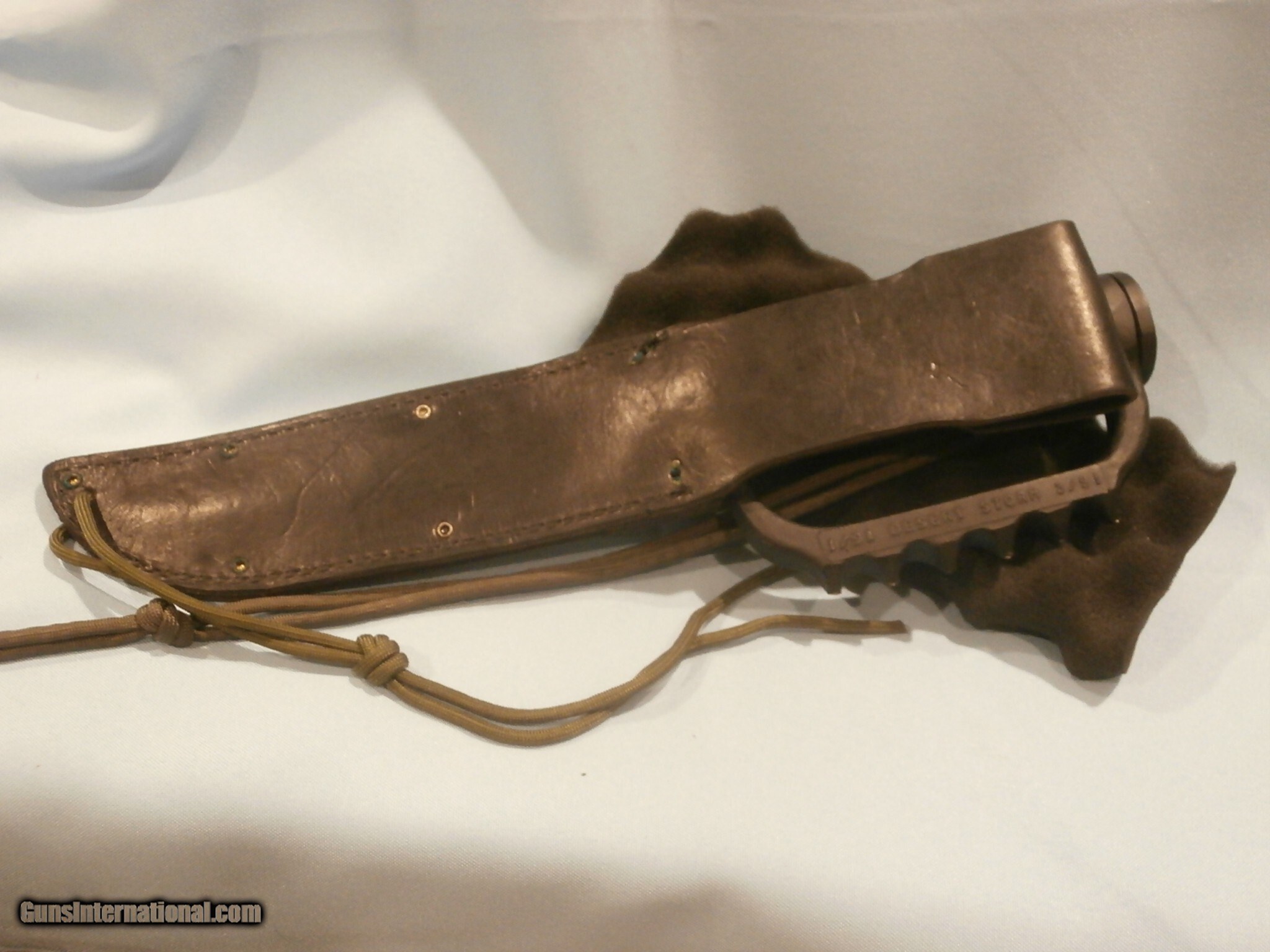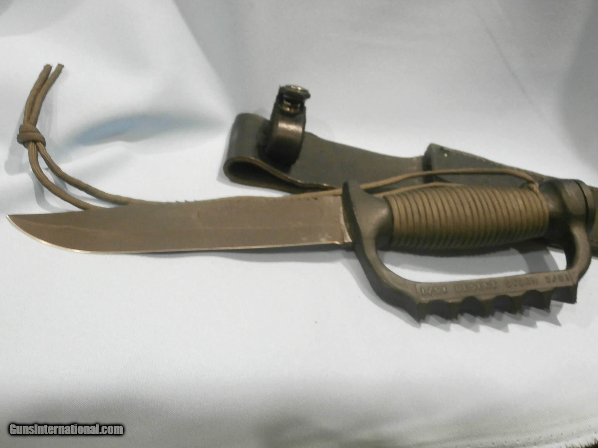 Description: EDMF "IRAQI BELLRINGER" KNUCKLE KNIFE BY DALE SANDBURG...SEE ALL PICS. "07/06 #1813" SEE PICS. RARE!! CUSTOM-ORDERED FROM DALE. DALE CREATED CUSTOM HILTS FOR MILITARY BLADES ON SPECIAL-ORDER FROM MILITARY PERSONNEL...SEE PICS. THIS UNIQUE EDMF WAS CREATED USING THE CUSTOMER-SUPPLIED MKII BLADE AND SCABBARD...SEE ALL PICS. DALE THEN CREATED A SPECTACULAR, AGRESSIVE, CUSTOM, 3 1/2" SAWTOOTH ON THE BLADE SPINE!...SEE PICS. NEW, UNUSED, 6 7/8" ORIGINAL, U.S. ONTARIO MKII BLADE...SEE PICS ORIGINAL EDGES REMAIN RAZOR-SHARP!!...SEE PICS. ORIGINAL, U.S. ONTARIO MKII BLADE HAS BEEN FITTED BY DALE WITH HIS FULL KNUCKLE GRIP...SEE PICS. THE GRIP IS STAMPED "US" "IRAQI BELLRINGER" "1/91 DESERT STORM 3/91" ...SEE ALL PICS. DALE THEN WRAPPED HIS GRIP IN GREEN PARACORD, WITH LANYARDS...SEE PICS. 12 1/2" OVERALL LENGTH...SEE PICS. THIS KNIFE IS ALSO MATED WITH THE ORIGINAL, BLACK, ONTARIO MKII SCABBARD..SEE ALL PICS. 99% MINT CONDITION!!...SEE ALL PICS. THIS IS A SPECTACULAR EXAMPLE OF DALE'S EXCELLENT WORK! ...IN THIS CASE, A CUSTOM BLADE CONVERSION WITH KNUCKLE GRIP!!...SEE ALL PICS. MORE THAN TWO DOZEN ADDITIONAL, ORIGINAL, EDMF KNUCKLE KNIVES ARE ALSO AVAILABLE FOR SALE. Price: $999.95 Contact Seller |