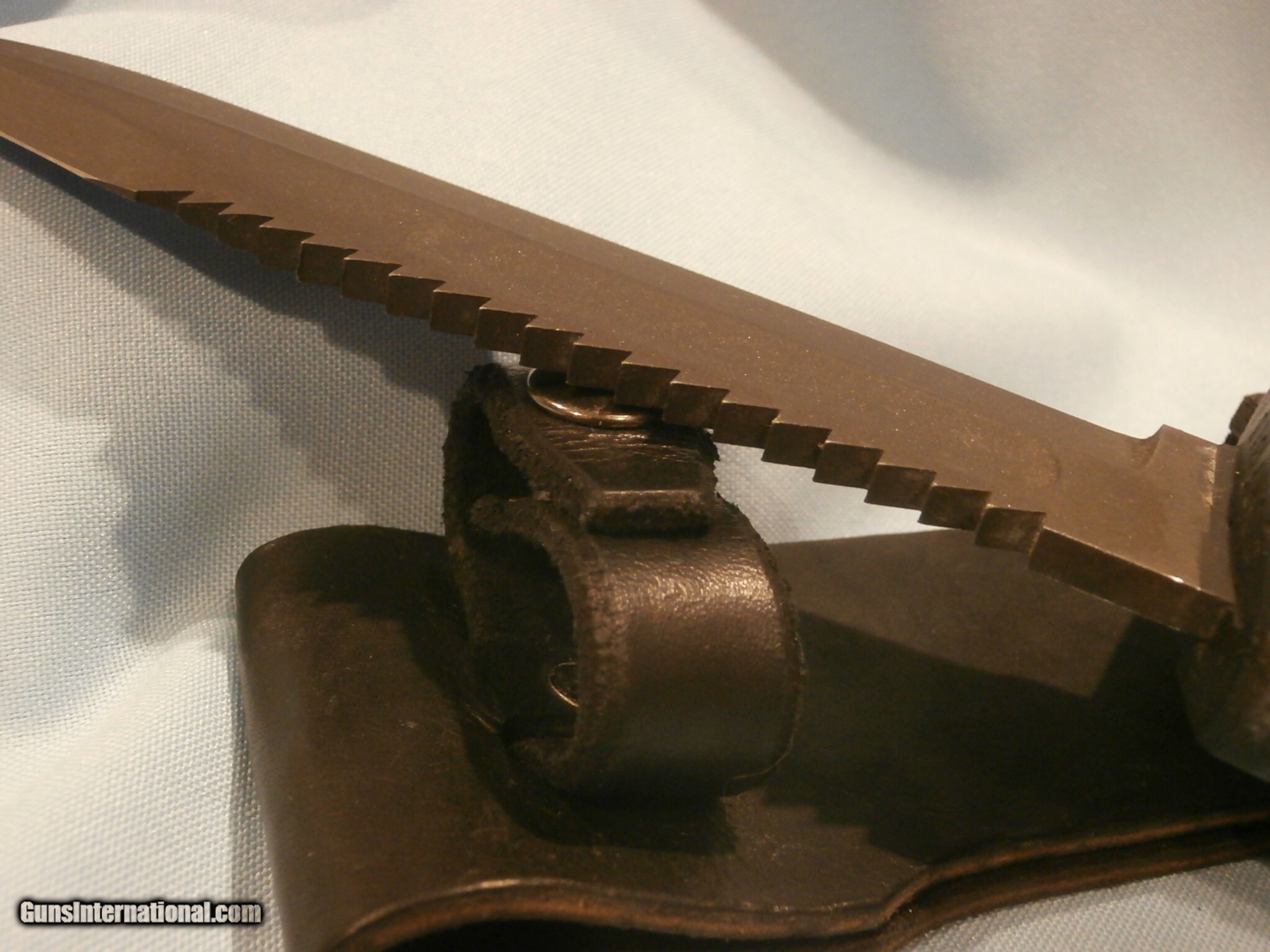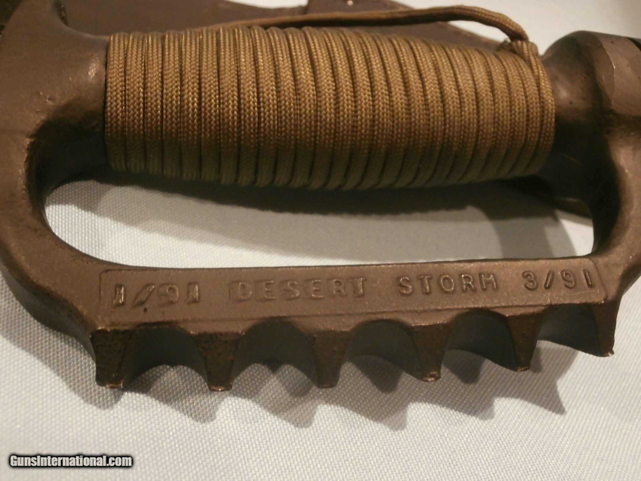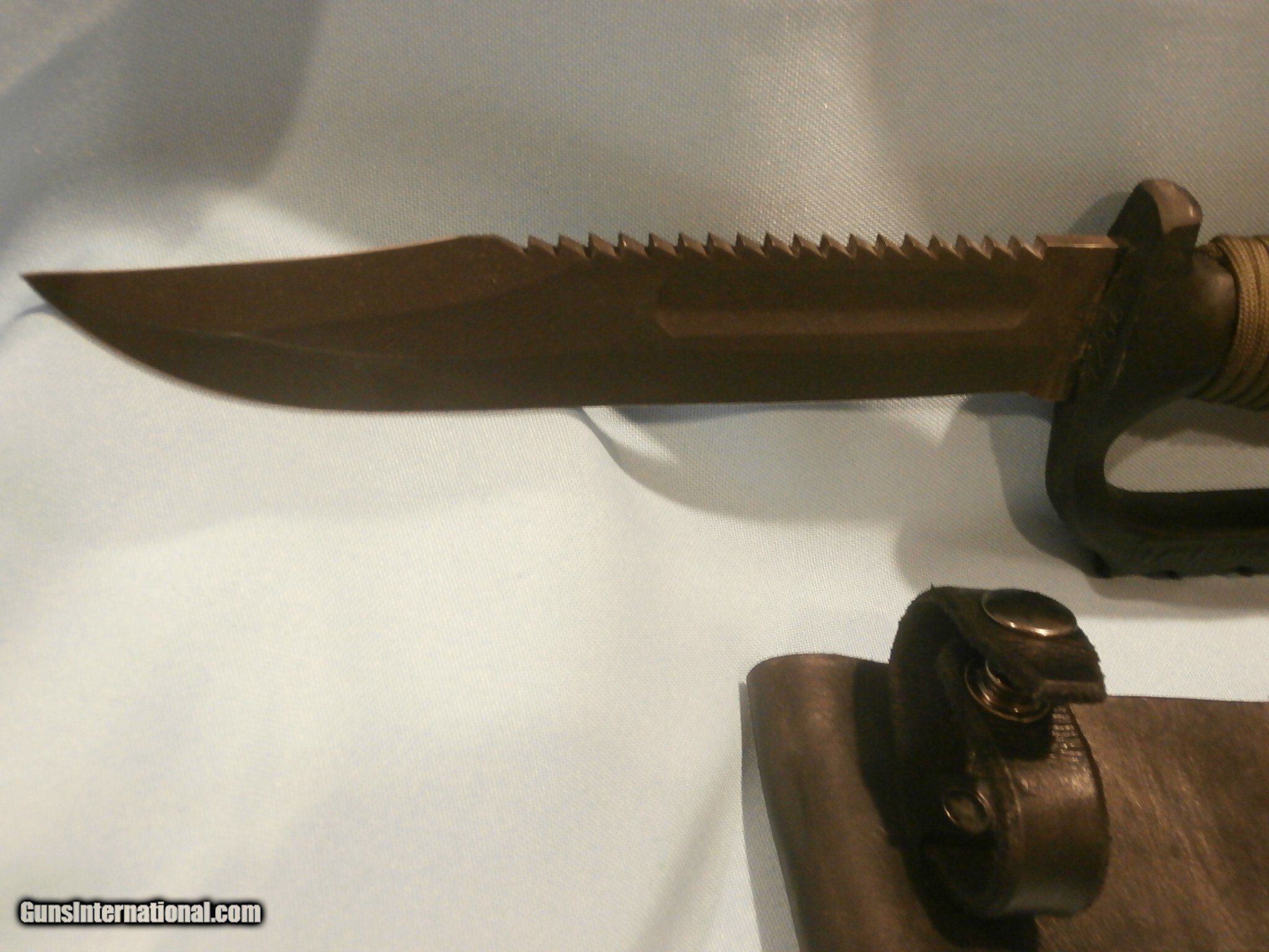 Description: EDMF "IRAQI BELLRINGER" KNUCKLE KNIFE BY DALE SANDBURG...SEE ALL PICS. "07/06 #1813" SEE PICS. RARE!! CUSTOM-ORDERED FROM DALE. DALE CREATED CUSTOM HILTS FOR MILITARY BLADES ON SPECIAL-ORDER FROM MILITARY PERSONNEL...SEE PICS. THIS UNIQUE EDMF WAS CREATED USING THE CUSTOMER-SUPPLIED MKII BLADE AND SCABBARD...SEE ALL PICS. DALE THEN CREATED A SPECTACULAR, AGRESSIVE, CUSTOM, 3 1/2" SAWTOOTH ON THE BLADE SPINE!...SEE PICS. NEW, UNUSED, 6 7/8" ORIGINAL, U.S. ONTARIO MKII BLADE...SEE PICS ORIGINAL EDGES REMAIN RAZOR-SHARP!!...SEE PICS. ORIGINAL, U.S. ONTARIO MKII BLADE HAS BEEN FITTED BY DALE WITH HIS FULL KNUCKLE GRIP...SEE PICS. THE GRIP IS STAMPED "US" "IRAQI BELLRINGER" "1/91 DESERT STORM 3/91" ...SEE ALL PICS. DALE THEN WRAPPED HIS GRIP IN GREEN PARACORD, WITH LANYARDS...SEE PICS. 12 1/2" OVERALL LENGTH...SEE PICS. THIS KNIFE IS ALSO MATED WITH THE ORIGINAL, BLACK, ONTARIO MKII SCABBARD..SEE ALL PICS. 99% MINT CONDITION!!...SEE ALL PICS. THIS IS A SPECTACULAR EXAMPLE OF DALE'S EXCELLENT WORK! ...IN THIS CASE, A CUSTOM BLADE CONVERSION WITH KNUCKLE GRIP!!...SEE ALL PICS. MORE THAN TWO DOZEN ADDITIONAL, ORIGINAL, EDMF KNUCKLE KNIVES ARE ALSO AVAILABLE FOR SALE. Price: $999.95 Contact Seller |