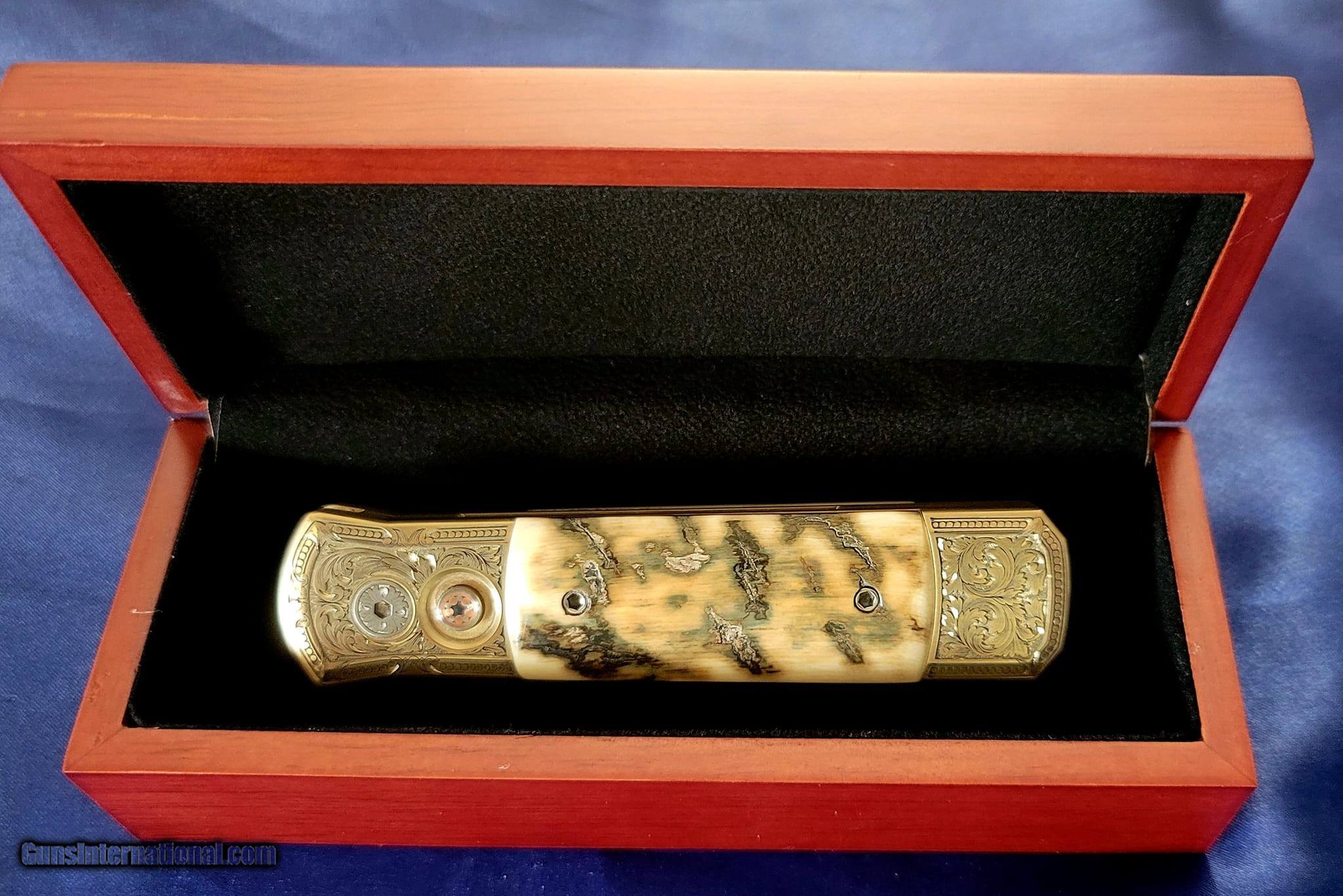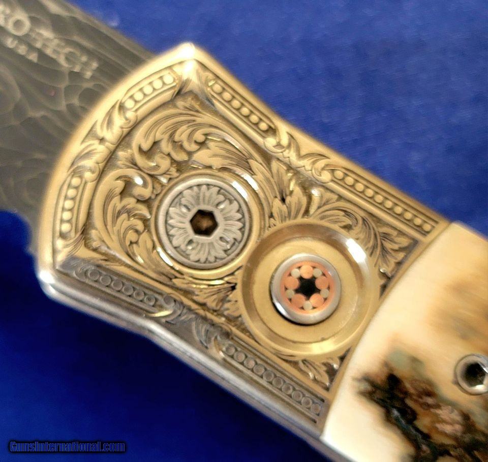 Description: This is one of the most BEAUTIFUL Pro-Tech 2023 ULTIMATE CUSTOM GODSON EVER! A super CLASSY addition to any collection! It has Bark & Cream colored Ancient MASTADON IVORY Inlays on both sides with Bronze/al frame Italian Engraved by Botega Incisio with titanium pocket clip and "Vines & Roses" Vegas Forge Damascus Complete with wooden display box with description embossed on top. BNIB Authorized Dealer $15 PRIORITY SHIPPING USA SOLD |