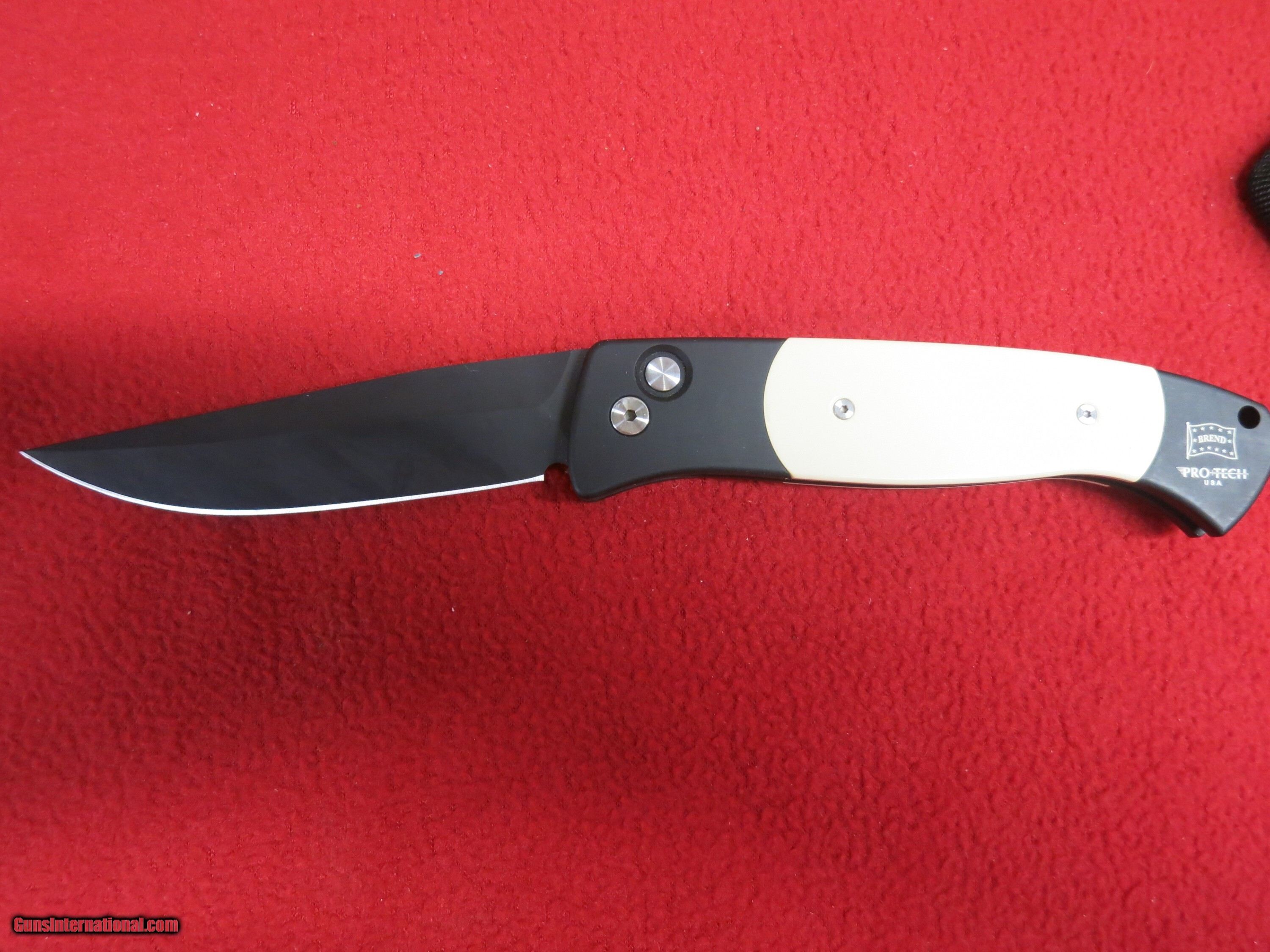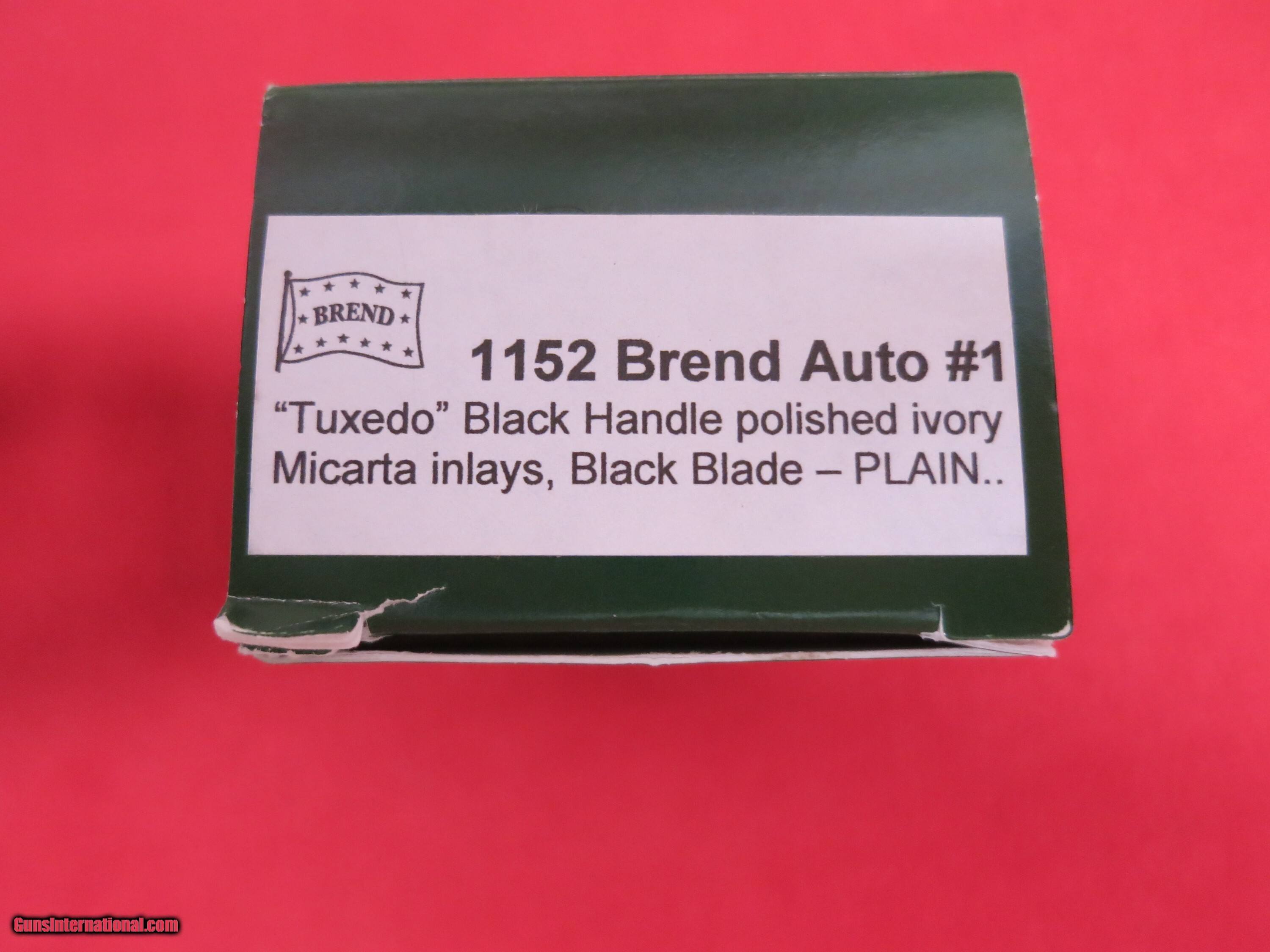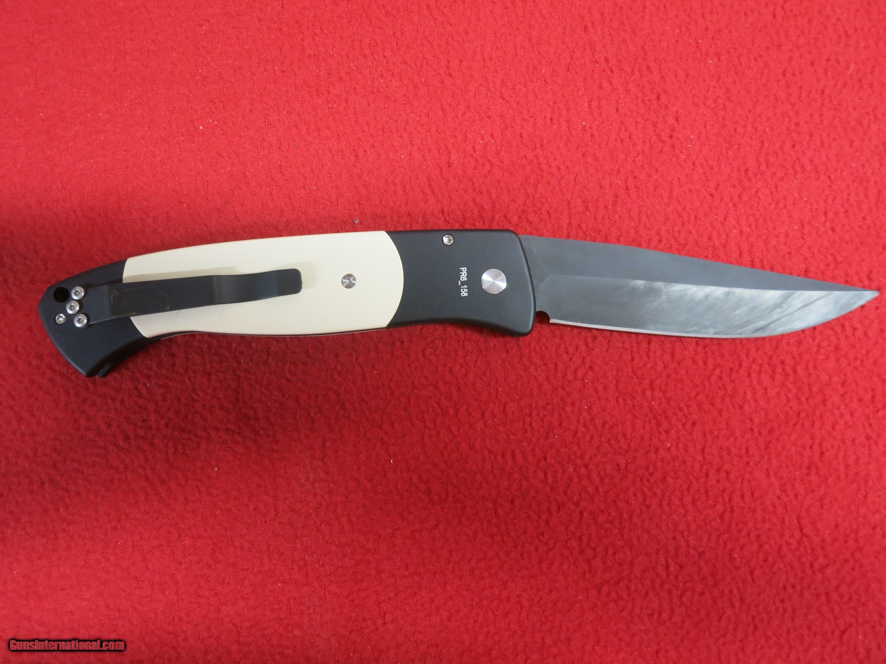 Description: PRO-TECH BREND AUTO # 1 MODEL 1152. NIB. TUXEDO BLACK HANDLE WITH IVORY MICARTA INLAYS. HANDLE MEASURES 6.00." BLADE IS 4.625" LONG WITH PLAIN CUTTING EDGE & CLIP POINT. OVERALL LENGTH IS 10.625." OVER ALL LENGTH IS 10.625." WT. IS 5.68 OZ. HAS POCKET CLIP FOR EASY CARRING & A NICE BELT HOLSTER. AUTOMATIC PUSH BUTTON. THIS IS ONE OF THE FASTEST AUTOS ON THE MARKET & A GREAT TACTICAL KNIFE. DESIGNED BY WALTER BREND. ONLY $285.00 SHIPPED TO YOU. CALL OR E-MAIL WITH QUESTIONS; Price: $285.00 Contact Seller |