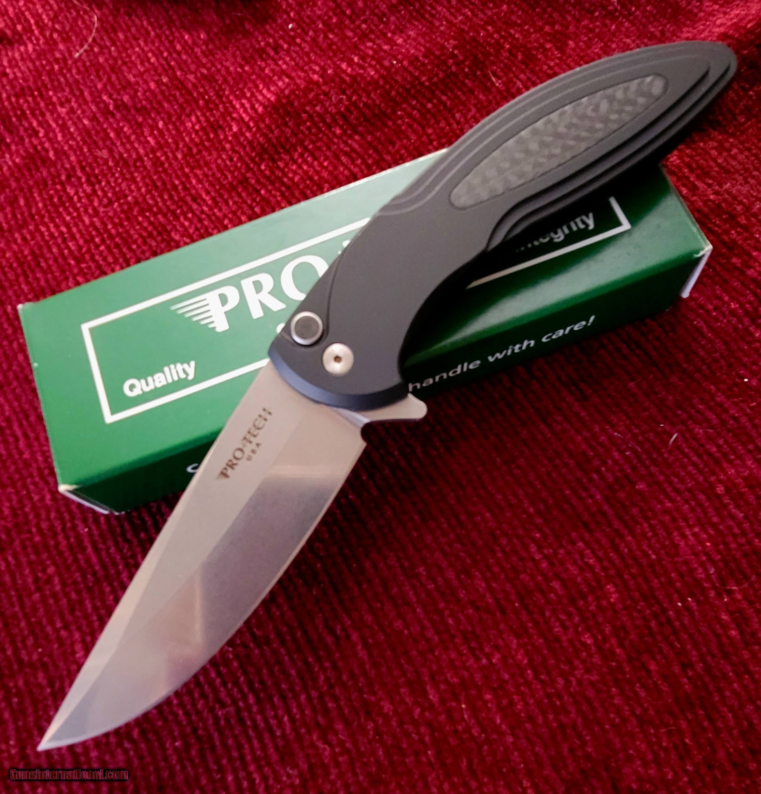 Description: PRO-TECH CAMBRIA MANUAL FLIPPER KNIFE BLACK/CARBON FIBER/Stone Washed 3.5"blade limited Production Run 1 #178of 200. NIB Authorized Dealer- No longer available.(2017 Blade show knife of the Year!) This Limited Edition Cambria model sports a stonewashed blade and a black anodized aluminum handle with a carbon fiber inlay and button.The Cambria is the first flipper folding knife to join Protech's extensive lineup. It offers a slender, easy-to-carry build with a ball bearing pivot and button lock for smooth one-handed operation. The curvature of the handle provides a comfortable and natural grip, with the flipper serving as a guard for added security during use. Complete with a deep carry clip and a lanyard cut handle, the Cambria is a top contender for a slot in your EDC rotation.Features:Aluminum handle provides a lightweight and durable build. 154CM steel blade offers great corrosion and wear resistance. Deep carry clip allows for discreet pocket carry.SPECIFICATIONS Overall Length: 7.75" Blade Length: 3.50" Blade Thickness: 0.13" Blade Material: 154CM Blade Style: Drop Point Blade Grind: Flat Finish: Stonewash Edge Type: Plain Handle Length: 4.25" Handle Thickness: 0.47" Handle Material: Aluminum, Carbon Fiber Color: Black, Gray Weight: 3.33 oz. User: Right Hand Pocket Clip: Tip-Up Knife Type: Manual Opener: Flipper Lock Type: Plunge Lock Brand: Pro-Tech Model: Cambria Country of Origin: USA SOLD |