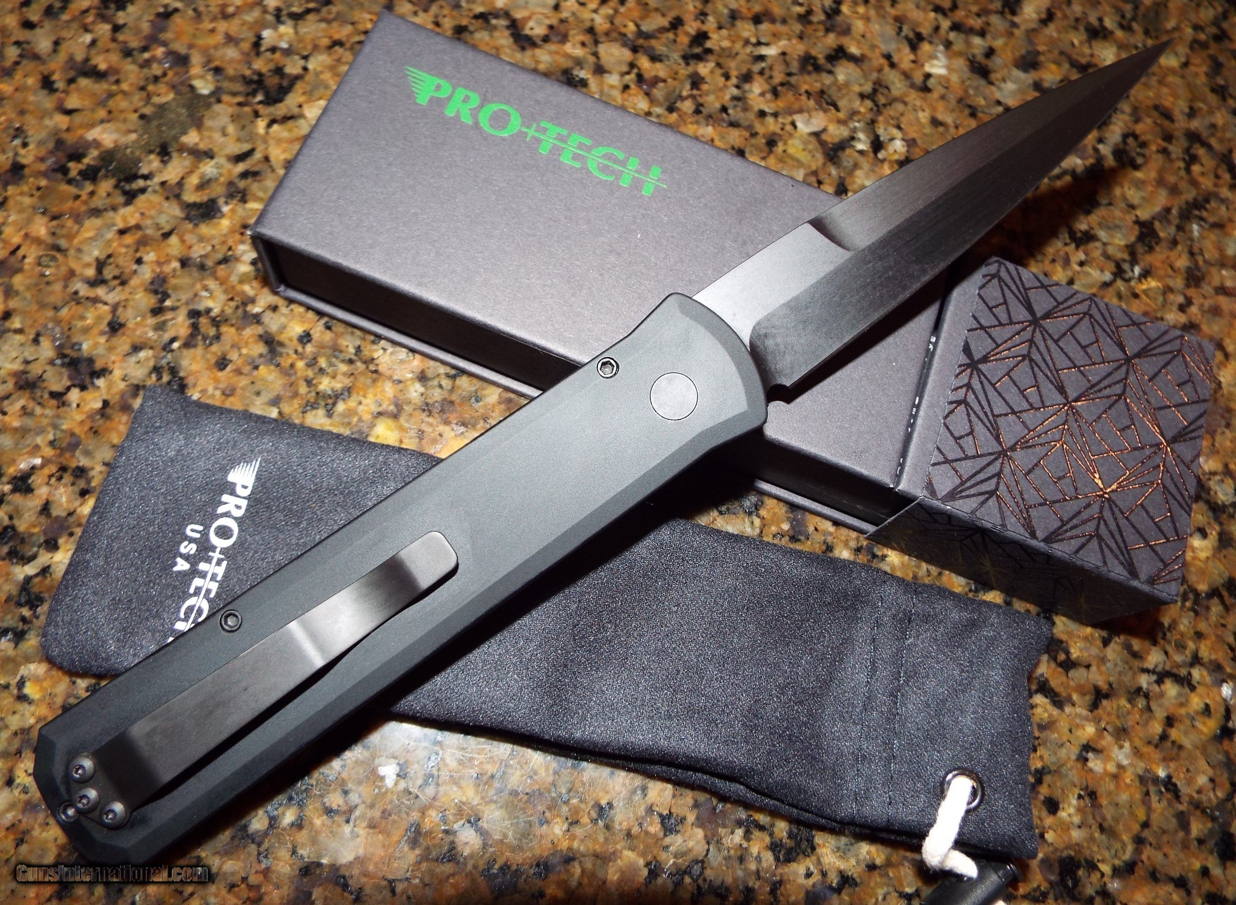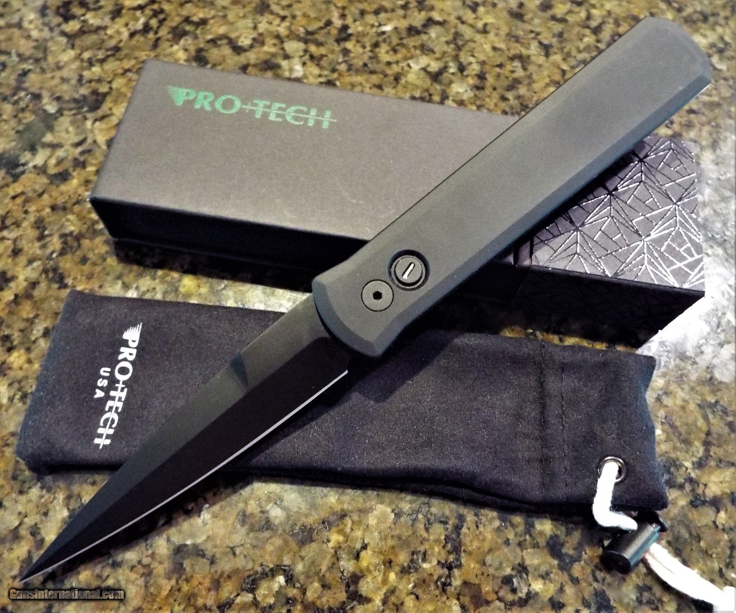 Description: PRO-TECH GODFATHER "OPERATOR SERIES" AUTO TRITIUM Inlay Button ~ Sterile ALL BLACK NIB ~ The latest version of PROTECHS Awesome "OPERATOR" Line of sterile black knives with GLOWING TRITIUM Buttons. Protech designed the Godfather automatic knife with a modernized Italian stiletto flair with a long, thin blade and sharp as a razor. The Specs for the Protech Godfather knife is overall open length of 9..25" with a blade length of 4". The blade thickness is .125" and the blade steel is 154CM, 59RC. Closed length is 5..25" with the handle thickness of .49" and this side opening knife weighs in at 4.15 oz. It is right handed and is tip up carry. Made in the USA. This awesome version is completely STERILE, no writing, no logo All BLACK , HANDLE , BLADE & HARDWARE, with a GLOWING TRITIUM BUTTON. Brightly glows in the dark! SOLD |
