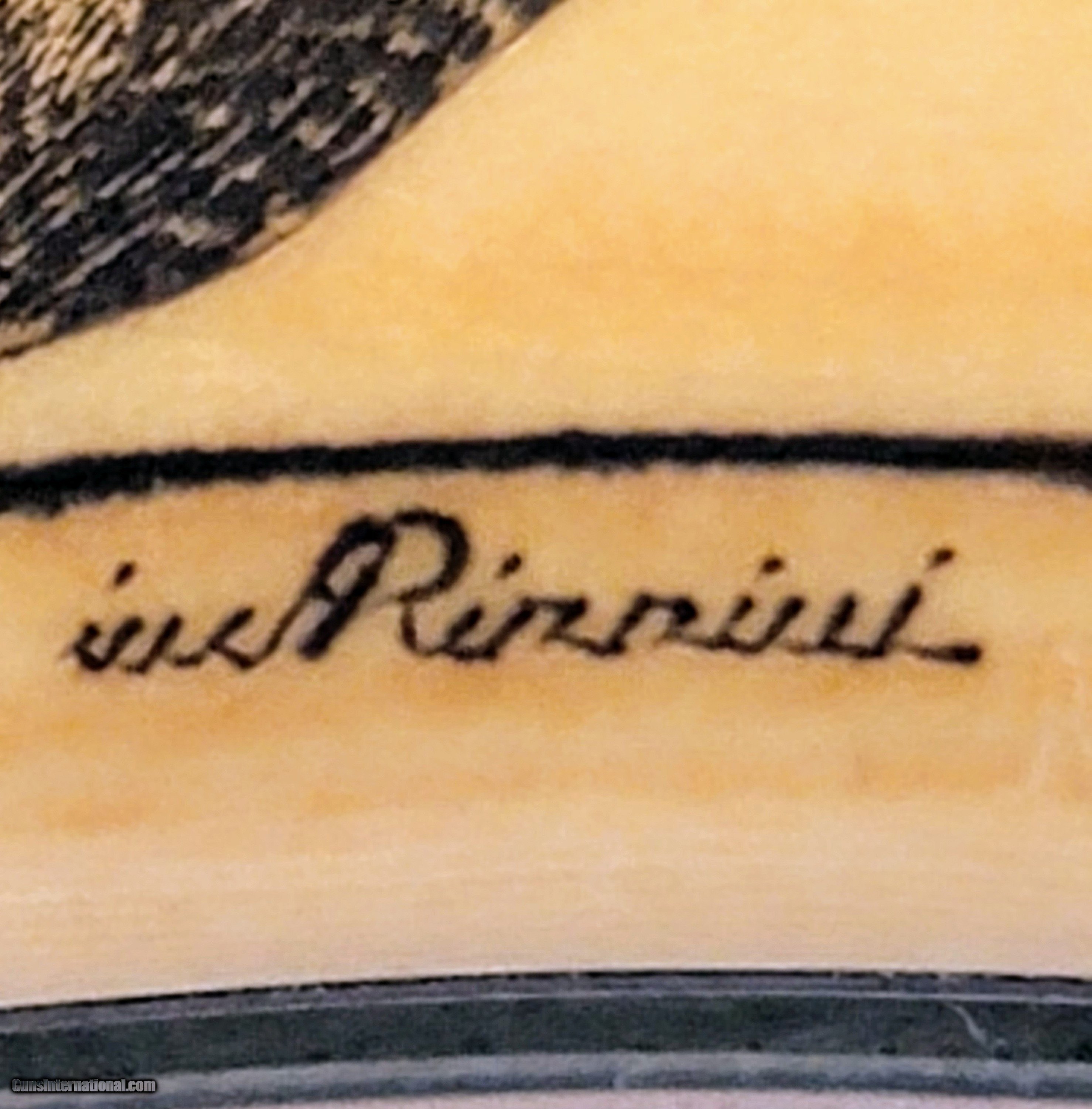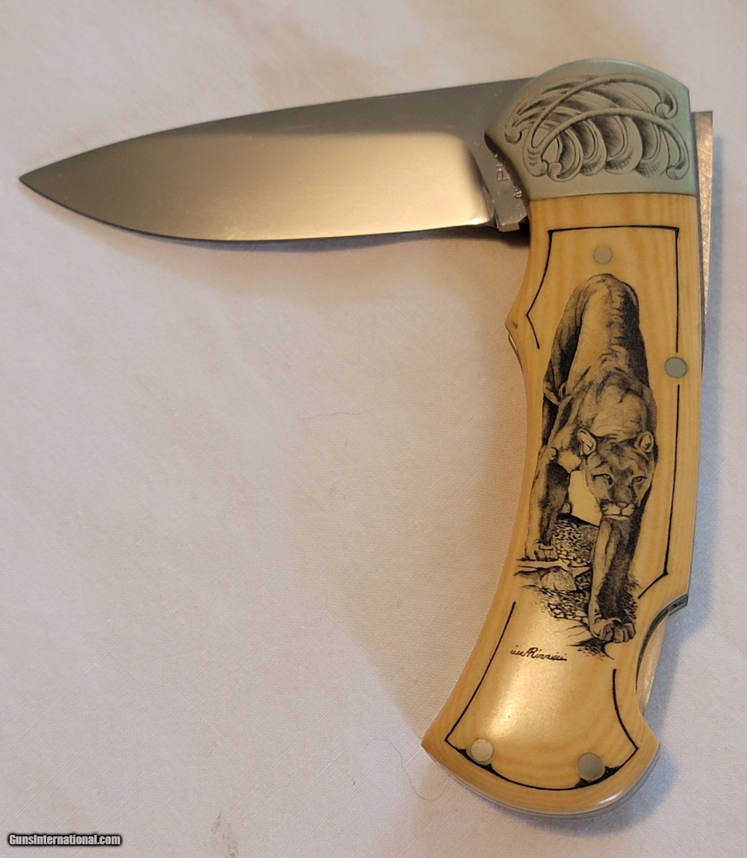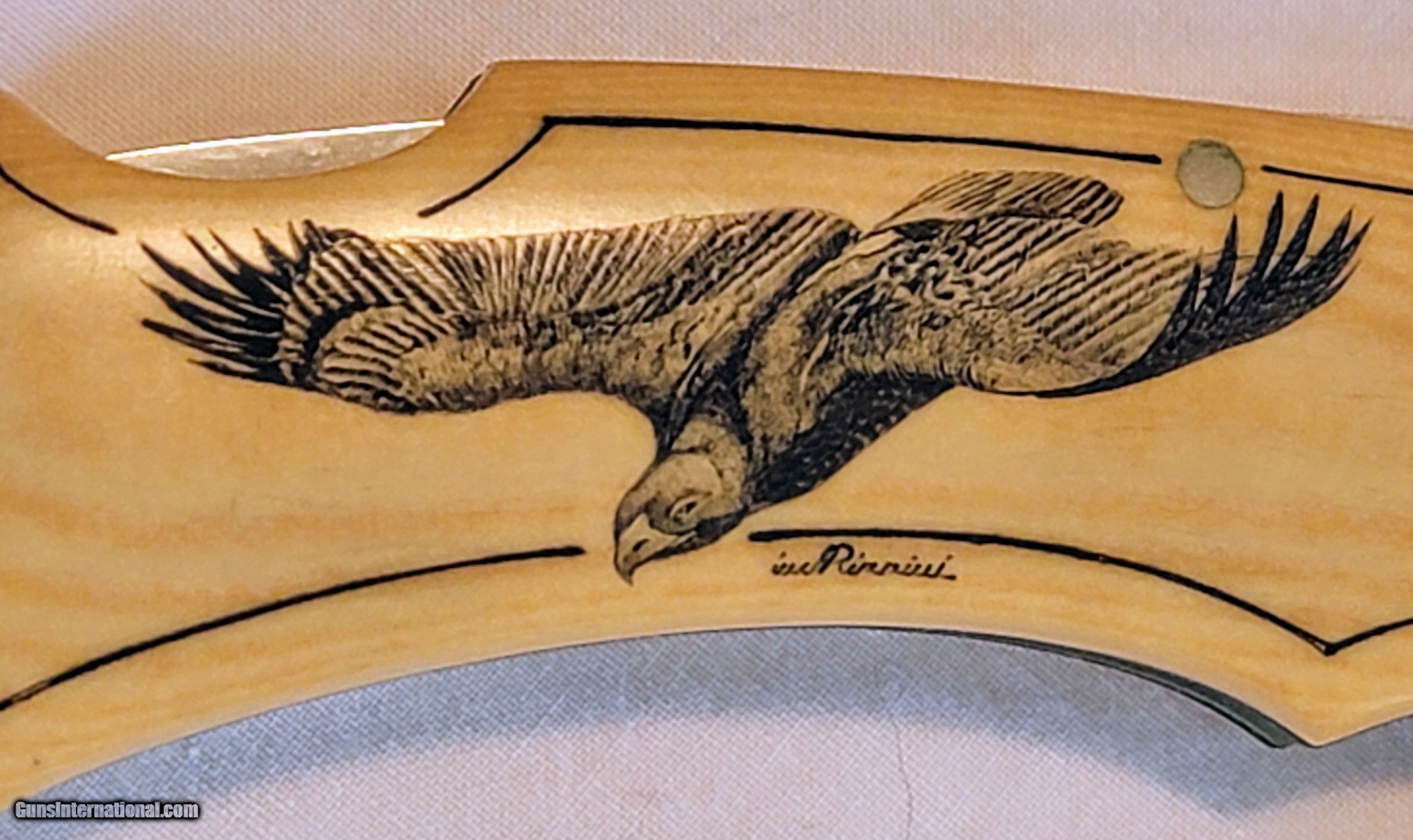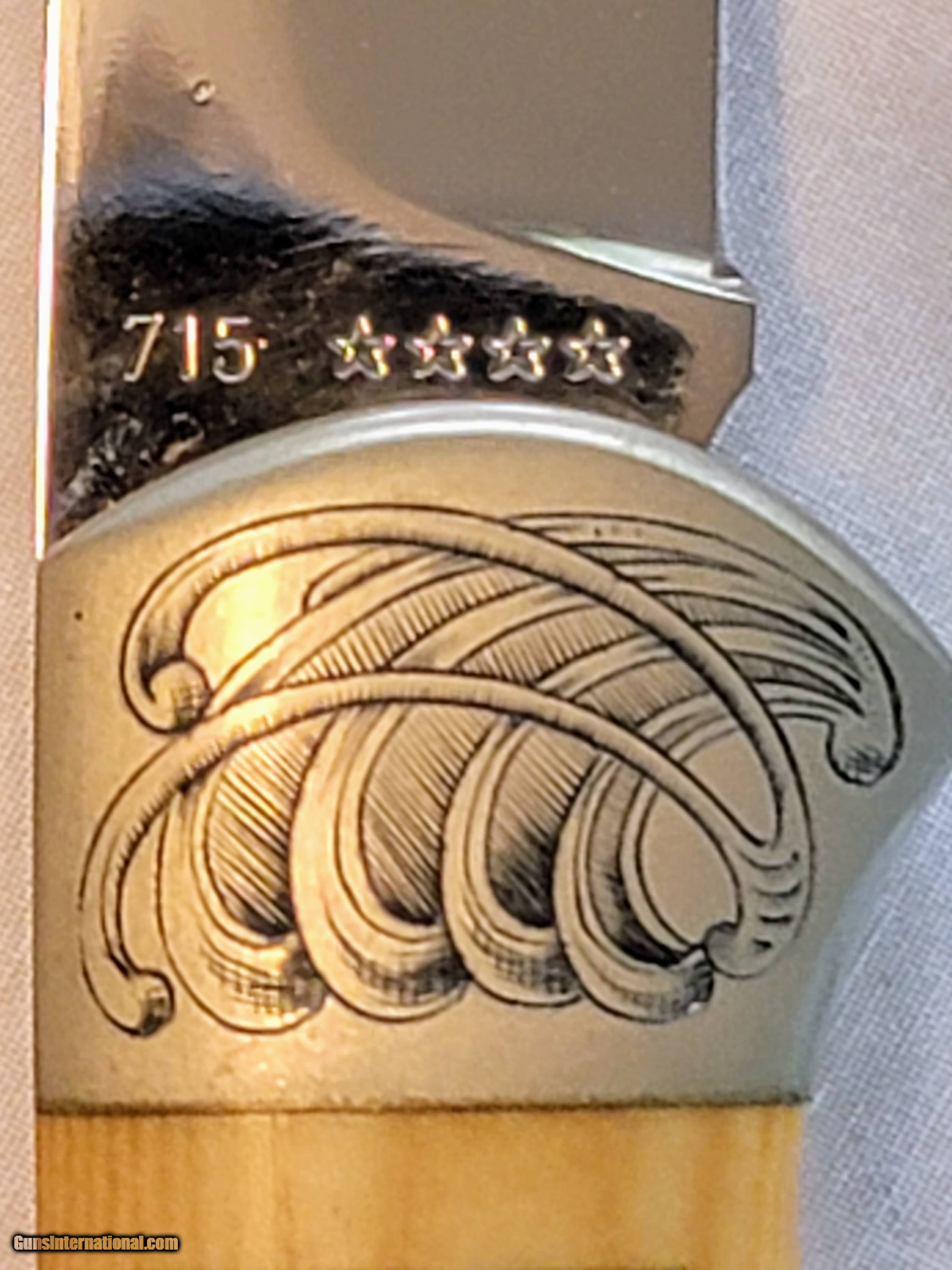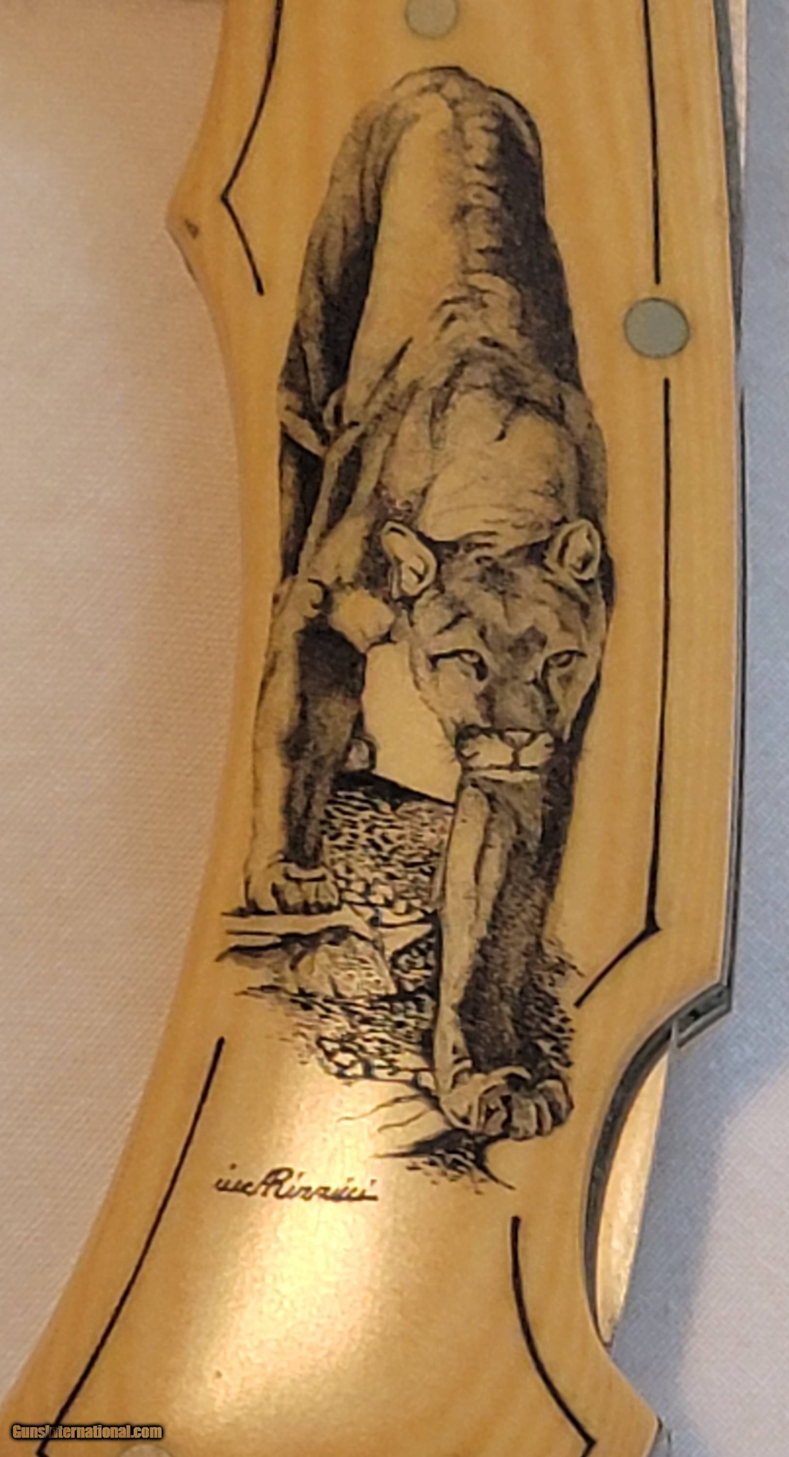 Description: Vintage, new, signed by famous Italian engraver, 3 inch lock blade, 7 inch overall. See photos for serial number and engraver's signatures. Serial #22881. SOLD |