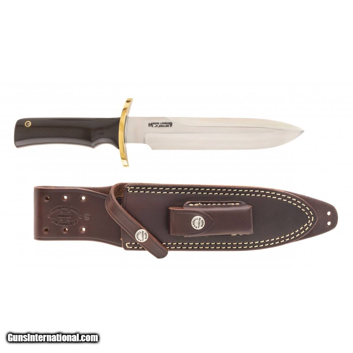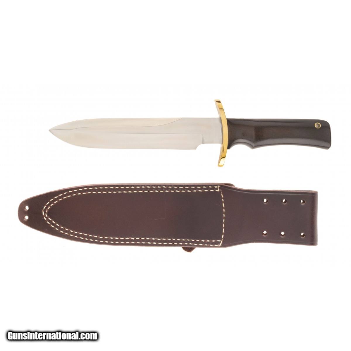 Description: " 7.25"" Blade. Custom Randall made knife with brass hilt and dark wood grips comes in Randall leather sheath SOLD |