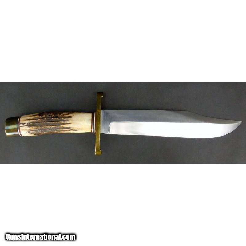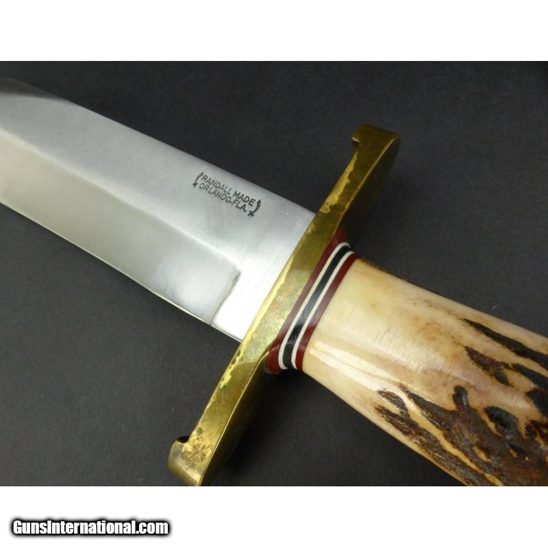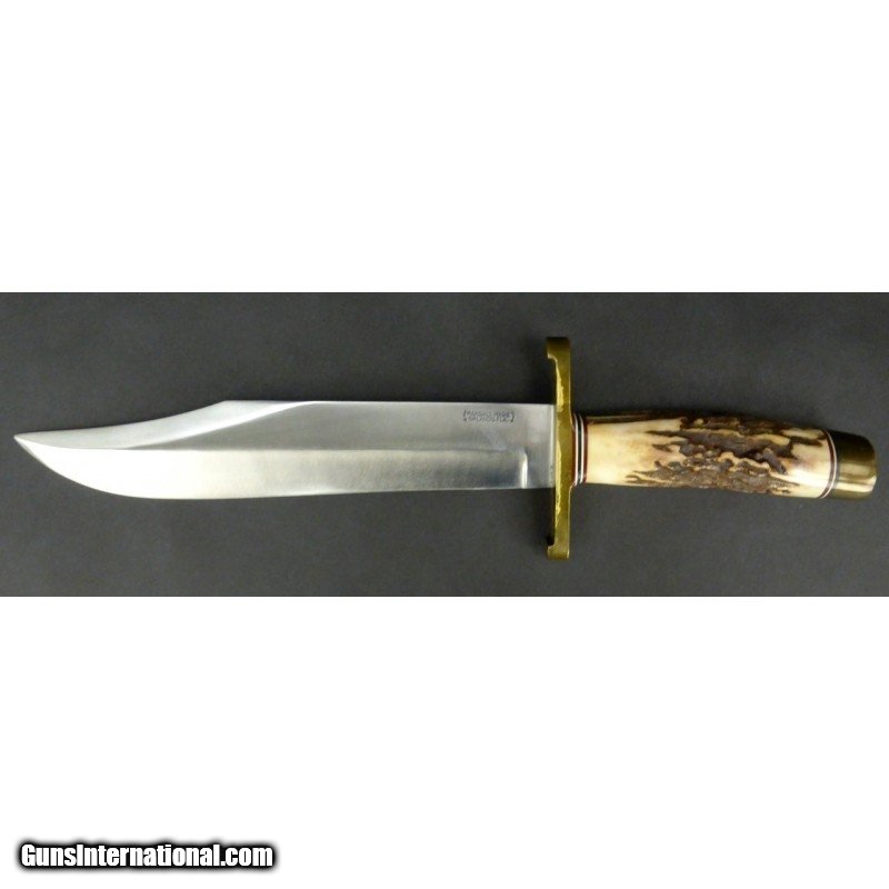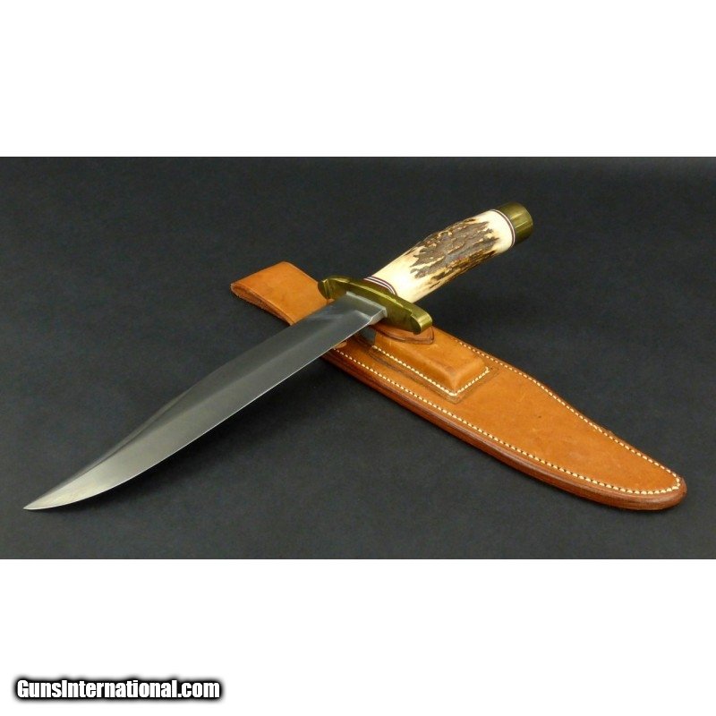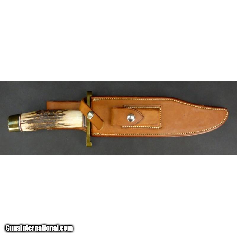 Description: "Randall Model 12 Sportsman’s Bowie. 9" blade, brass lugged with stag handle, and brown roughback leather sheath. SOLD |