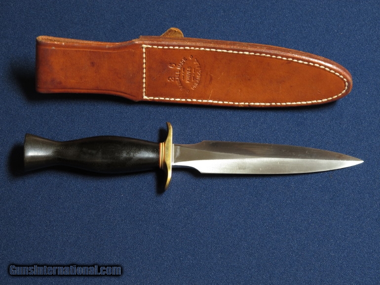 Description: Randall #2-6 Fighting Stiletto. Black micarta handle. Excellent. Red stone. SOLD |