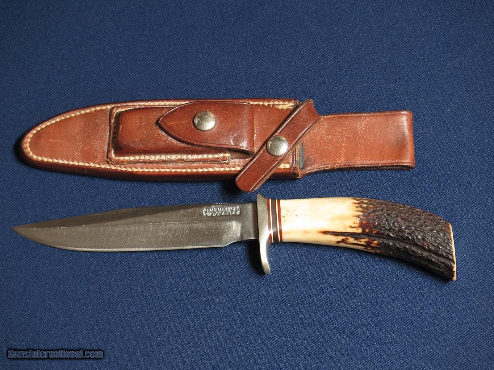 Description: Randall 5-6 Camp and Trail knife. 6 inch blade. Stag handle. Older model with rough back sheath. Shows slight wear. SOLD |