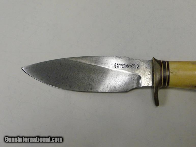 This knife was purchased new from Randall in Orlando and given to me in 1972. It has been stored in my safe since. It has never been used or sharpned. There are no marks, dings or rust. There is some discoloration on the carbon steel blade and oxidation of the brass hilt due to age as I have tried to show in the pictures but no pitting. The leather has never been oiled but has absolutely no cracking. I have not tried to clean the grip or remove any of the oxidation. The knife and sheath are excellent. Shipping & insurance are included. USPS money orders shipped immediately. Personal and bank checks will be shipped once checks clear.