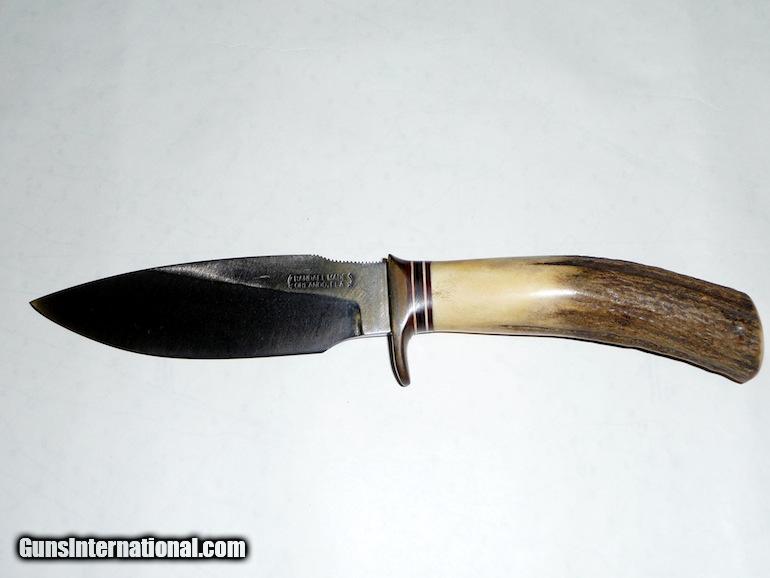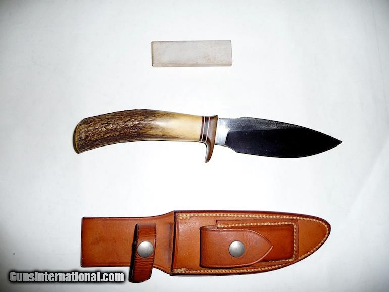 Description: Randall Alaskan Skinner model 11 with a 5" carbon steel blade and stag handle. This knife was purchased new from Randall in Orlando and given to me in 1972. It has been stored in my safe since. It has never been used or sharpned. There are no marks, dings or rust. There is some discoloration on the carbon steel blade and oxidation of the brass hilt due to age as I have tried to show in the pictures but no pitting. The leather has never been oiled but has absolutely no cracking. I have not tried to clean the grip or remove any of the oxidation. The knife and sheath are excellent. Shipping & insurance are included. USPS money orders shipped immediately. Personal and bank checks will be shipped once checks clear.SOLD |