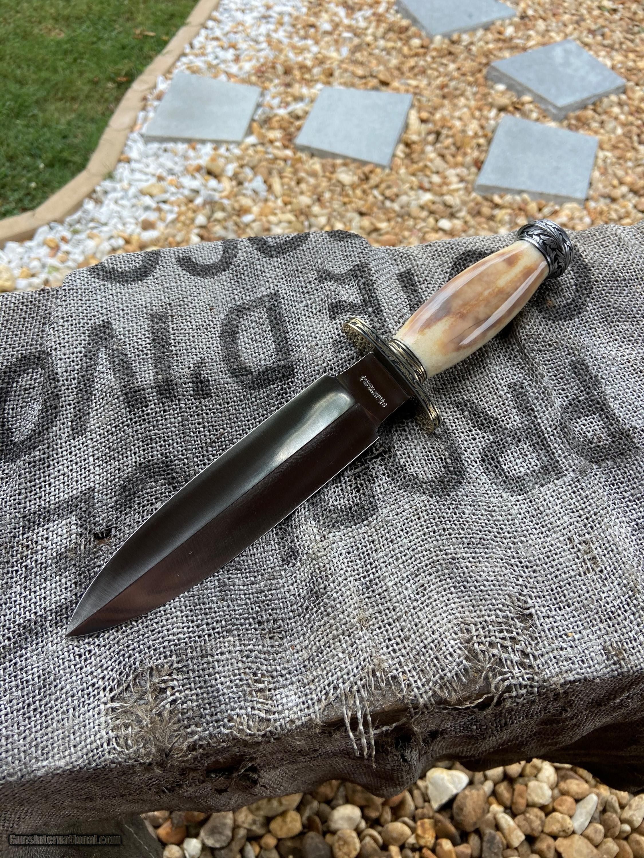 Description: Up for sale is an exquisite example of the Randall Made Knives Clinton Special.7"Stainless Steel blade,forward curved nickel silver hilt,nickel silver collar,flanged duraluminum butt.All deep leaf engraved & gold inlaid by Master engraver Jere Davidson.Dakota,Purdey firearms factory engraver from Virginia.Black Sullivans Clinton Special sheath accompanies knive.Never carried,used,or sharpened.The handle is piece of gorgeous fossil ivory with beautiful colors and the start of fire starter hole.Long time eBay seller.beringause123.No international sales.Thanks for looking. SOLD |