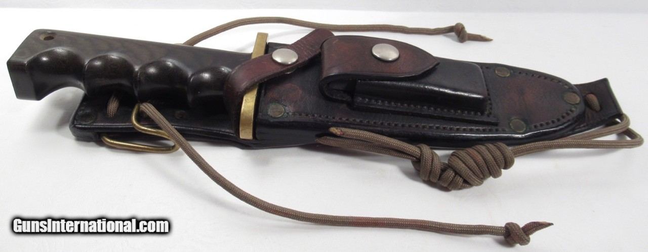 Description: LIQUIDATING PERSONAL COLLECTION; Randall Made Knife (RMK) Model No. 15 Airman; Made Early 1960’s; Black Micarta Handle; 5 ¾” Blade; Original Sheath & Stone; Definitely Vietnam War Used; Price: $1,400 Shipped; Price includes insured shipping; return policy: three days inspection from the date the item is received; full refund of shipping both ways ONLY IF THE ITEM IS MISREPRESENTED. SOLD |