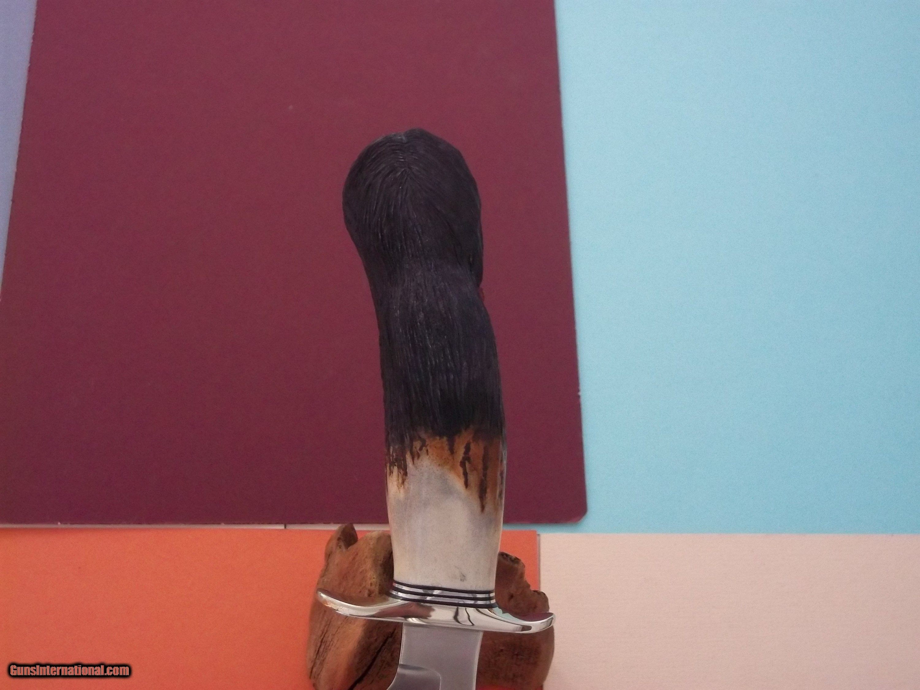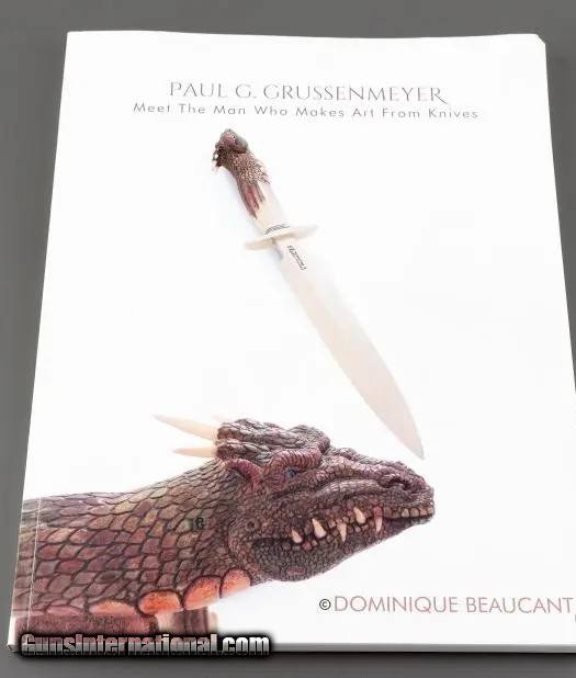 Description: Exceptional and gorgeous Randall model # 1-8" All-Purpose Fighting Knife, stainless steel blade, German silver double guard with matching German silver and black spacers, extra large and exquisite carving of Indian Chief "RED CLOUD" in the selected India Sambar stag handle by Paul G. Grussenmeyer with dental composite resin, hand painted eyes, original brown leatherr scabbard with sharpening stone. The surface area of the carving is twice as large as the carving of a Randall Bear Bowie titled "SETH" that was carved by Grussenmeyer which got sold. See photo # 6 that denotes a large "G" for Grussenmeyer as all the carved knife he did are signed thway. This model is one of the flawless Model # 1 I've ever ever own-as all the Randall knives that were made for Paul G. Grussenmeyer denotes the most beautiful blade and workmanship overall knowing that they will be carved by this exceptional and very talented artist. Sold "AS IS." All sales are final. Free shipping USPS with insurance tracking # and signature required. 1993 production. Please note that I do not engage in any type of trade. Thank you for looking. NOTE: Paul G. Grussenmeyer Meet The Man Who Makes Art From Knives Soft Cover Book of Only 24 Units Luxury Collector's Edition is included in the sale, as the most comprehensive work on Paul G. Grussenmeyer. Jam-packed with over 177 never-before-seen photographs in full color, and inside information on the life and times of Grussenmeyer. Just released in a (8.5"x 11") in a soft cover format. This is a new 120-page special limited numbered luxury "Collector's Edition" of only 24 units. Price of $250.00 includes USPS shipping with tracking number and signature required. There will be no reprint. If interested order (s) are being kindly accepted. There are 20 different Randall Made Knives shown in the catalog out of 25 which were ordered thru the Randall shop over a period of four years. Thank you for looking. Price: $4,495.00 Contact Seller |