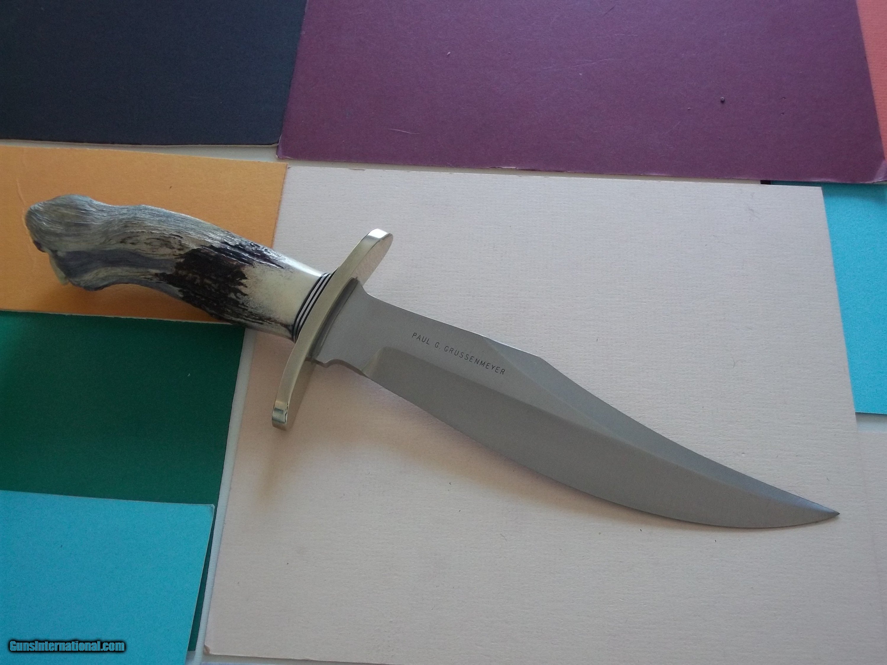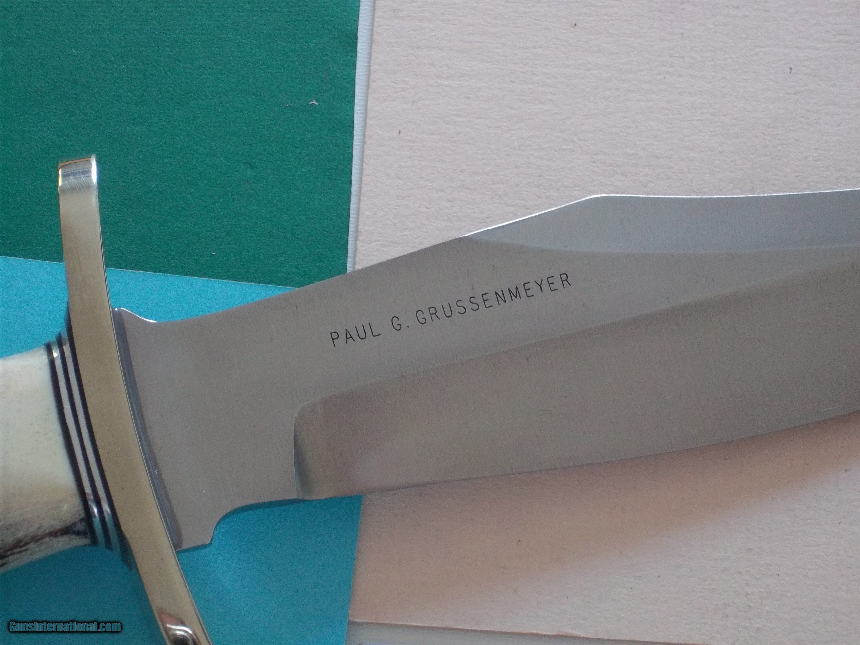 Description: Randall # 12-8" Bear Bowie German silver double guard with forward curve "JEDEDIAH" carved by paul G. Grussenmeyer in the selected India Sambar crown handle, matching German silver and black spacers. sold "AS IS." This Bowie has the largest width I've ever had on a Bear Bowie All sales are final.. Free shipping USPS with tracking # , insurance and signature required. 1991 production. Made especially for Paul G. Grussenemeyer as this is Grussenmeyer's last personal knife out of six that bears his name on the blade, therefore he had the Randall shop etched in name/last on the right side of the blade. Please note that I do not engage in any type of trade. All the carved Randall knives were made between 1991-1995 as it took four years from Grussenmeyer to carved these 25 knives, about 6 knives a year! Sold "AS IS. All sales are final. Thanks for looking. SOLD