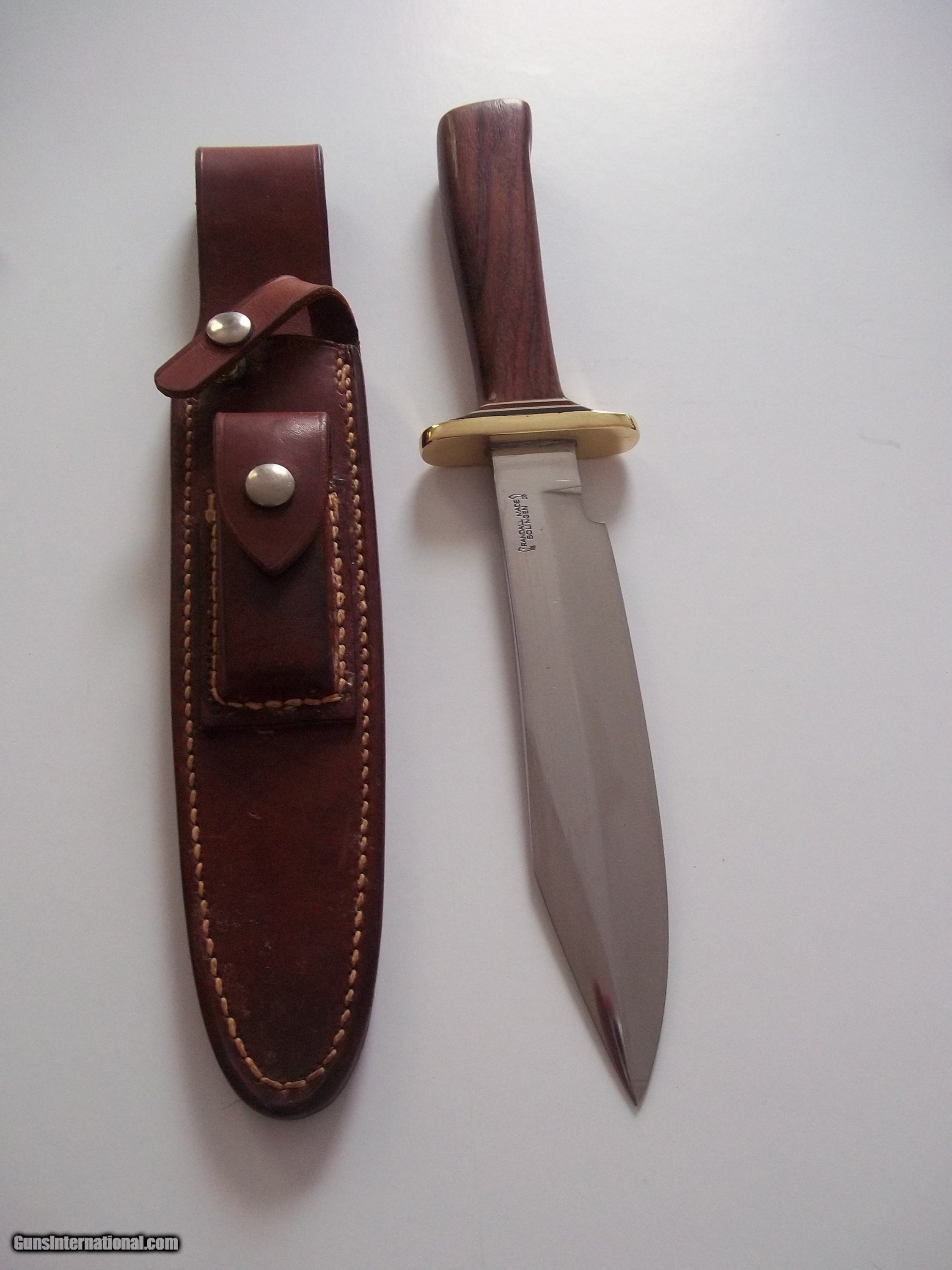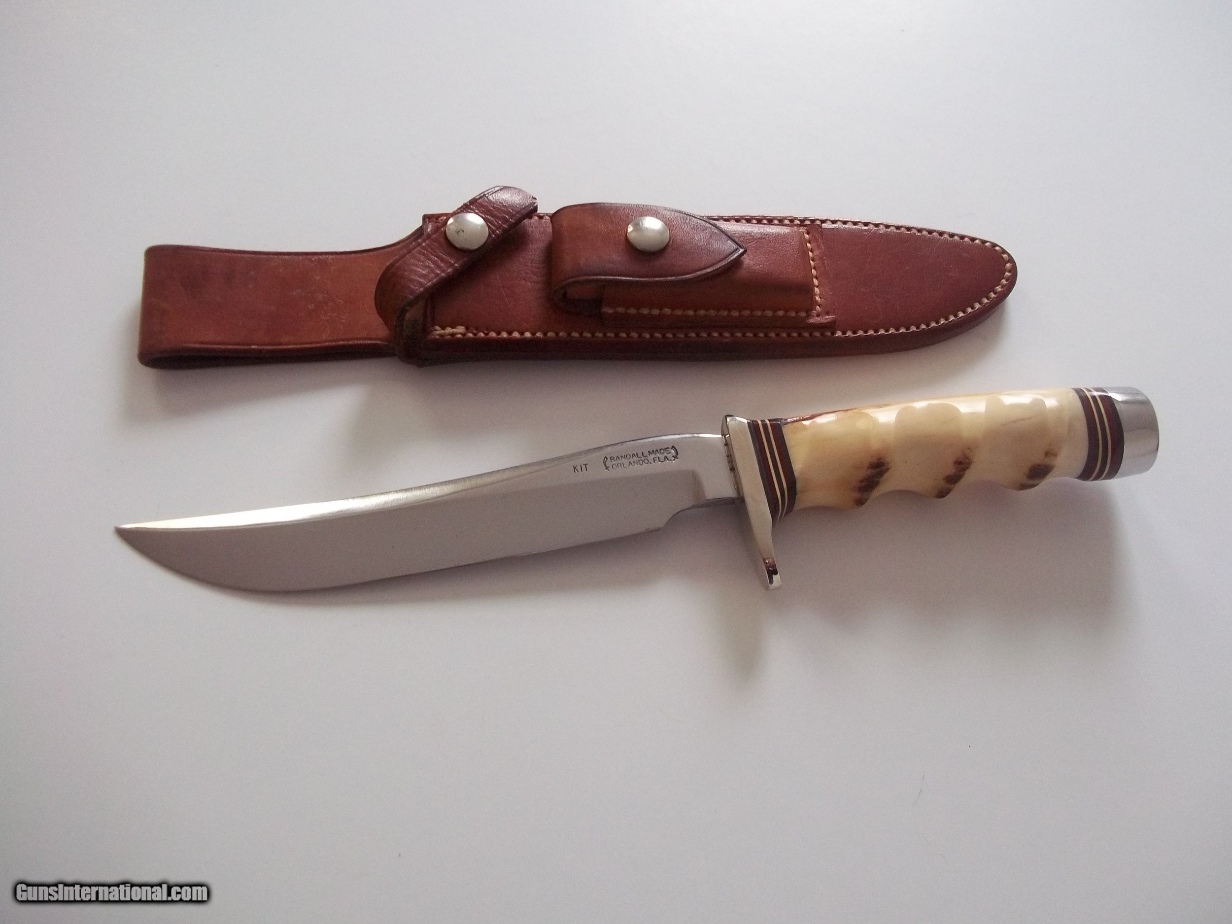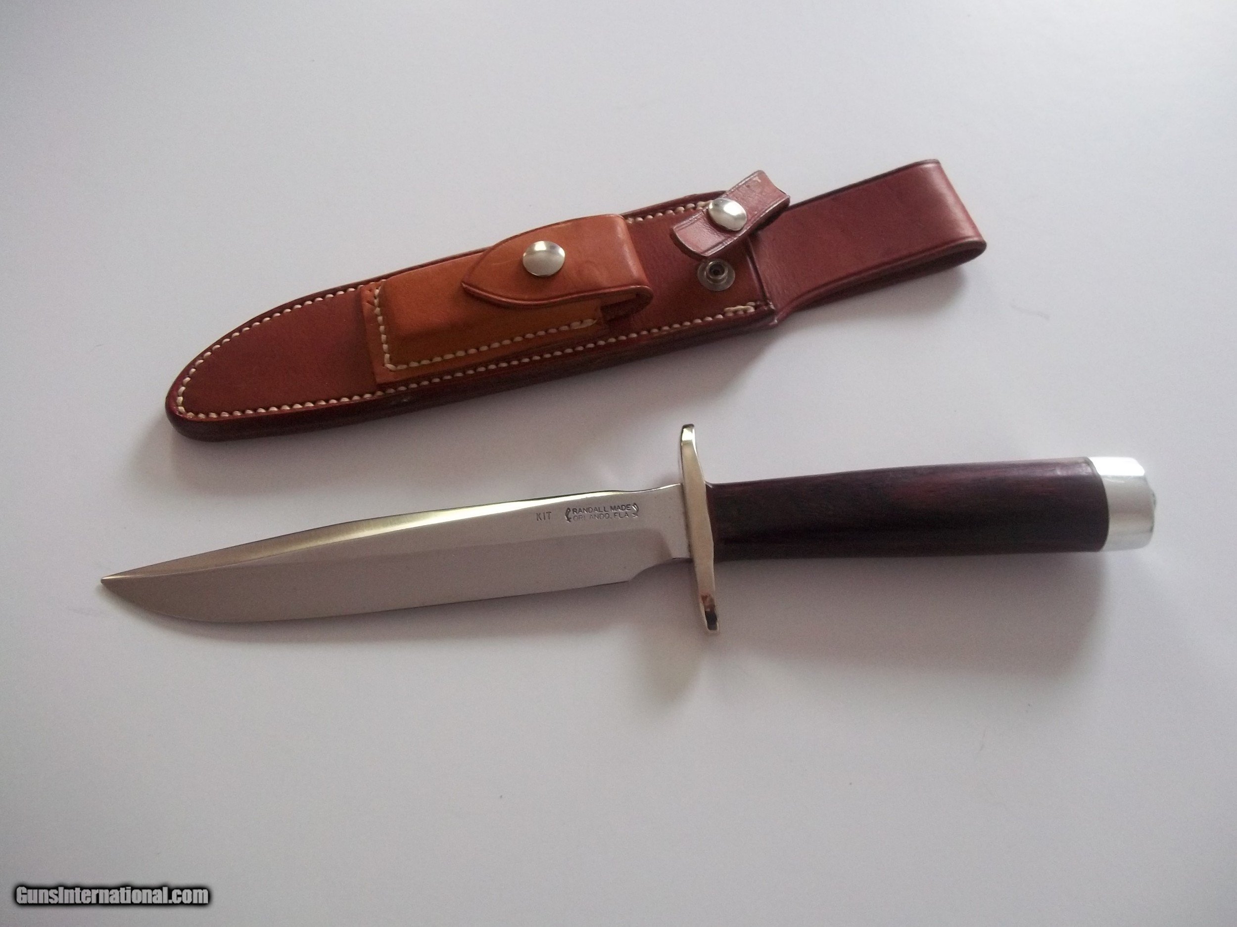 Description: Randall knives: Rare unique set of four ( 4 ) Randall "MAKE-IT-YOURSELF" "KITS" knives from February 1971. In the 50's, 60's and early 70's the Randall shop had a couple sheets of paper that listed "KITS" parts such as raw brass, wood, leather washers etc. Also, the unfinished blades were priced from and after heat- treat,rough ground to finished blades. Randall did not put the knives together except every once in a while they would solder on the guard. During various periods they left the blades plain (no kit etch) etched kit, or etch a customer's name with no etched.These are by far the nicest, flawless, spectacular models you'll ever encounter. Without a doubt these models can "rival," any knives made at the shop from that era. Great care was taken during the making and fitting of these "KITS" knives and all these factors are reflected in the five exquisite models you are seeing. Please pay much attention to the original pink-like sheet for further details about these "KITS" knives from Randall in pictures # 8,9,10 and # 11). The Model # 14 "Attack" with a Solingen-Made blade is NOT a "KIT" knife but still have a rare chrome plated blade. Note:These knives were made right before the shop stopped to stamped any knives with the Randall logo or trademark and the word "KIT" etched on the blade. There are two Model # 3's two Models # 1's and one Model # 14 Attack. Will preferably sold it as a set, however, each knife can be had separately for $1150.00 postpaid each regardless of your choice. Sold "AS IS." Randall "MAKE-IT-YOURSELF" KIT Model # 3-7 1/8" chrome plated carbon steel blade from 01 tool steel. The word "KIT" is etched on the left side of the Randall logo, German silver single guard, India Sambar stag handle with very deep finger grips, matching German silver butt cap (not a duralumin butt cap folks). The original scabbard was lost therefore there is a replacement Model # A . Because of the deep finger grips in the handle, this model offers incredible handling capabilities and a superb balance (knife balance right at the first grip when your index finger is placed there). The overall length is exactly 12". There are very few shinny silver-like spots on the right/ left side of the blade that can be seen in some of the pictures. Other than that it is a spectacular and stunning model. As with its counterparts (four others models) this is a February 1971 production . Extremely rare knife from another era. Knife sold "AS IS. Randall "MAKE-IT-YOURSELF" Model # 3-6" Hunter KIT model from 440-B stainless steel chrome plated blade, with the word KIT etched to the left of the Randall logo, German silver single guard, stag antler handle with very deep finger grips, wrist thong with the original leather lanyard still attached to such. February 1971 production.The large India Sambar stag handle is fashioned with a " flare" at the end which totally eliminated the use of a butt cap. Comes with the original brown rough back Johnson leather scabbard with the original white Arkansas sharpening stone in hone pocket. The workmanship, fitting of the guard where handle meets is perfect. This model is a real beauty. Sold "AS IS." Randall "MAKE-IT-YOURSELF" Model # 1-6" KIT All-Purpose Fighting Knife from 440-B stainless steel stock, large separate "S" with a chrome plated blade. The word "KIT is etched on the left side of the Randall logo, German silver double guard, black micarta handle with very deep finger grips, made in February 1971 .The workmanship, finish and general appearance is unsurpassed. This is a beauty of a flawless knife. All the listed "KIT" knives were obtained thru Dick Van Sickle Randall's largest dealer back then. Comes with the original black rough black Johnson leather scabbard and the original white Arkansas sharpening stone in hone pocket which is stamped on the back 12 6 . Randall "MAKE-IT-YOURSELF" KIT Model # 1-7" carbon steel blade etched with the word KIT on the left side of the Randall logo, German silver double guard, ebony handle, no check or crack, duralumin butt cap, this is the fourth model of a series of five. Original rough back Johnson brown leather scabbard with original white Arkansas sharpening stone in hone pocket. Overall length is exactly 12-3/8". Handle is a full 5-1/6" by itself allowing for tremendous handling capabilities and balance. Perfect job on the soldering of the German silver double guard. This is also a chrome plated blade, one can see very few silver-like specs on it, see picture # 1, 2 and 6. (refer to the listing for the model # 3-7" for further details). February 1971 production. Randall Model # Attack Solingen-made blade 7-5/16" with a chrome plated blade from 01 carbon tool steel stock, large brass double guard, Brazilian rosewood handle. The scabbard is a replacement as the original was lost and it is stamped on the back 2 8. The overall length is exactly 13". The handle is a full 5" in length and an inch thick at the end. Handle flares out so the need for a butt cap was eliminated. There is also a full distal taper of the handle from the end toward the guard making for one of the most comfortable and superb handling capabilities never seen on such model. This model is a February 1971 production. Knife is in an immaculate, pristine, new condition. Pictures # 12 and # 13 denotes an indentation or "cut-out" in the handle, this is not a flaw but a cleaver way to allow to place your finger therefore allowing for a better and more secure control of the weapon. The pink-like sheet with other seen info on catalog does not comes with the knife. SOLD |