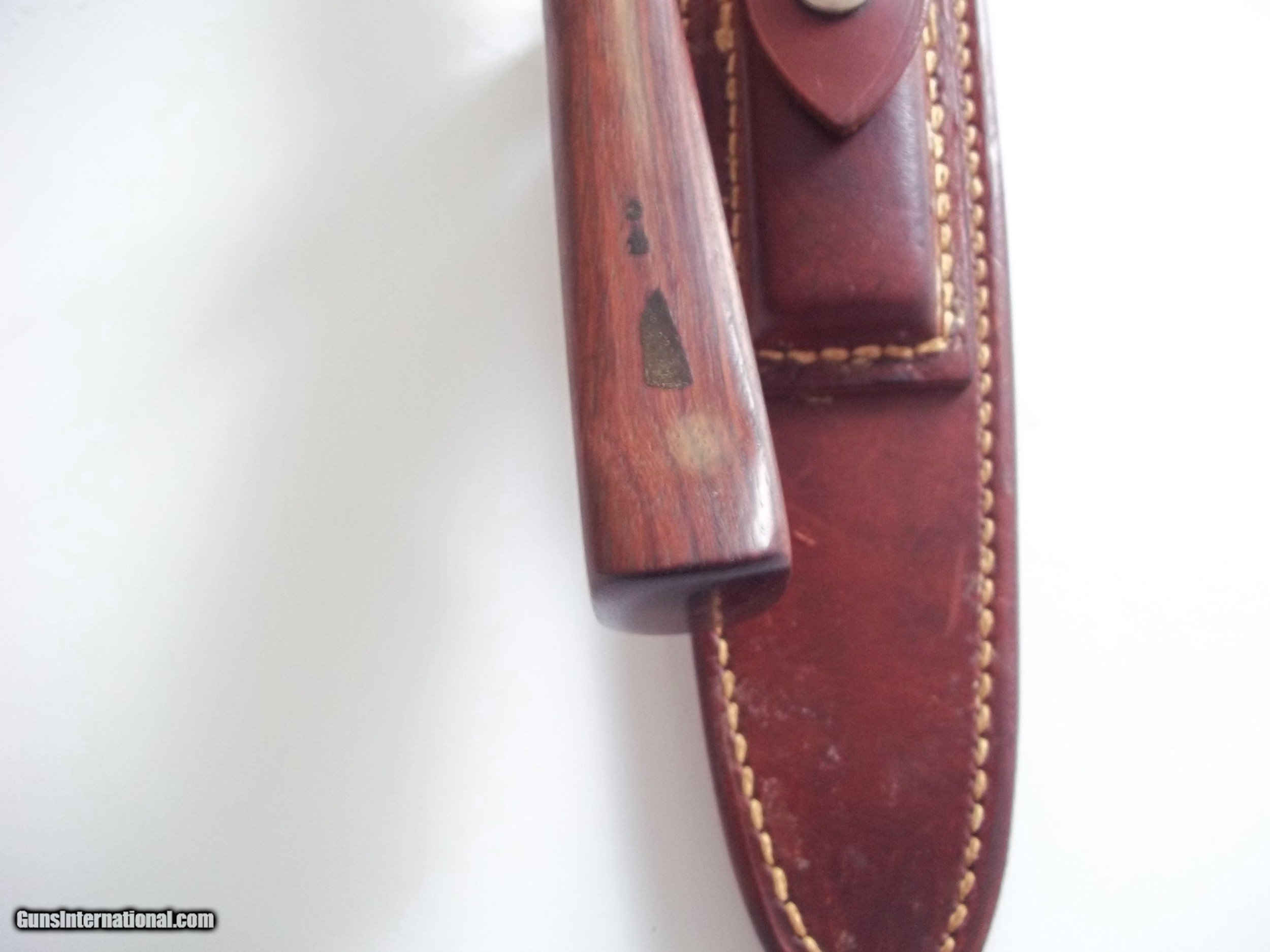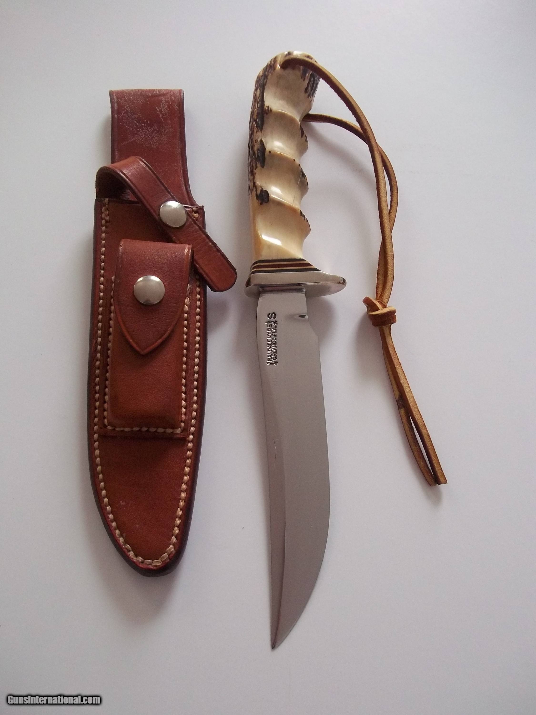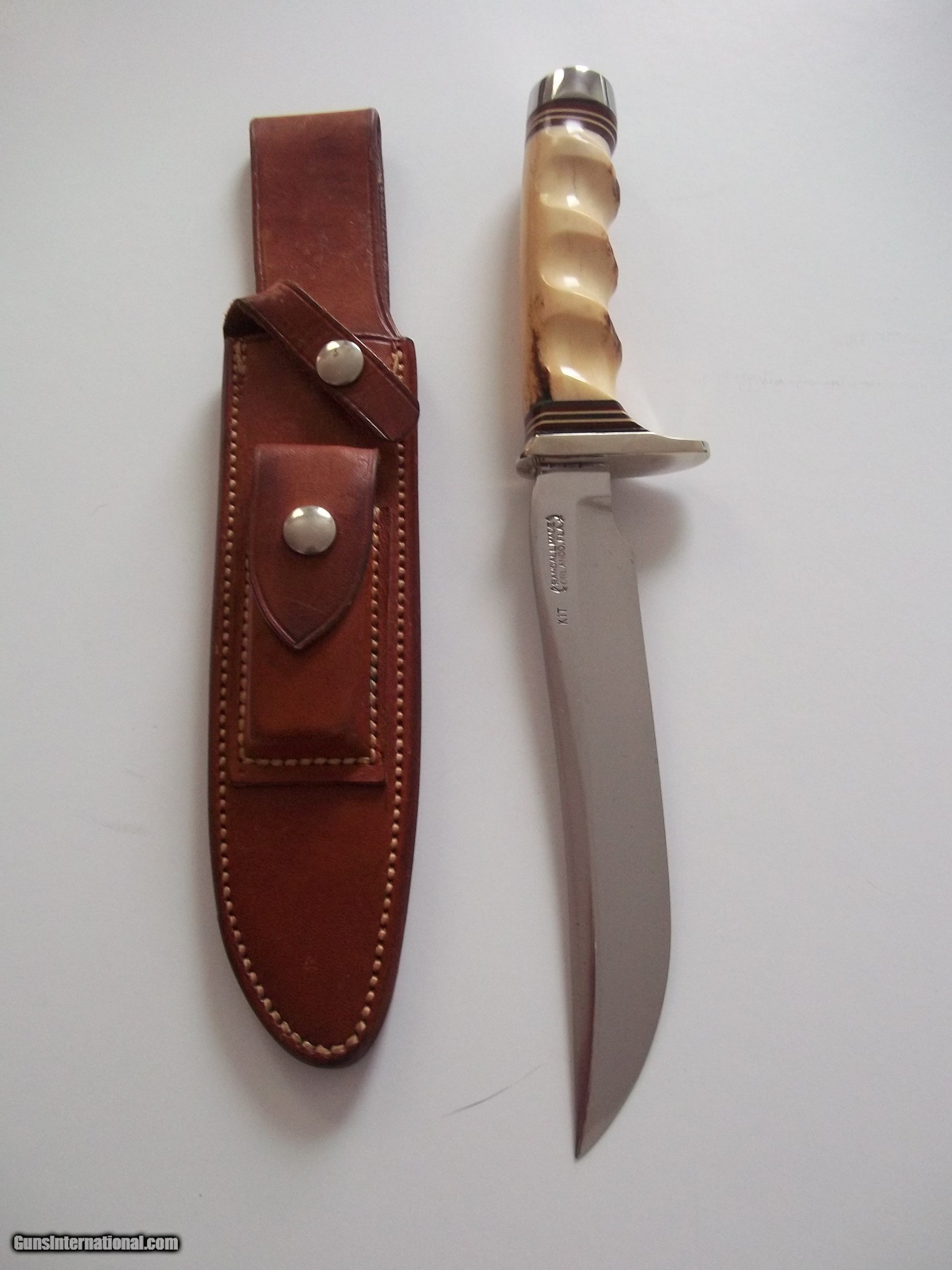 Description: Randall knives: Rare unique set of four ( 4 ) Randall "MAKE-IT-YOURSELF" "KITS" knives from February 1971. In the 50's, 60's and early 70's the Randall shop had a couple sheets of paper that listed "KITS" parts such as raw brass, wood, leather washers etc. Also, the unfinished blades were priced from and after heat- treat,rough ground to finished blades. Randall did not put the knives together except every once in a while they would solder on the guard. During various periods they left the blades plain (no kit etch) etched kit, or etch a customer's name with no etched.These are by far the nicest, flawless, spectacular models you'll ever encounter. Without a doubt these models can "rival," any knives made at the shop from that era. Great care was taken during the making and fitting of these "KITS" knives and all these factors are reflected in the five exquisite models you are seeing. Please pay much attention to the original pink-like sheet for further details about these "KITS" knives from Randall in pictures # 8,9,10 and # 11). The Model # 14 "Attack" with a Solingen-Made blade is NOT a "KIT" knife but still have a rare chrome plated blade. Note:These knives were made right before the shop stopped to stamped any knives with the Randall logo or trademark and the word "KIT" etched on the blade. There are two Model # 3's two Models # 1's and one Model # 14 Attack. Will preferably sold it as a set, however, each knife can be had separately for $1150.00 postpaid each regardless of your choice. Sold "AS IS." Randall "MAKE-IT-YOURSELF" KIT Model # 3-7 1/8" chrome plated carbon steel blade from 01 tool steel. The word "KIT" is etched on the left side of the Randall logo, German silver single guard, India Sambar stag handle with very deep finger grips, matching German silver butt cap (not a duralumin butt cap folks). The original scabbard was lost therefore there is a replacement Model # A . Because of the deep finger grips in the handle, this model offers incredible handling capabilities and a superb balance (knife balance right at the first grip when your index finger is placed there). The overall length is exactly 12". There are very few shinny silver-like spots on the right/ left side of the blade that can be seen in some of the pictures. Other than that it is a spectacular and stunning model. As with its counterparts (four others models) this is a February 1971 production . Extremely rare knife from another era. Knife sold "AS IS. Randall "MAKE-IT-YOURSELF" Model # 3-6" Hunter KIT model from 440-B stainless steel chrome plated blade, with the word KIT etched to the left of the Randall logo, German silver single guard, stag antler handle with very deep finger grips, wrist thong with the original leather lanyard still attached to such. February 1971 production.The large India Sambar stag handle is fashioned with a " flare" at the end which totally eliminated the use of a butt cap. Comes with the original brown rough back Johnson leather scabbard with the original white Arkansas sharpening stone in hone pocket. The workmanship, fitting of the guard where handle meets is perfect. This model is a real beauty. Sold "AS IS." Randall "MAKE-IT-YOURSELF" Model # 1-6" KIT All-Purpose Fighting Knife from 440-B stainless steel stock, large separate "S" with a chrome plated blade. The word "KIT is etched on the left side of the Randall logo, German silver double guard, black micarta handle with very deep finger grips, made in February 1971 .The workmanship, finish and general appearance is unsurpassed. This is a beauty of a flawless knife. All the listed "KIT" knives were obtained thru Dick Van Sickle Randall's largest dealer back then. Comes with the original black rough black Johnson leather scabbard and the original white Arkansas sharpening stone in hone pocket which is stamped on the back 12 6 . Randall "MAKE-IT-YOURSELF" KIT Model # 1-7" carbon steel blade etched with the word KIT on the left side of the Randall logo, German silver double guard, ebony handle, no check or crack, duralumin butt cap, this is the fourth model of a series of five. Original rough back Johnson brown leather scabbard with original white Arkansas sharpening stone in hone pocket. Overall length is exactly 12-3/8". Handle is a full 5-1/6" by itself allowing for tremendous handling capabilities and balance. Perfect job on the soldering of the German silver double guard. This is also a chrome plated blade, one can see very few silver-like specs on it, see picture # 1, 2 and 6. (refer to the listing for the model # 3-7" for further details). February 1971 production. Randall Model # Attack Solingen-made blade 7-5/16" with a chrome plated blade from 01 carbon tool steel stock, large brass double guard, Brazilian rosewood handle. The scabbard is a replacement as the original was lost and it is stamped on the back 2 8. The overall length is exactly 13". The handle is a full 5" in length and an inch thick at the end. Handle flares out so the need for a butt cap was eliminated. There is also a full distal taper of the handle from the end toward the guard making for one of the most comfortable and superb handling capabilities never seen on such model. This model is a February 1971 production. Knife is in an immaculate, pristine, new condition. Pictures # 12 and # 13 denotes an indentation or "cut-out" in the handle, this is not a flaw but a cleaver way to allow to place your finger therefore allowing for a better and more secure control of the weapon. The pink-like sheet with other seen info on catalog does not comes with the knife. SOLD |