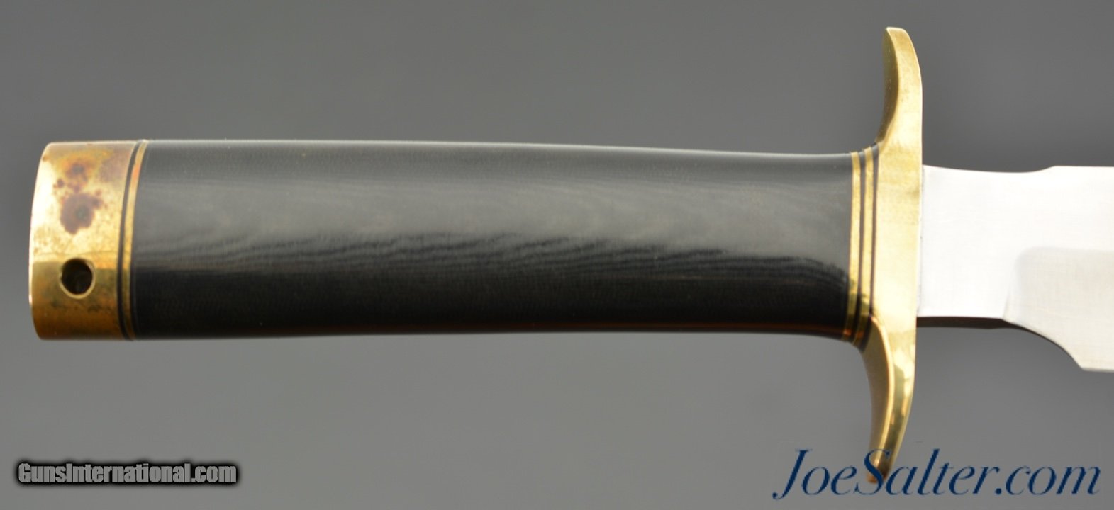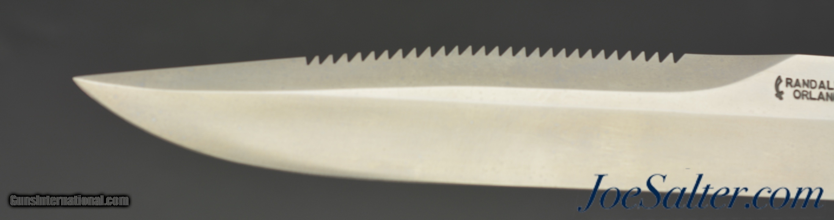 Description: Randall Made Model 1 All Purpose Fighting Knife with 5 options, serrated top edge, brass butt cap, lanyard hole, name plate and stainless blade. This knife has a 7 inch, excellent condition, unsharpened blade with 3 inches of single row serration, 1 3/4" sharpened top edge, a brass double finger guard with moderate age coloring and wear, from contact with the sheath and a set of black Micarta handle, with an un-used nameplate. The brass butt cap has some discoloration and oxidation which would need polish and a lanyard hole. Comes with a single stitched Randall sheath #7 with a new stone, shows almost no signs of use with only minor scuffs from the knife. Total Length 11 3/4 inches. SOLD |
