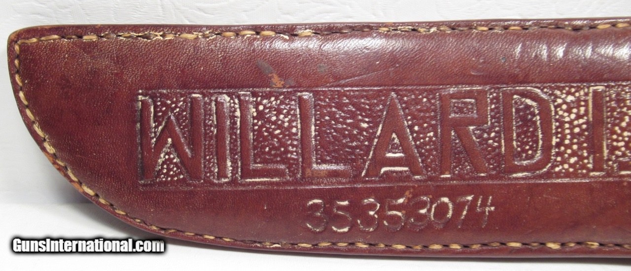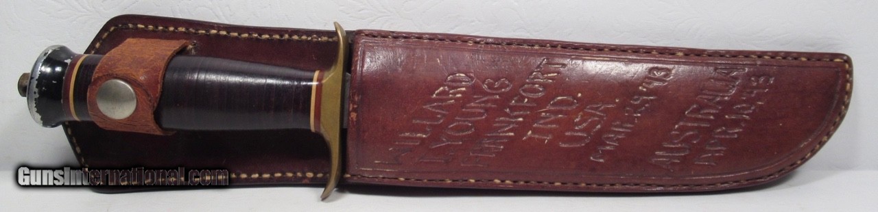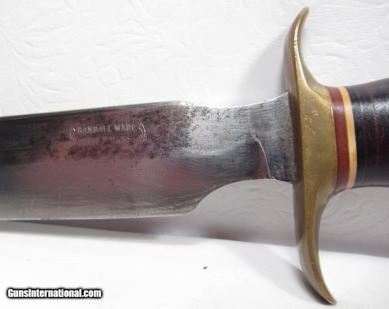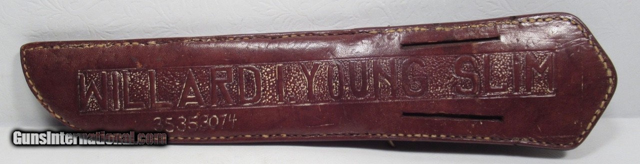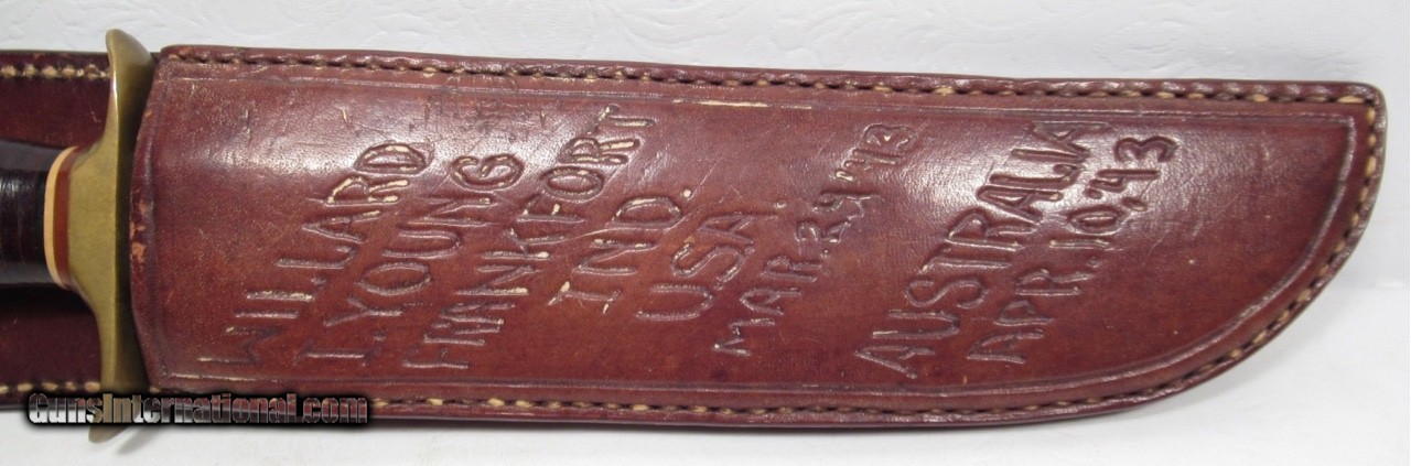 Description: Randall Model 1 WWII Era Knife; 8” Blade with Neat Sheath; Springfield Mass. Made; Identified to Warrant Officer Willard I. “Slim” Young from Frankfort Indiana; Service #35353074; Enlisted May 5, 1942; Prior occupation was Shoemaker & Shoe repairman; Thus the Great Work on Sheath; Price Includes Insured Shipping; SOLD |