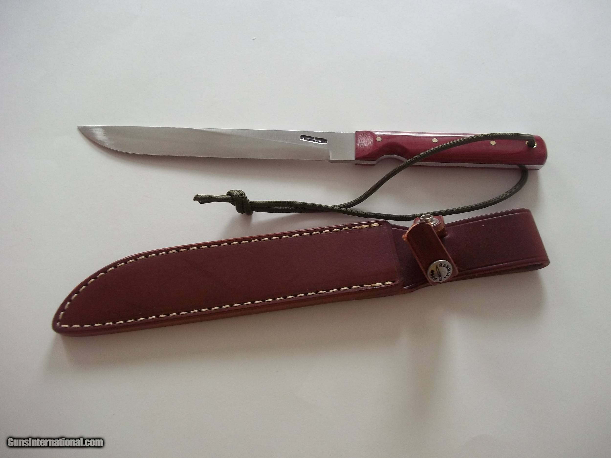 Description: Randall Model # 10-7" Salt Fisherman and Household Utility from 440-B stainless steel stock, offered in its purest form with a gorgeous red micarta handle, thumb nothches on top of blade, wrist thong. Free shipping USPS with tracking number US only. Brand new, immaculate , pristine condition knife. Contained in original beautiful brown leather scabbard. SOLD |