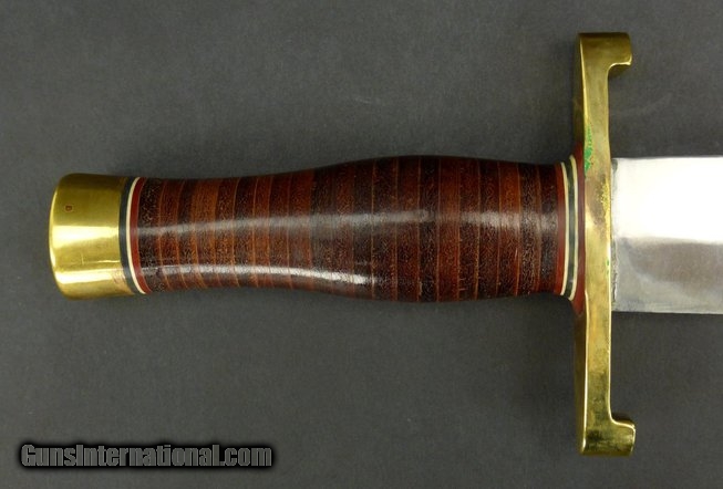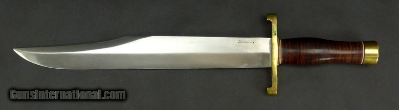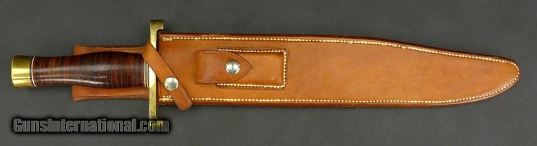 Description: Randall Model 12 Raymond Thorpe Bowie. 13” blade with sharpened top cutting edge, brass lugged hilt, leather commando handle, and brown leather sheath. SOLD |