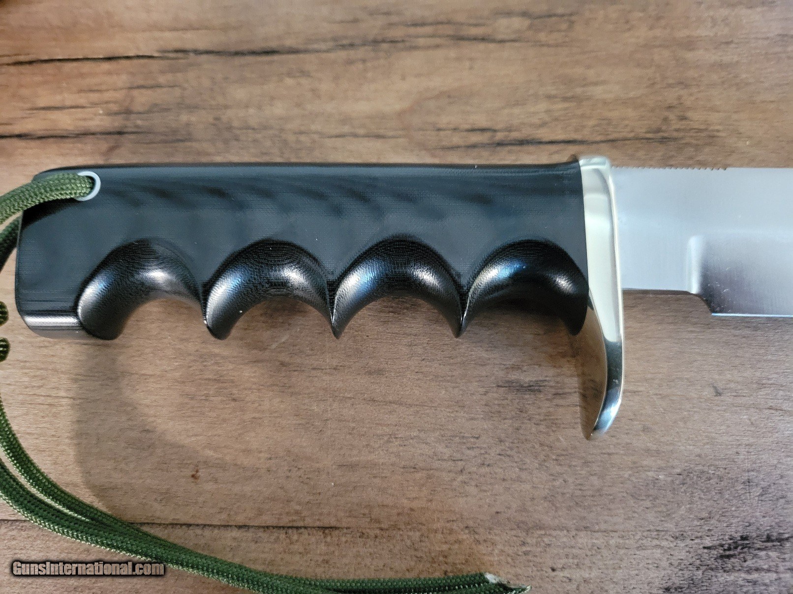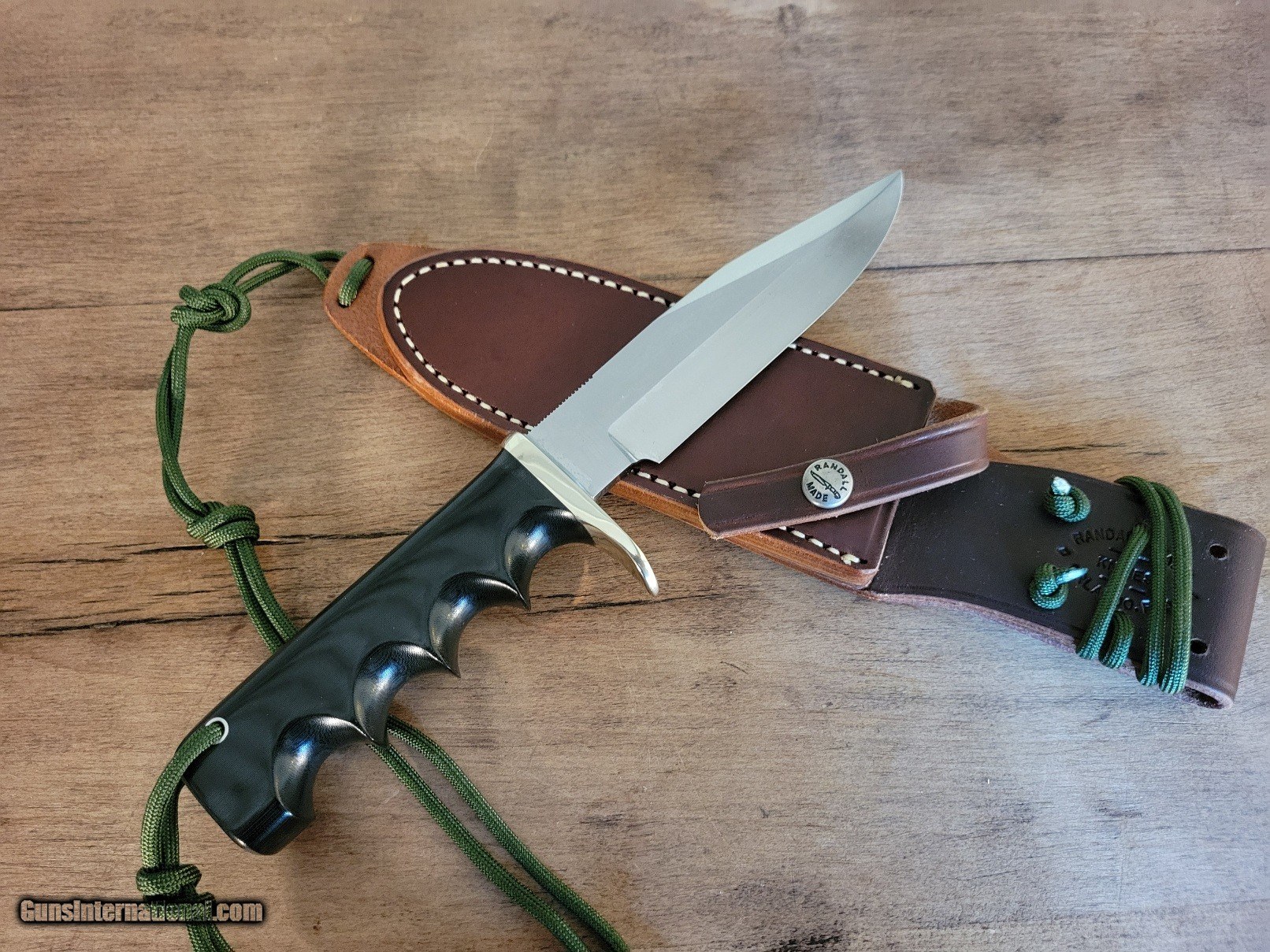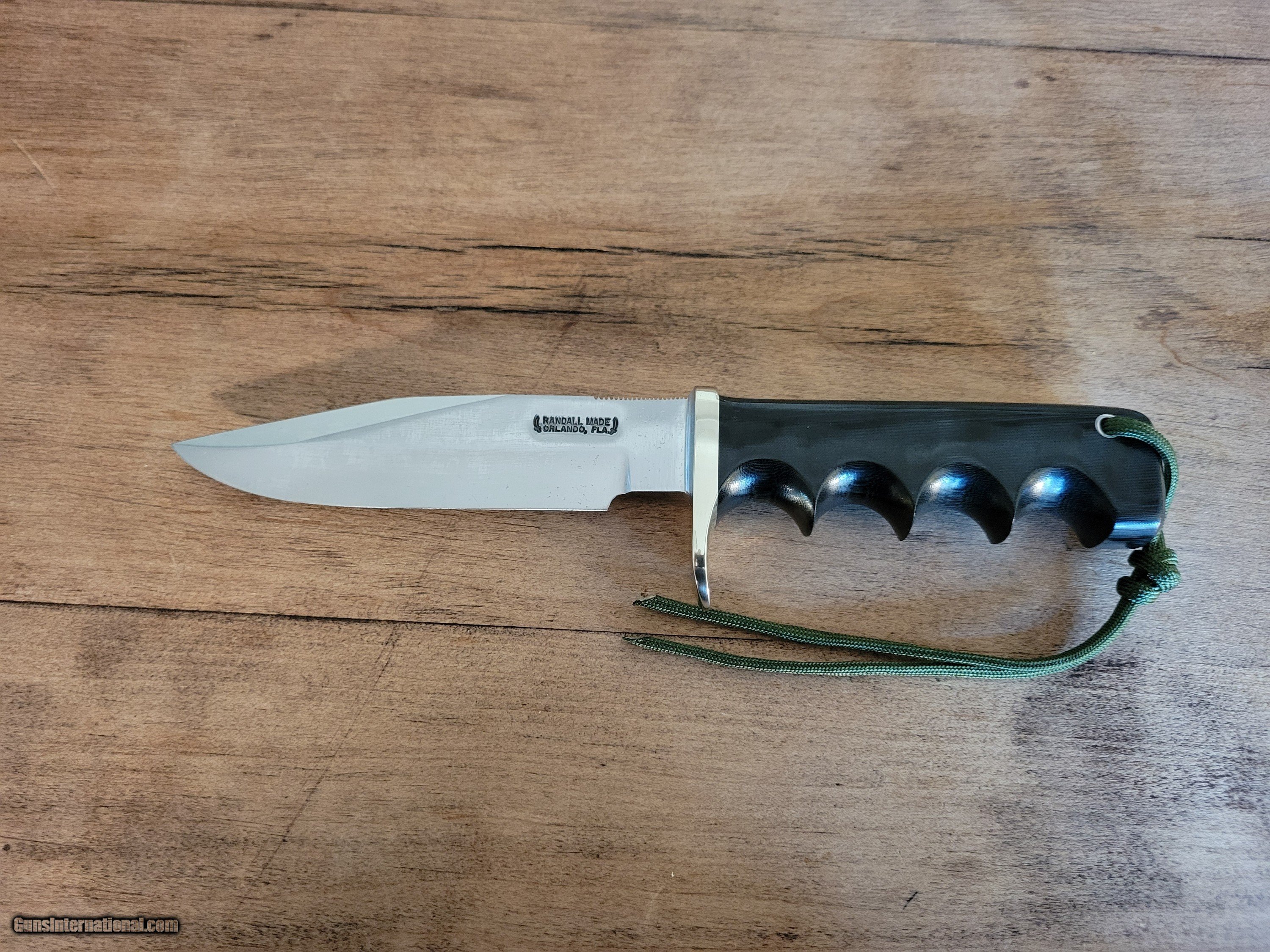Description: Fresh from the Randall shop in Orlando a custom model 15 Airman knife. 5.5" tool steel blade, single nickel silver guard, finger groove black polished micarta handle with thong hole, no-hone pouch special order Model “C” sheath.knife has factory oil fresh on blade, has cut only air and has never been sheathed. Shipping will be $20 USPS. SOLD |