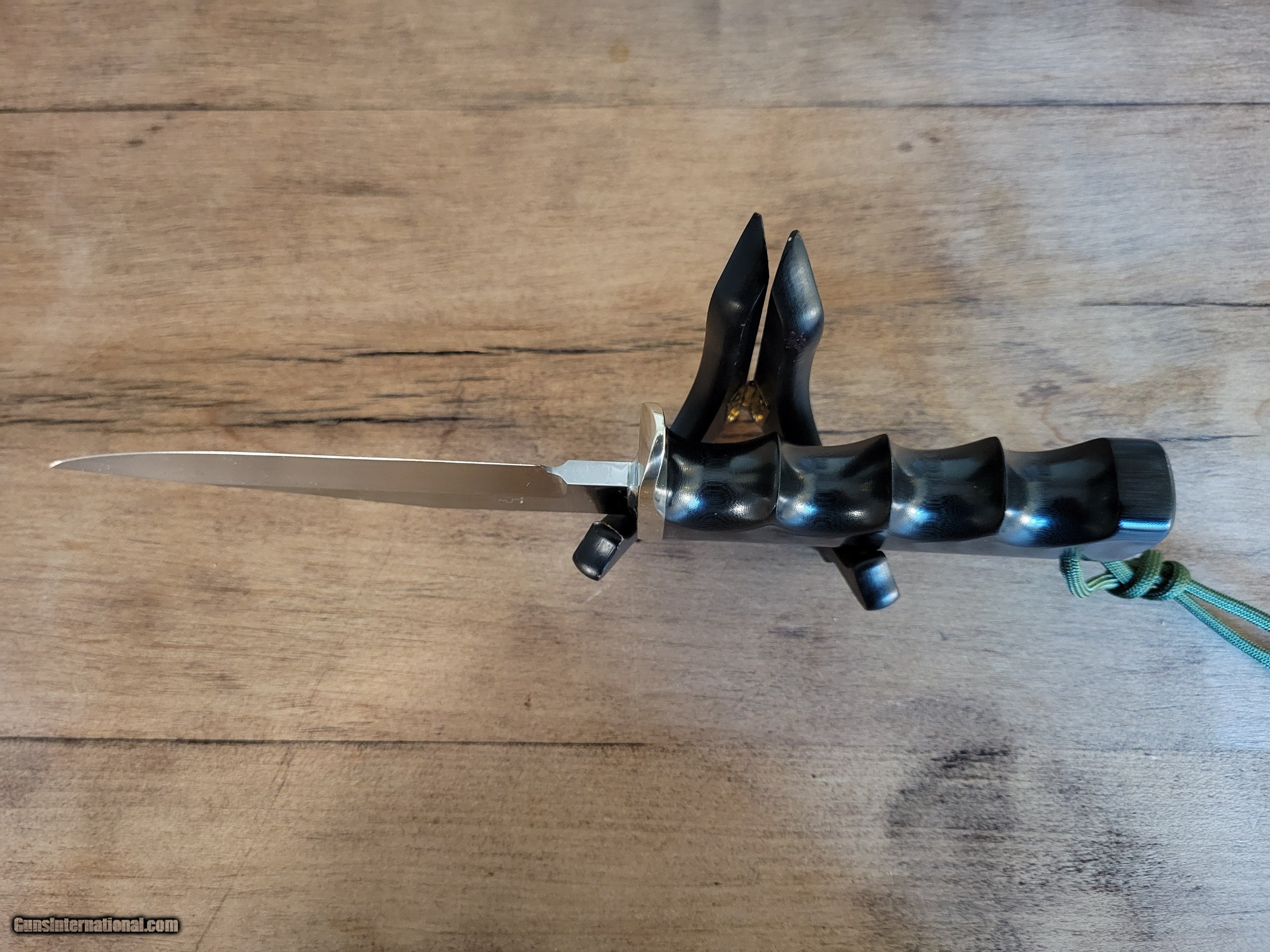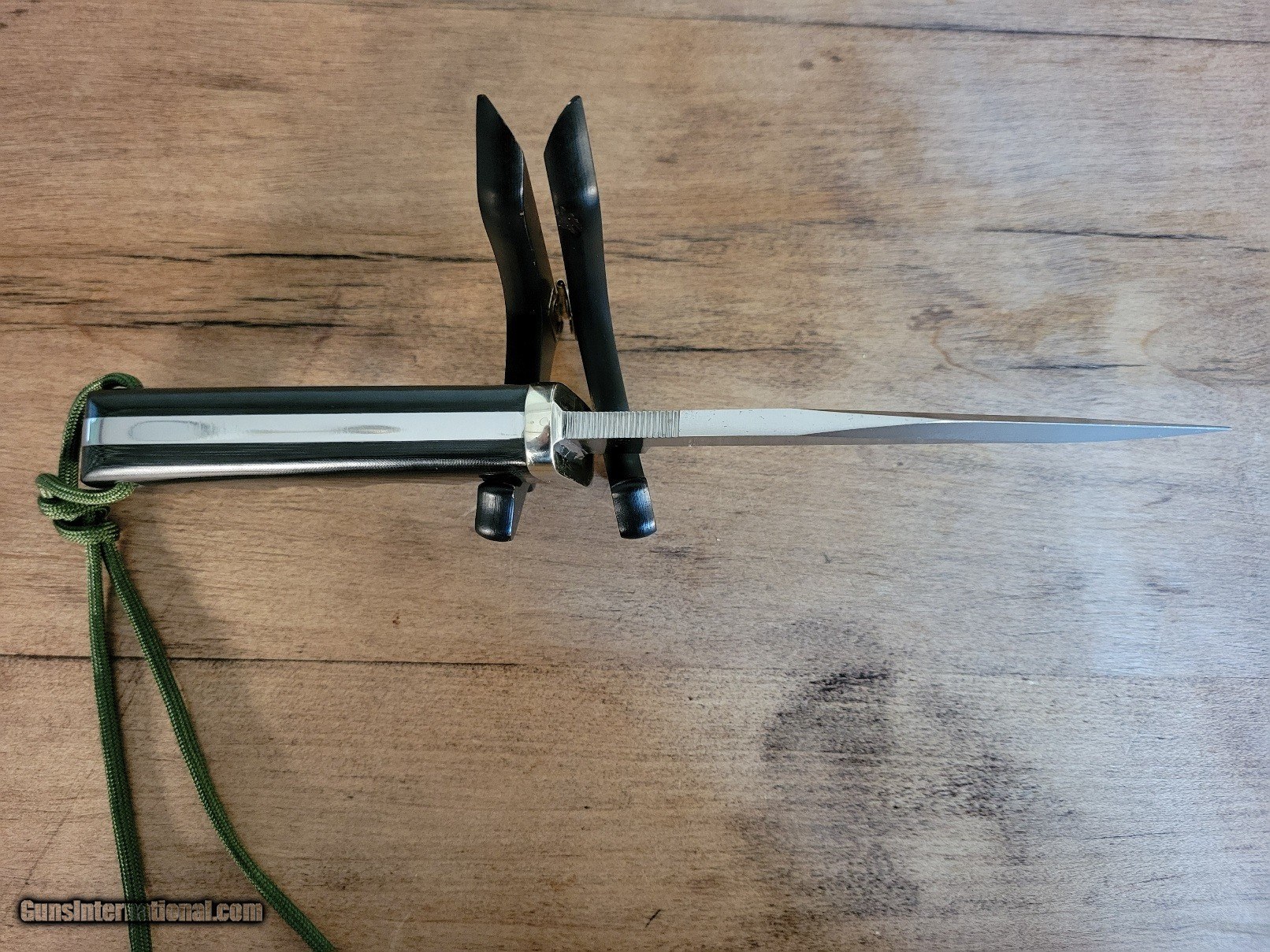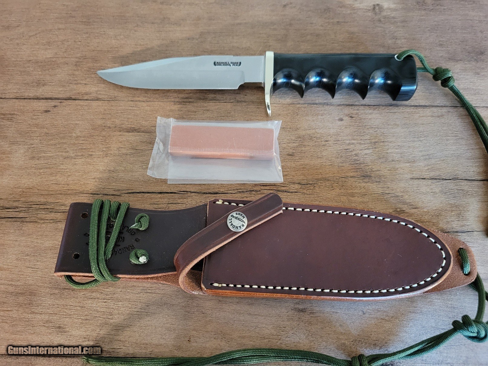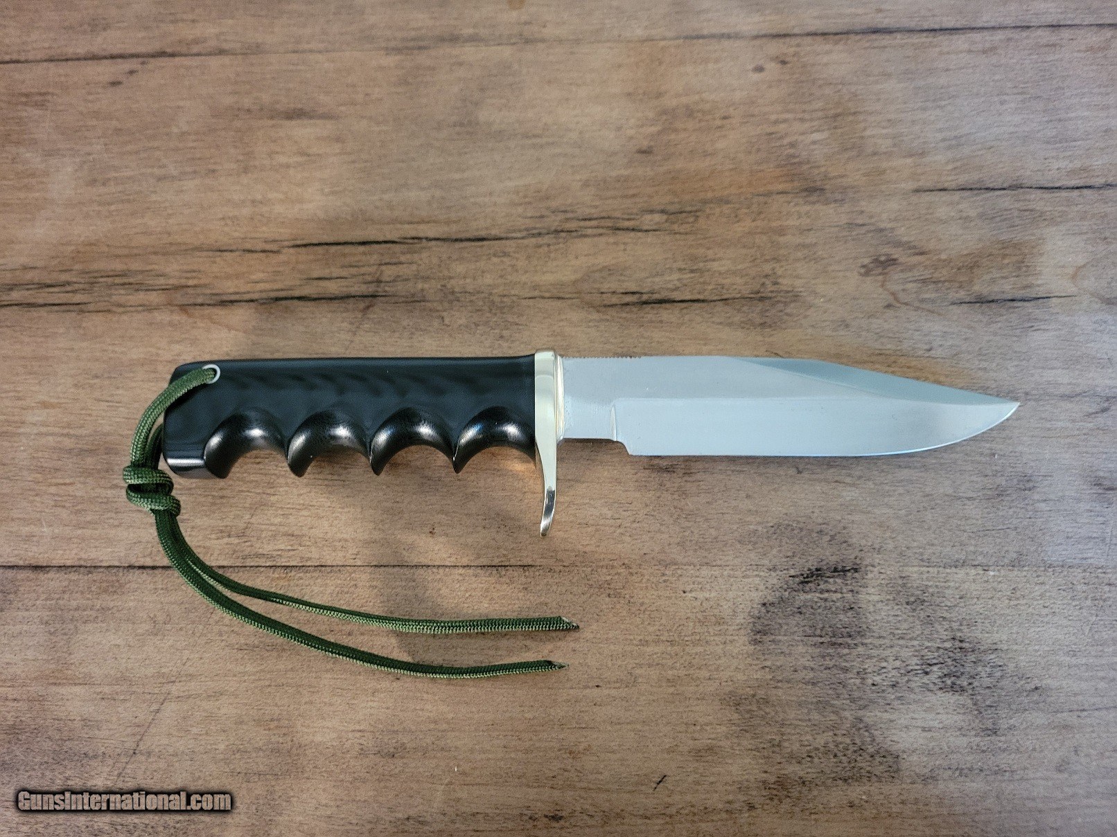 Description: Fresh from the Randall shop in Orlando a custom model 15 Airman knife. 5.5" tool steel blade, single nickel silver guard, finger groove black polished micarta handle with thong hole, no-hone pouch special order Model “C” sheath.knife has factory oil fresh on blade, has cut only air and has never been sheathed. Shipping will be $20 USPS. SOLD |