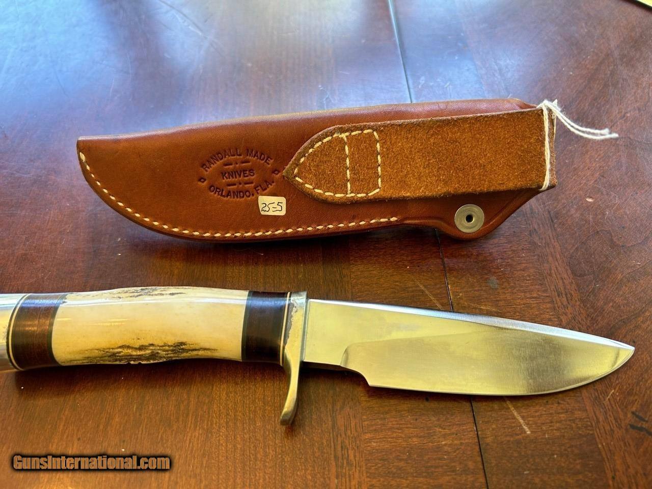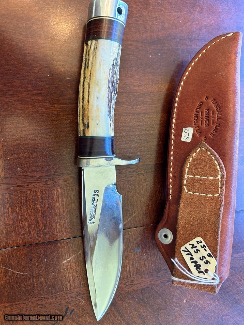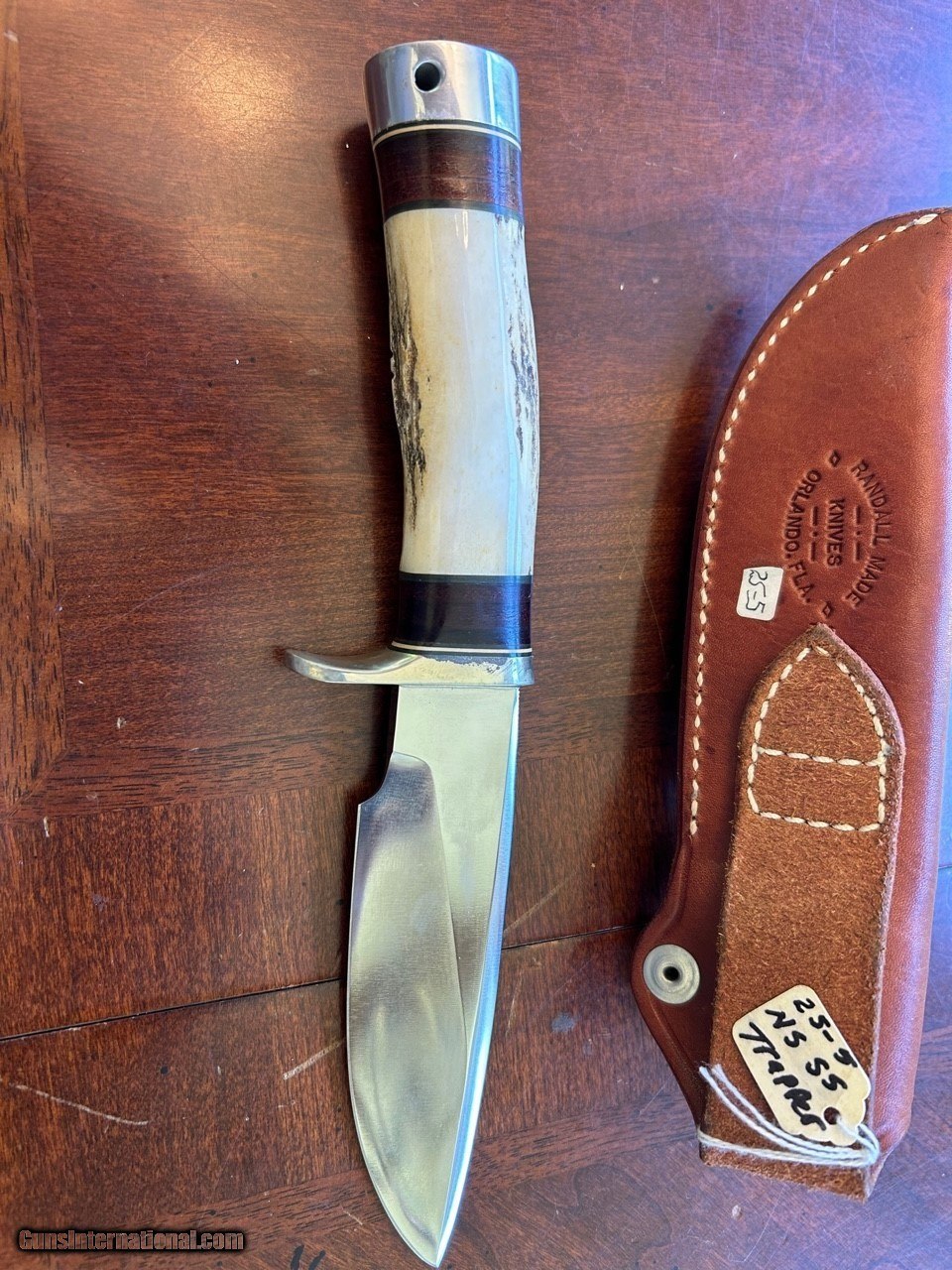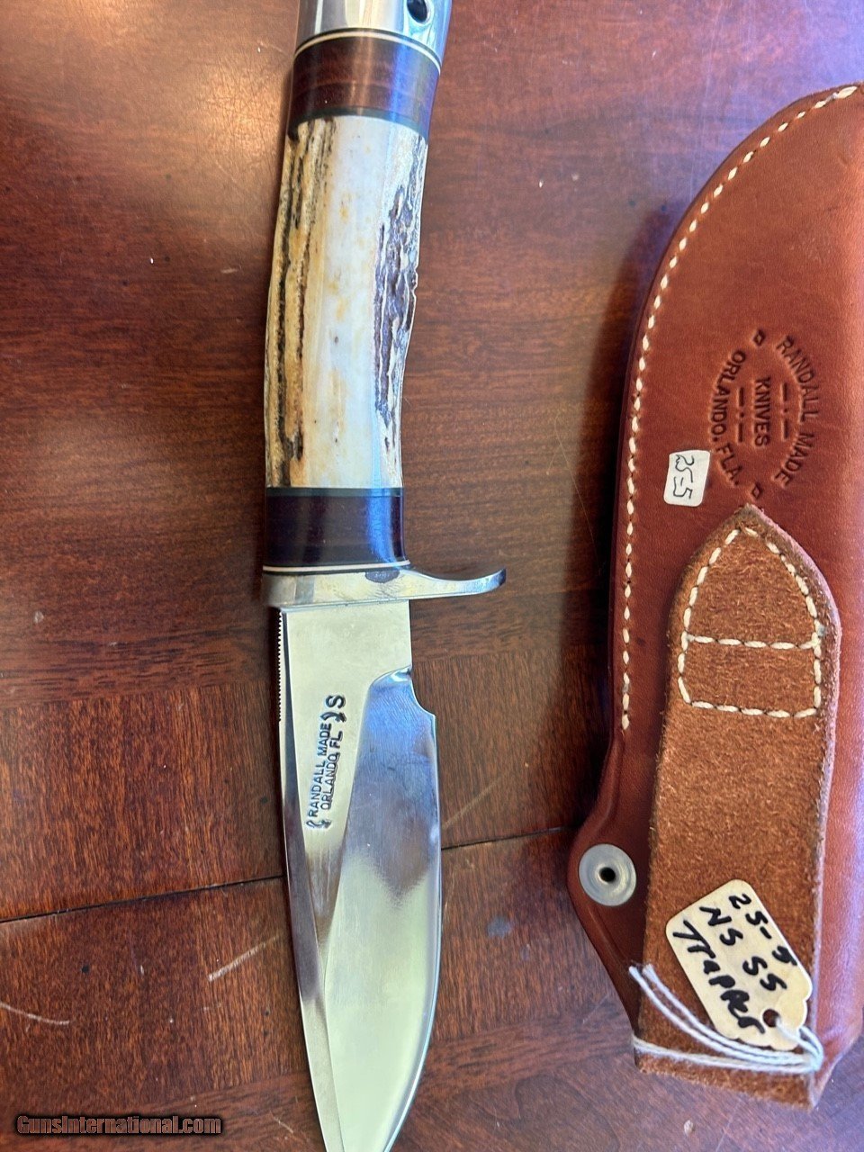 Description: Sold to Scott B. // Randall Model 25-5 Trapper NEW w/Sheath - 5″ blade of 1/4″ stock. Drop point hunter-style knife, similar to Model #11. Handle construction is reminiscent of a 1930’s design. Thumb notches and top of hilt molded for thumb placement. Nickel silver single hilt. Approximately 4 3/8″ – 4 1/2″ handle of leather/stag/leather. Extra Features: stainless steel blade, wrist thong. Model 25-5″ supplied with a cover sheath. Excellent skinning and outdoor knife. Can ship directly to you. You can use a credit card but we have to add the 3% fee. Shipping is 20$, via FedEx. Strength and Honor! SOLD |