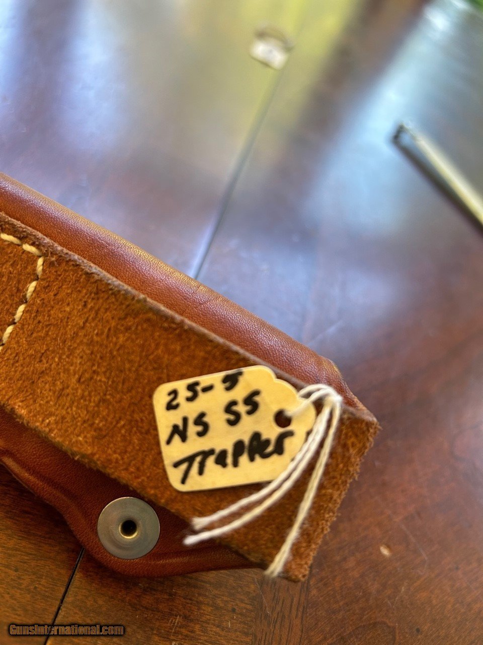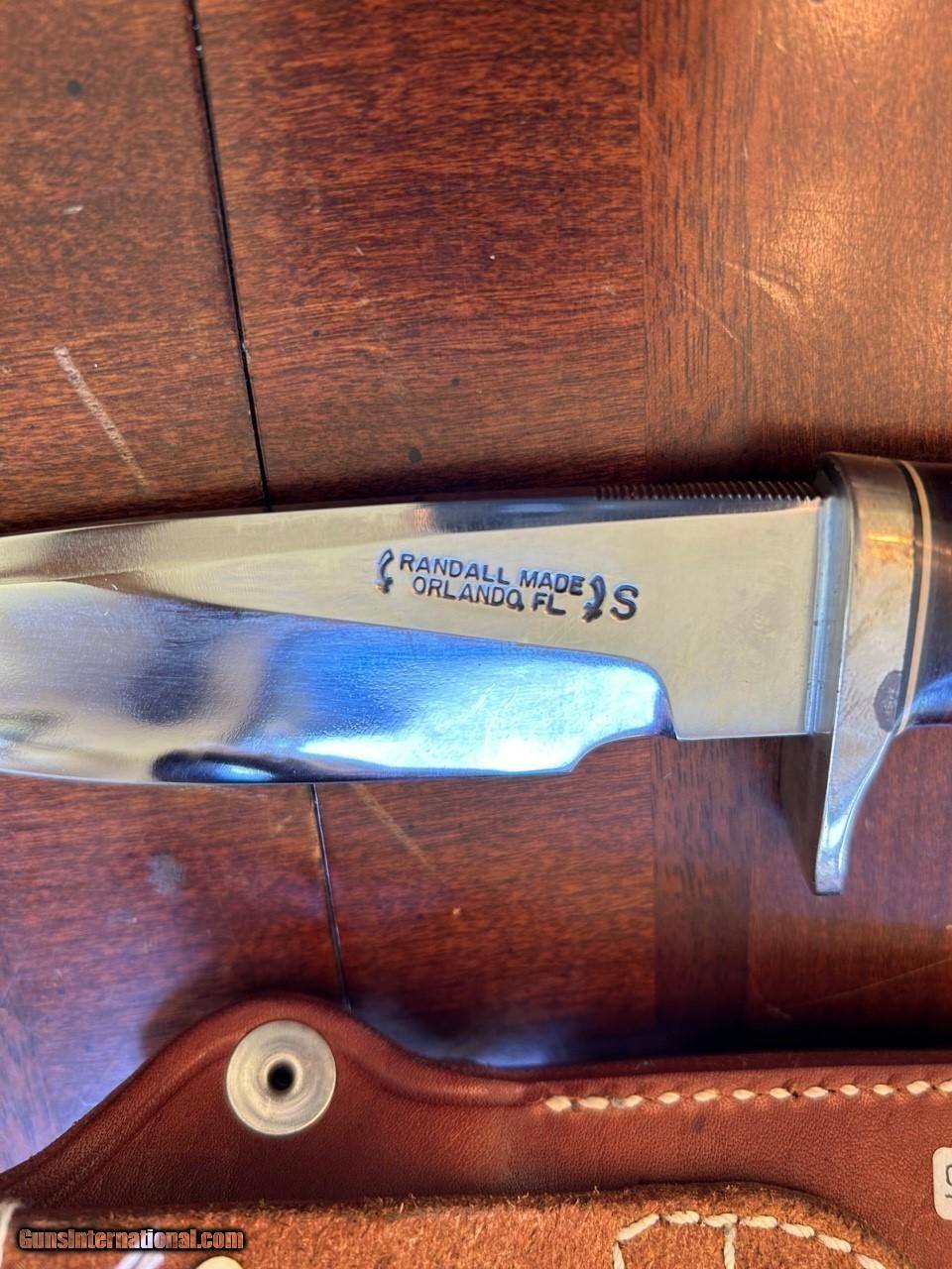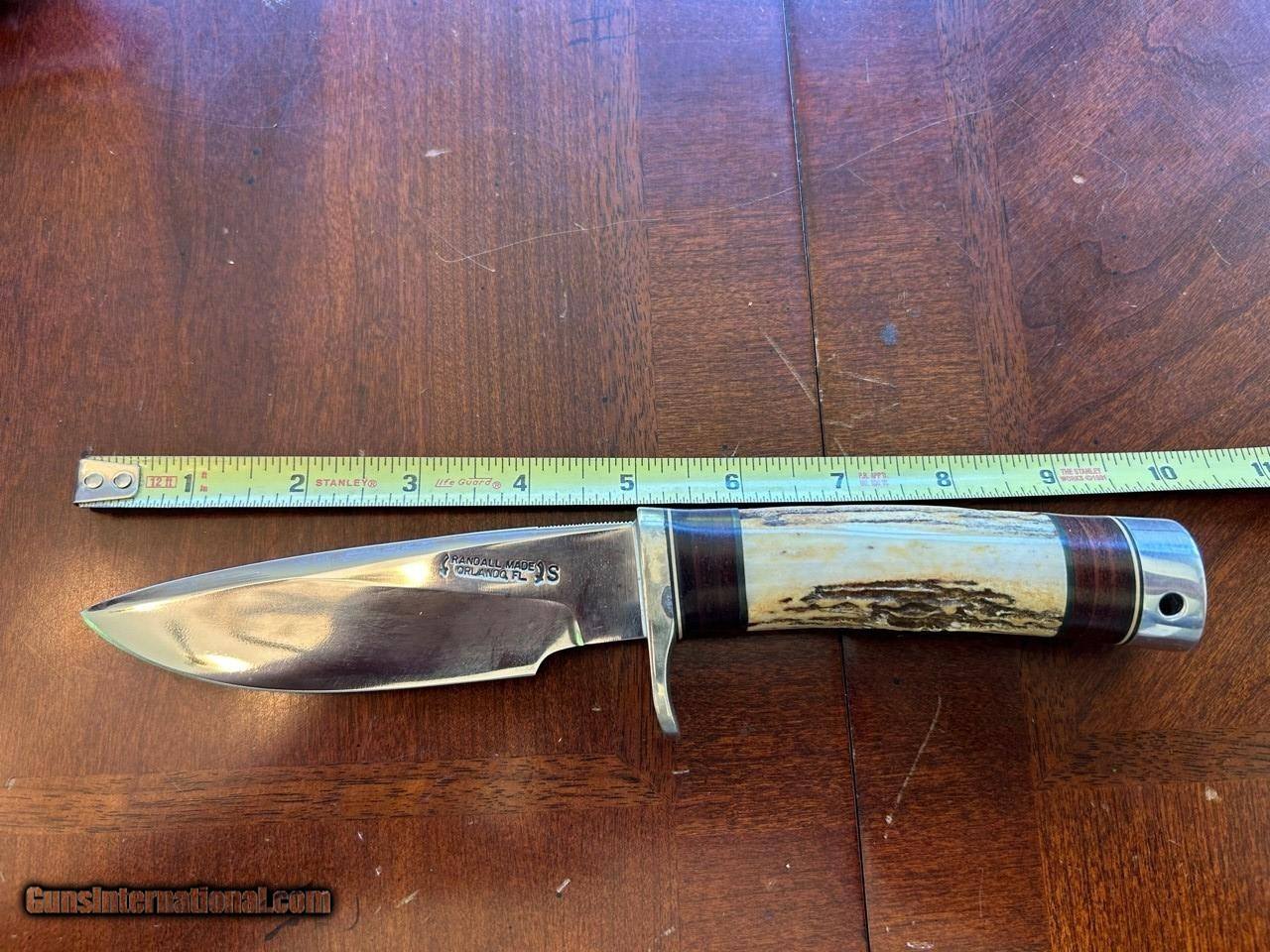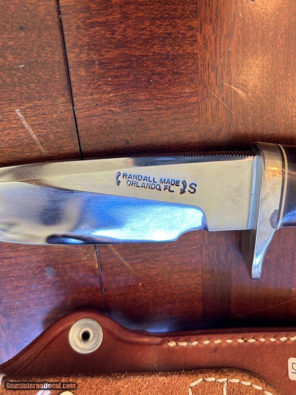 Description: Sold to Scott B. // Randall Model 25-5 Trapper NEW w/Sheath - 5″ blade of 1/4″ stock. Drop point hunter-style knife, similar to Model #11. Handle construction is reminiscent of a 1930’s design. Thumb notches and top of hilt molded for thumb placement. Nickel silver single hilt. Approximately 4 3/8″ – 4 1/2″ handle of leather/stag/leather. Extra Features: stainless steel blade, wrist thong. Model 25-5″ supplied with a cover sheath. Excellent skinning and outdoor knife. Can ship directly to you. You can use a credit card but we have to add the 3% fee. Shipping is 20$, via FedEx. Strength and Honor! SOLD |