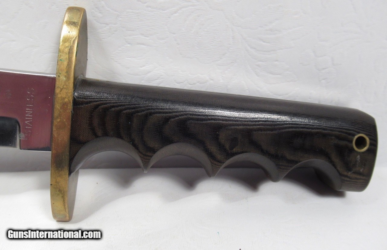 Description: Randall Made Knife (RMK) No. 15 “Airman”; Made Mid 1970’s toward end of Vietnam War Era; Black Micarta Handle; Stainless Steel 5 ¾” Blade with “Gary Ruckman” on right side of blade; Excellent Condition with Original Sheath & Stone; Price includes insured shipping; Attention Texas Buyers: We Must Collect 6.75% Sales Tax; SOLD |