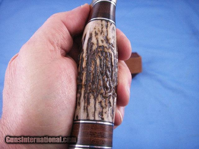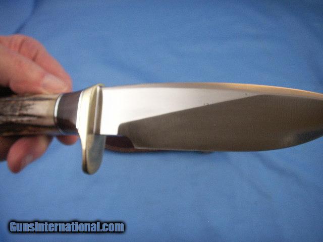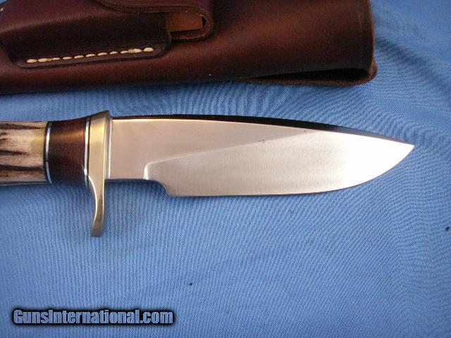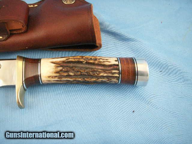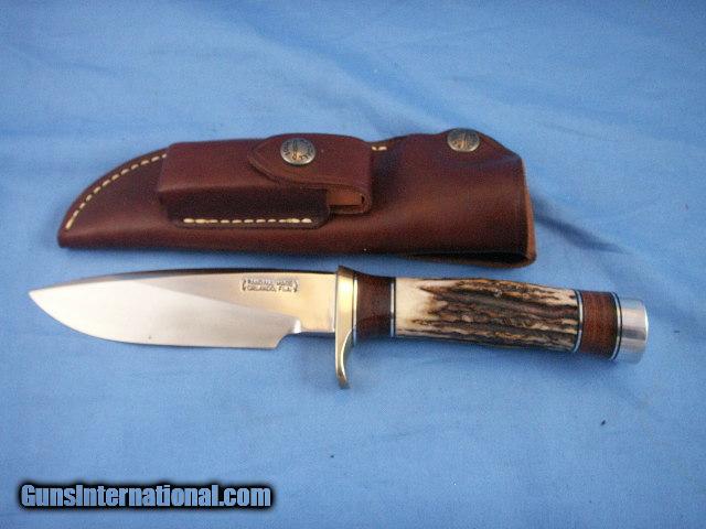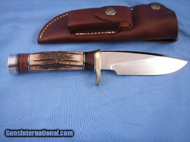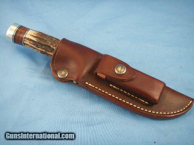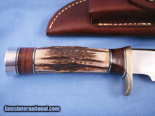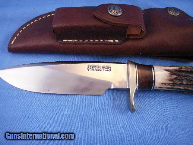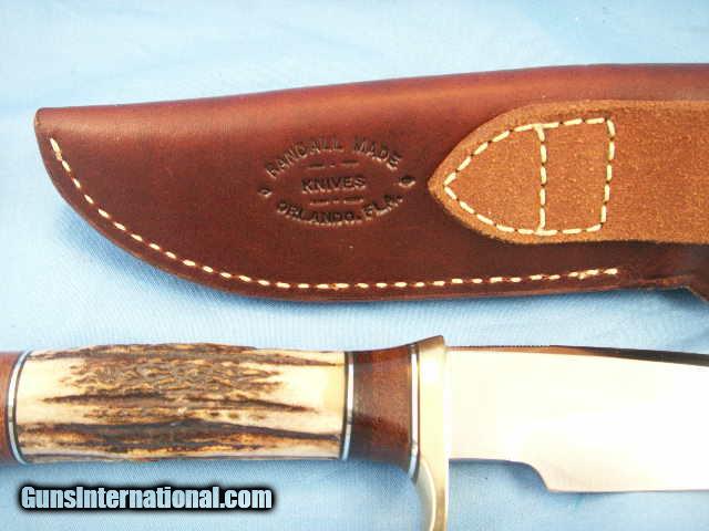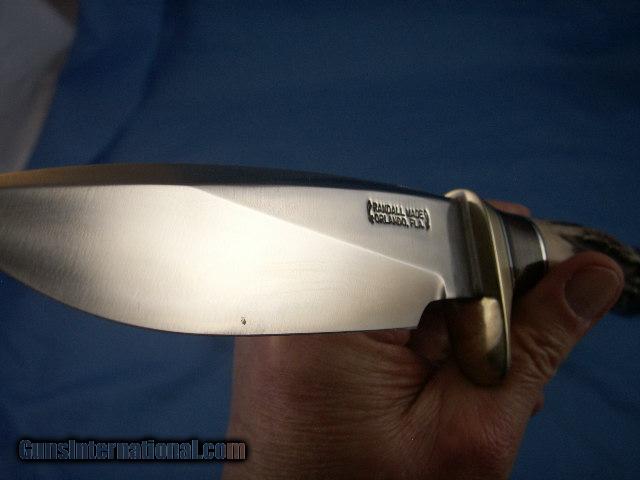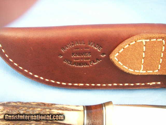 Description: SOLD PENDING FUNDS: For Sale: Randall number 25 "The Trapper" knife. It has a 5" blade made from imported .01 tool steel with thumb notches. The handle is India Stag sandwiched between red micarta and the hilt is brass. Duralumin butt cap. This drop point hunter is an excellent skinner/outdoors knife. SOLD |