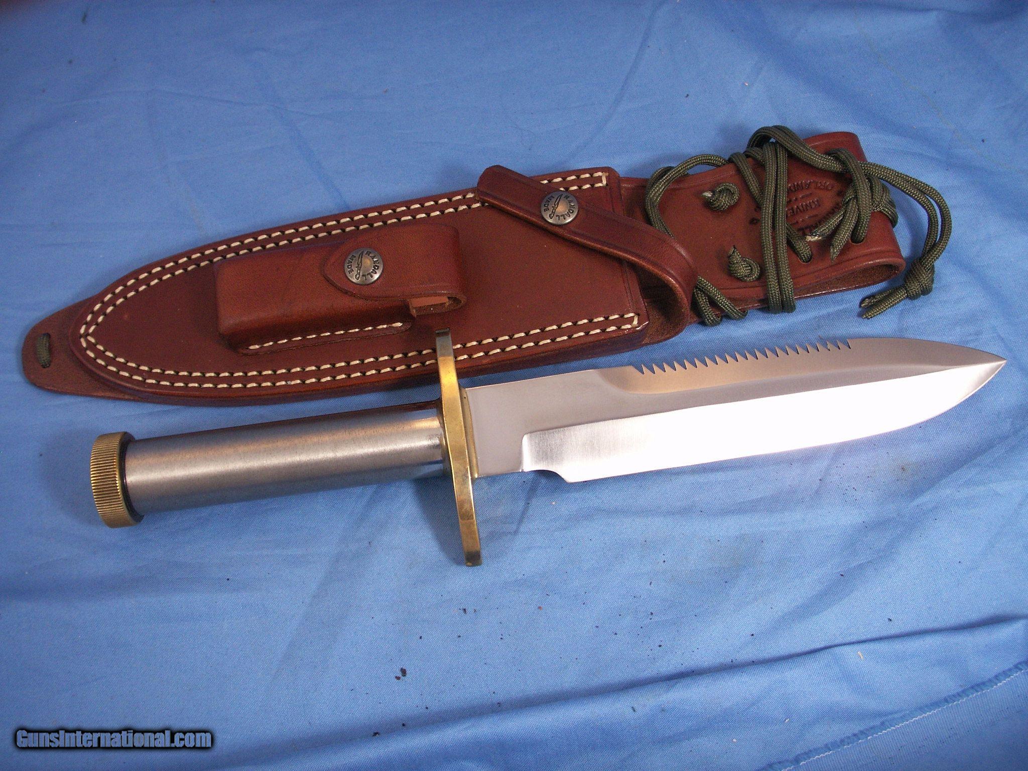 Description: SOLD PENDING FUNDS: As new Randall Model 18 Survival Knife with a 7 1/2" blade that has a sawtooth edge on top of the blade. It has a stainless steel tubular handle fitted with a removeable threaded brass butt cap and waterproof "O" ring. It has a brass hilt guard with holes in it to accomodate a wrist thong. Comes with Randall leather sheath, thong, and sharpening stone. SOLD |
