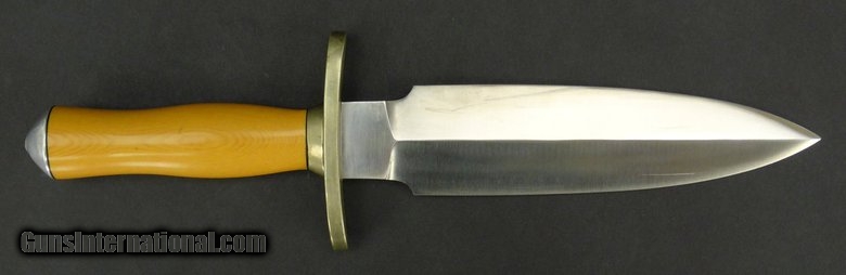 Description: Randall Tom Clinton Special. 7½” doubled edged dagger blade, yellow Micarta commando handle, polished nickel silver hilt, and brown leather sheath. SOLD |