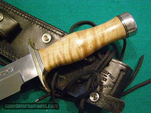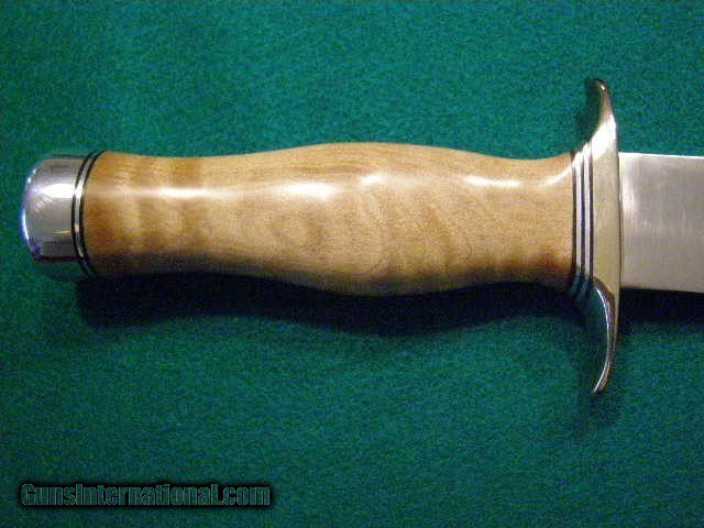 Description: Randall model #14 Attack loaded with extras in brand new unused excellent condition. This knife has a Tiger maple commando style handle with a stainless steel blade, Nickel Silver doudle hilt, Aluminum spacers and cap, and black sheath. The knife has never been inside the sheath. SOLD |