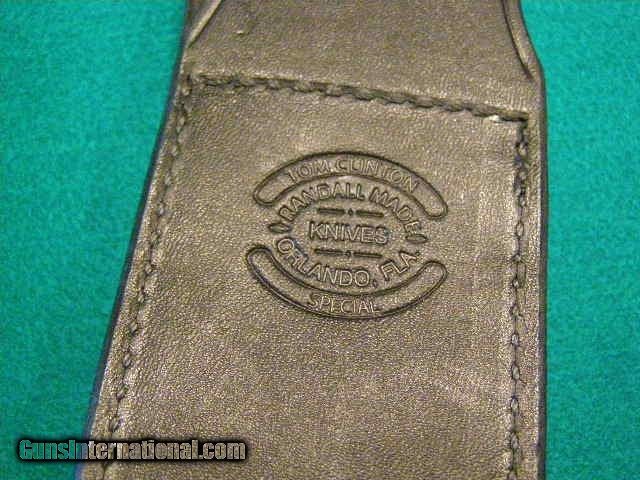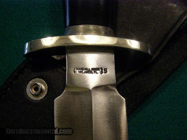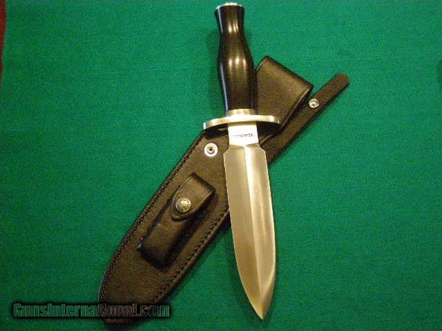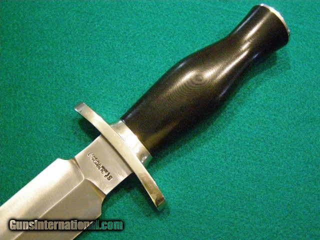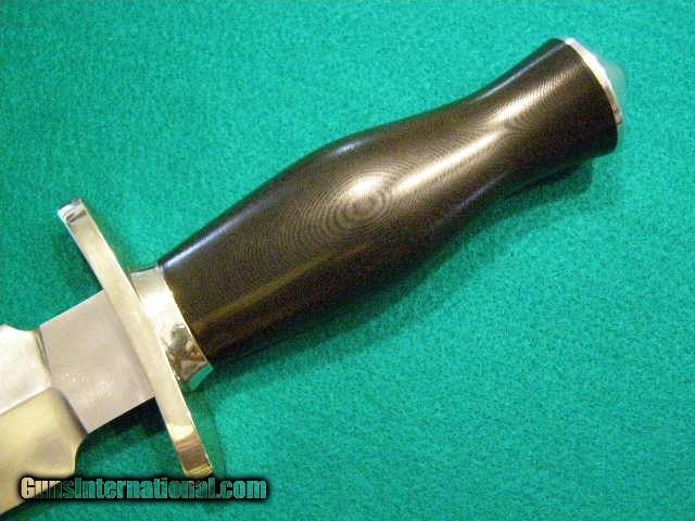 Description: Randall Tom Clinton Special in new unused condition. The knife has a black micarta handle with stainless steel blade, Nickel Silver forwrd curved double hilt, Nickel silver collar with skull crusher cap, and black sheath. This knife has never been stored in the sheath. SOLD |
