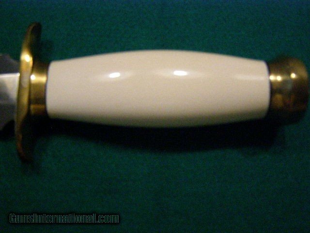 Description: Randall Model # 13 with beautiful flawless Preban Ivory handle with double brassguard, brass collar with black spacers and brass pommel. This knife is UNUSED and comes as shown with all original paperwork. NOT sold where prohibied by law and NOT sold outside the CONUS. The shipping cost will be determined by the buyer. SOLD |