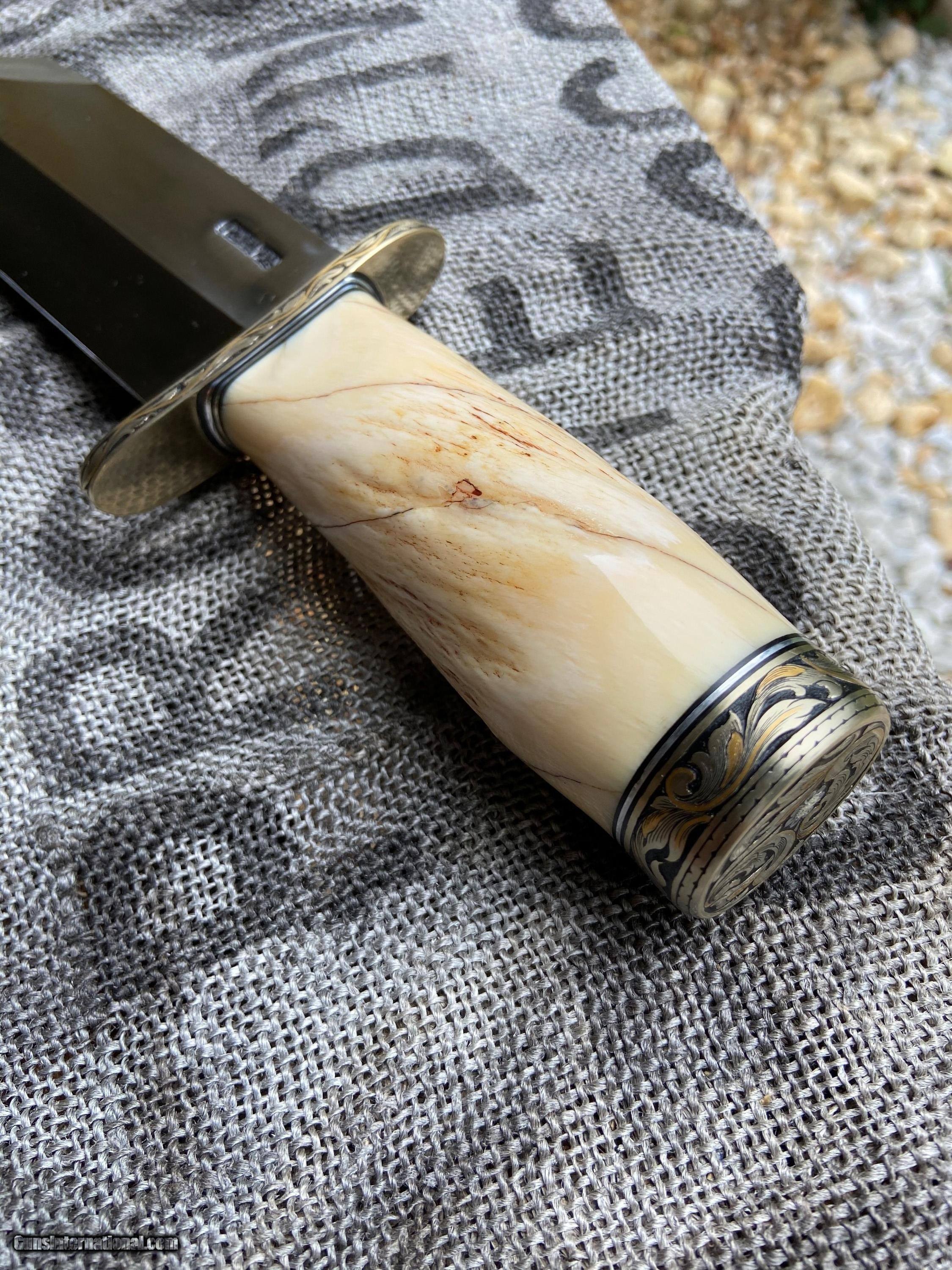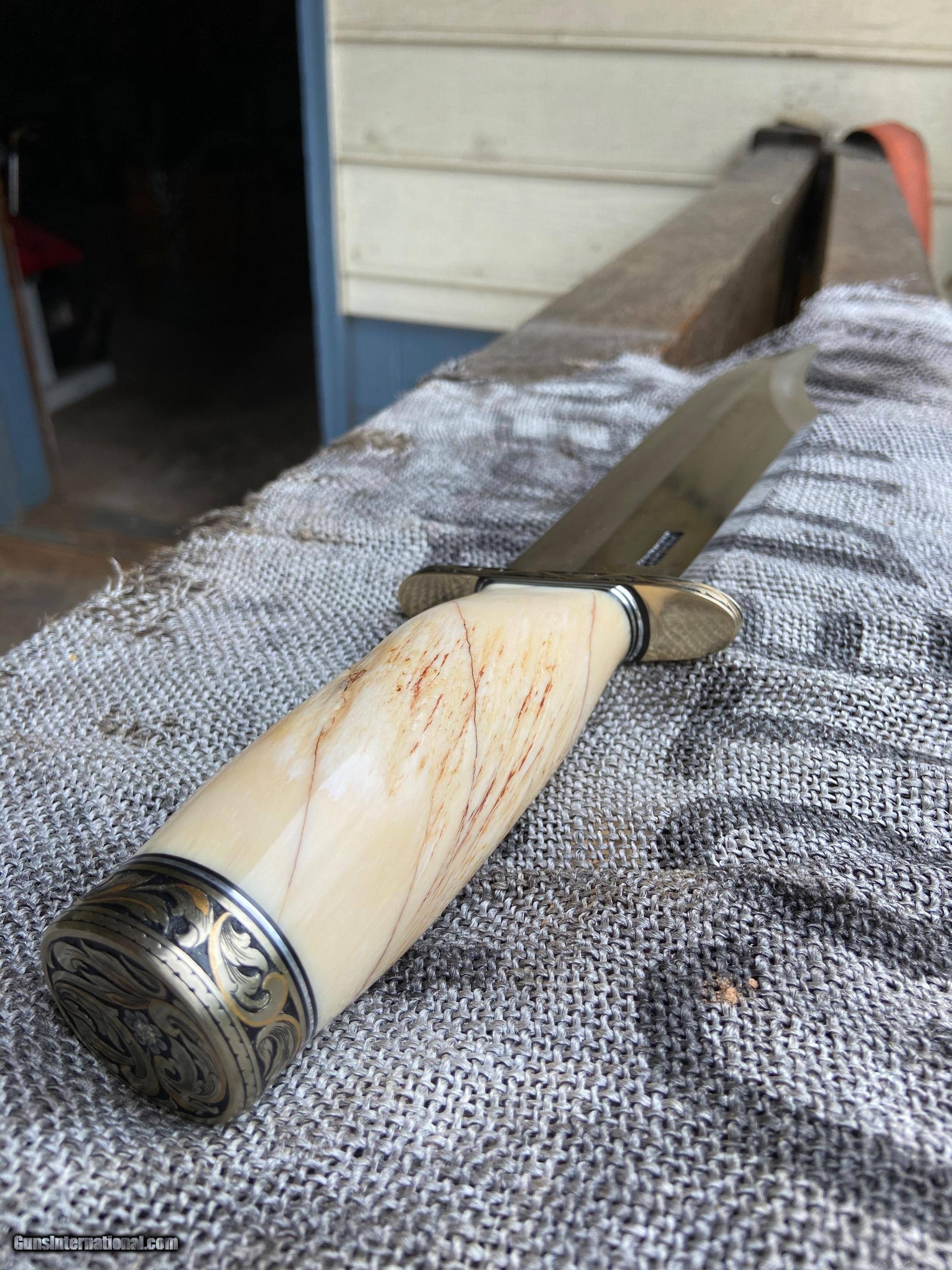 Description: Up for sale is a rare & desirable 12-11 Smithsonian.Knife took about 3 years to make Randall 12-11 with nickel silver forward curved hilt Nickel silver butt,with aluminum & black spacers Extremely rare huge piece of Narwhal for handle Gold inlaid & engraved by Master Jere Davidson Here Davidson is factory engraver for Dakota Firearms & Purdeyes with no hone Sullivans sheath.Never carried,used,or sharpened.No international sales.Long time seller on eBay.beringause123.Thanks for looking SOLD |