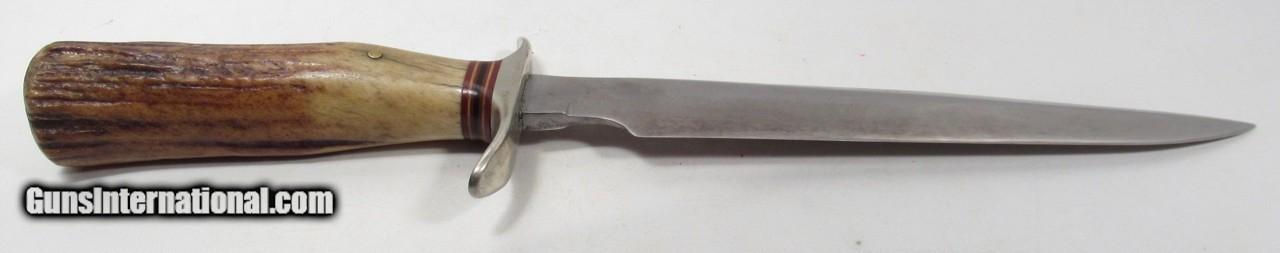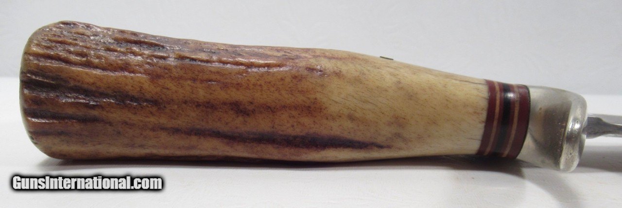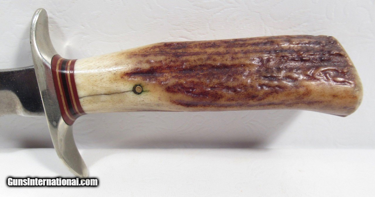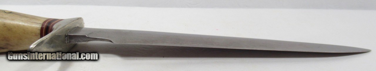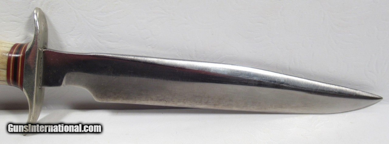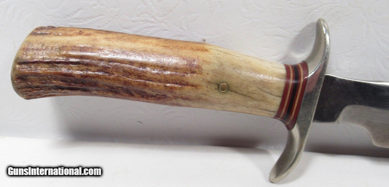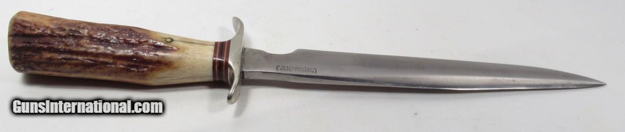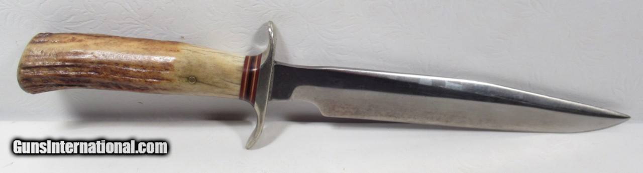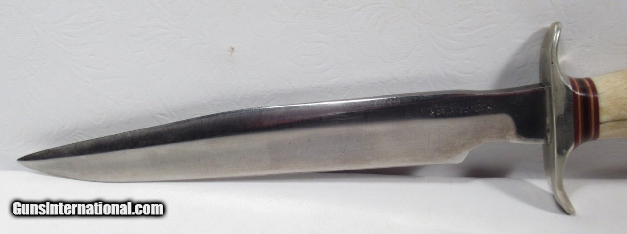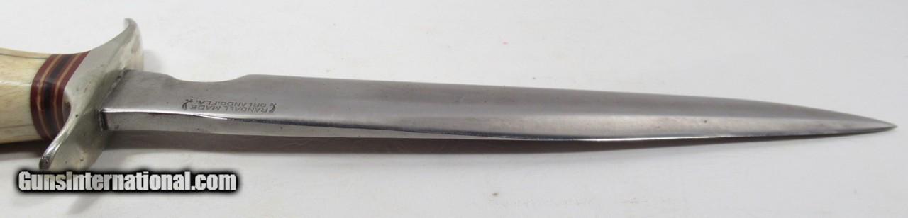 Description: Early 1950’s Randall Model 1-8; Very Similar to one Shown on Page 27 of “Randall Military Models” by Robert E. Hunt; 8” Blade with Stag Handle and Compass; Original Heiser Sheath in fair condition; Blade cleaned (See Photos); PERSONAL PROPERTY of Harold Wieser; Price: $2,150 + $30 S&H; Price includes insured shipping; return policy: three days inspection from the date the item is received; full refund of shipping both ways ONLY IF THE ITEM IS MISREPRESENTED. SOLD |