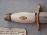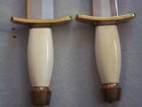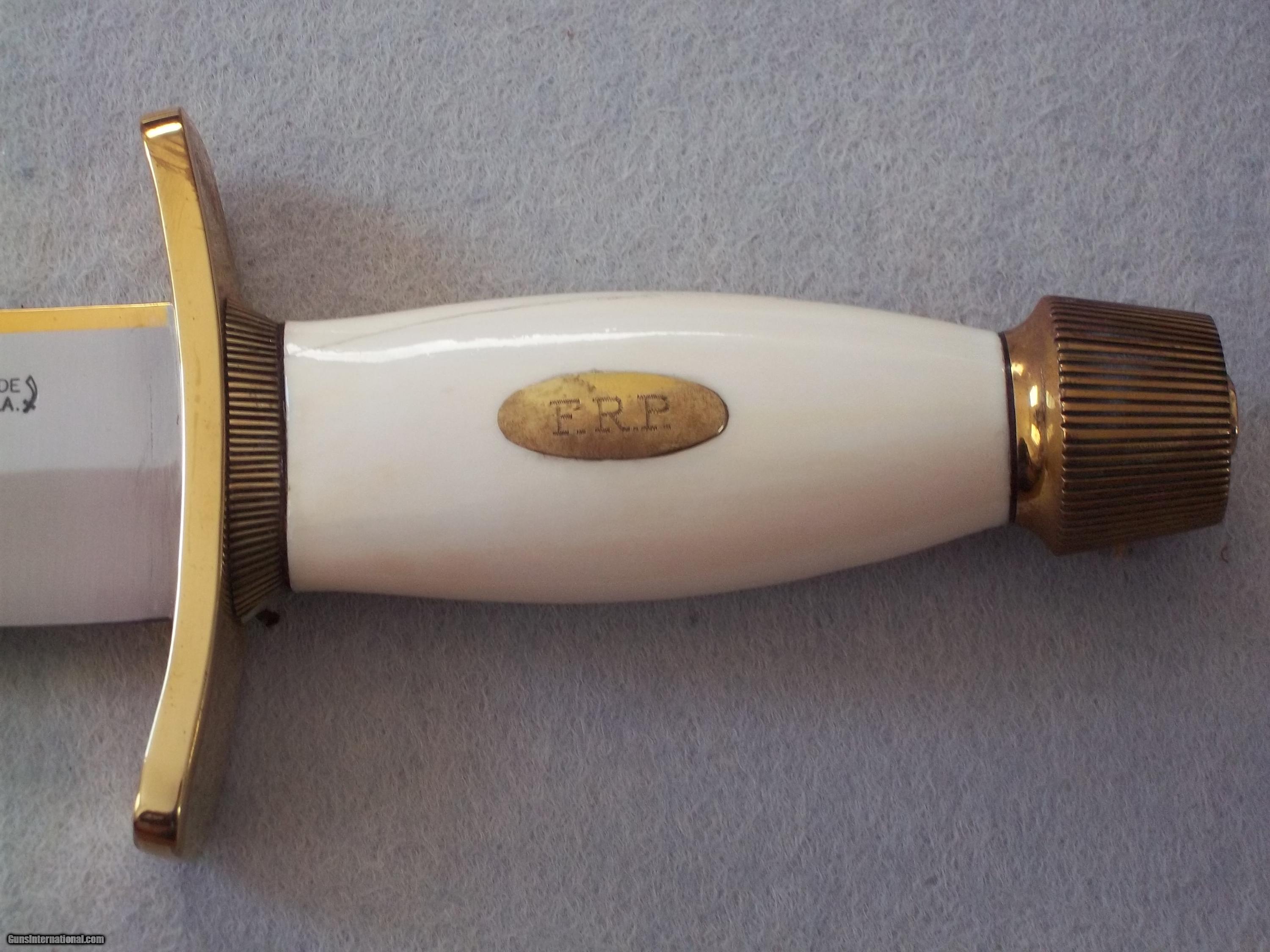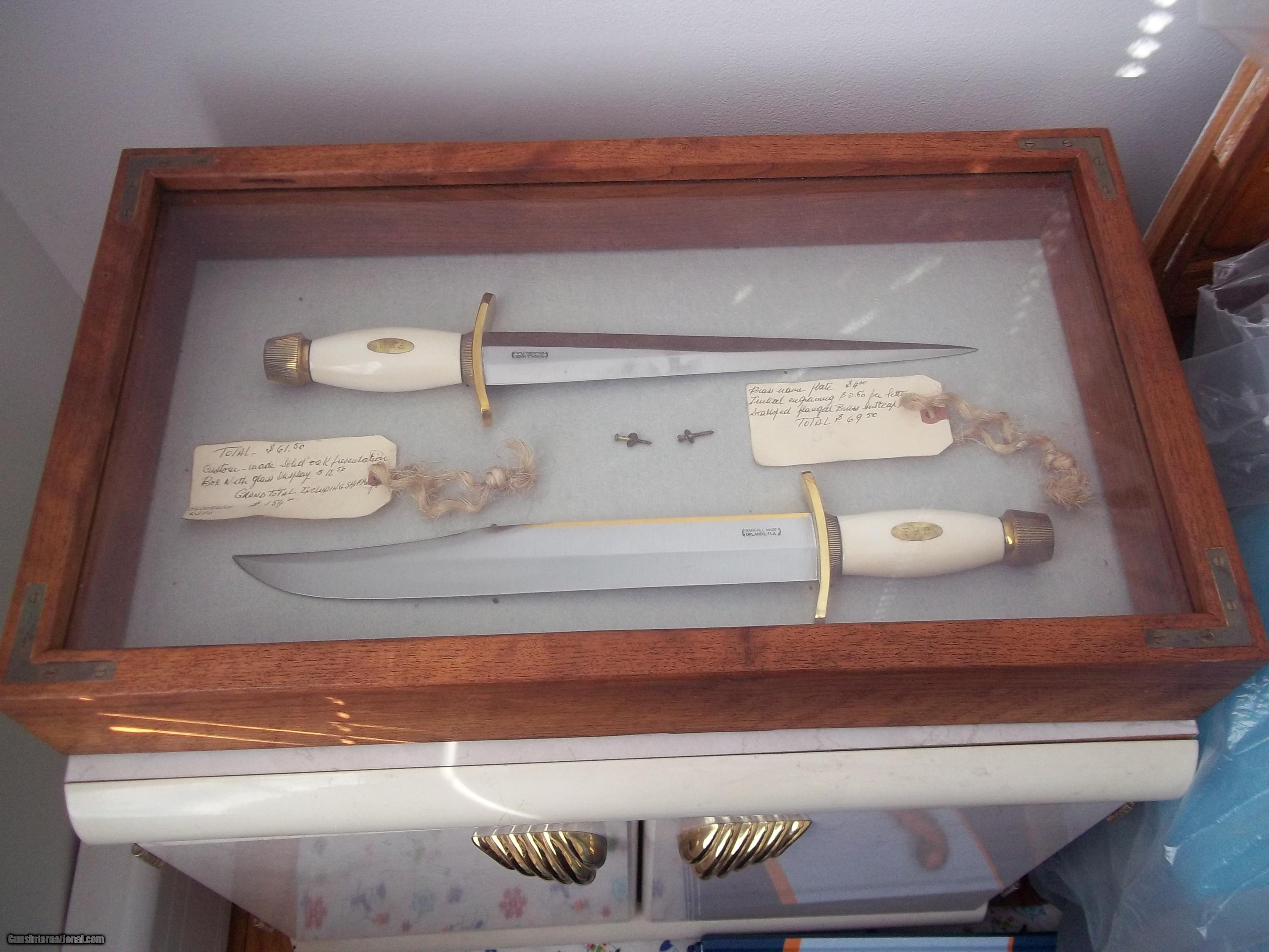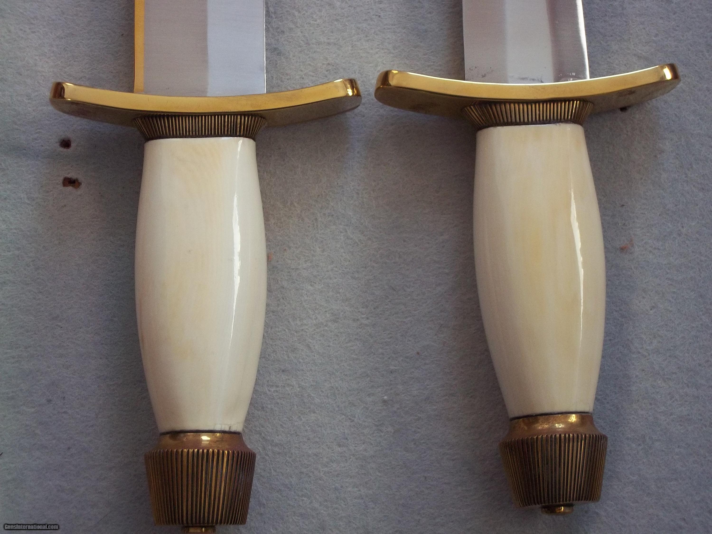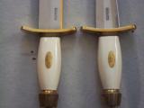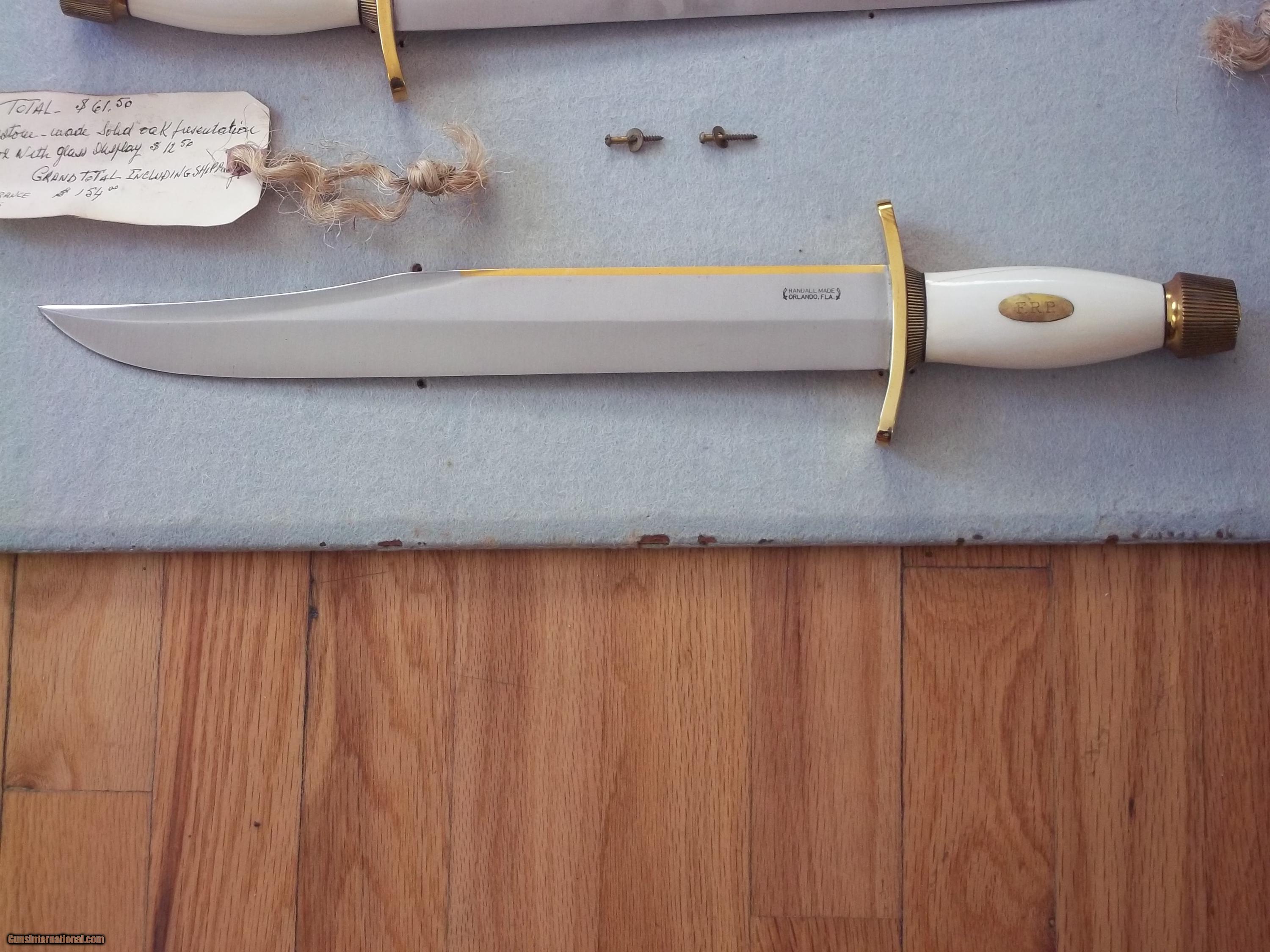 The condition of that particular set is by far the most spectacular you'll ever encounter today; as it is pristine-light check in the ivory handle which is typical of such precious material. This uniquely produced set presents these two knives in a private collection that belongs to the art of custom knives or in museums. This is the replica of the set that the Randall shop made for the late King Faisal II of Iraq back in April 1956. The only difference is that the shop could not rerproduce the King's Royal insigna and the King's initials on the brass name plate. Any "true" King Faisal set must have the Raymond Thorp Bowie with the brass back feature brazed on the knife's spine, Both knives have a scalloped brass collar, double brass guard with forward curve, female center cut elephant tusk ivory handle, a matching brass name plate and a scalloped flanged brass butt cap. One particular photograph denotes the imprint of both knives in the original felt seen at the bottom of the hand-made presentation oak case by Randall as they were originally held in place by four wires for about 44 years, before I acquire the set. The oak presentation case weighs over 10 lbs. At the very beginning, in the space of just few years, W.D. "Bo" Randall , founder of Randall Made Knives, managed to make his name and "forge" a place for his exceptional talents in hand-forging custom-made knives, and began to supply knives to our troops on their way to WWII, thus creating a dynasty that thrives today. It is during the 50's, 60's and early 70's that the Randall shop began to supply and produce some of the most stunning pieces ever created, as vouched by the fact that many of these exquisite knives resides in the Randall museum; should a customer have his own design or style of knife that he would like the Randall shop to produce.. Like a fine and outstanding piece of jewelry, this set represents elegance and prestige. Shown in a book about W.D. "BO" Randall. NOTE: If you know where a similar set can be purchased like the one being offered here at a lesser price, I'll be more than happy to match it, but the odds in finding such set in the same remarkable condition I am convinced, are slim to none. Free shipping USPS with tracking number ( USA only).