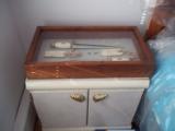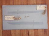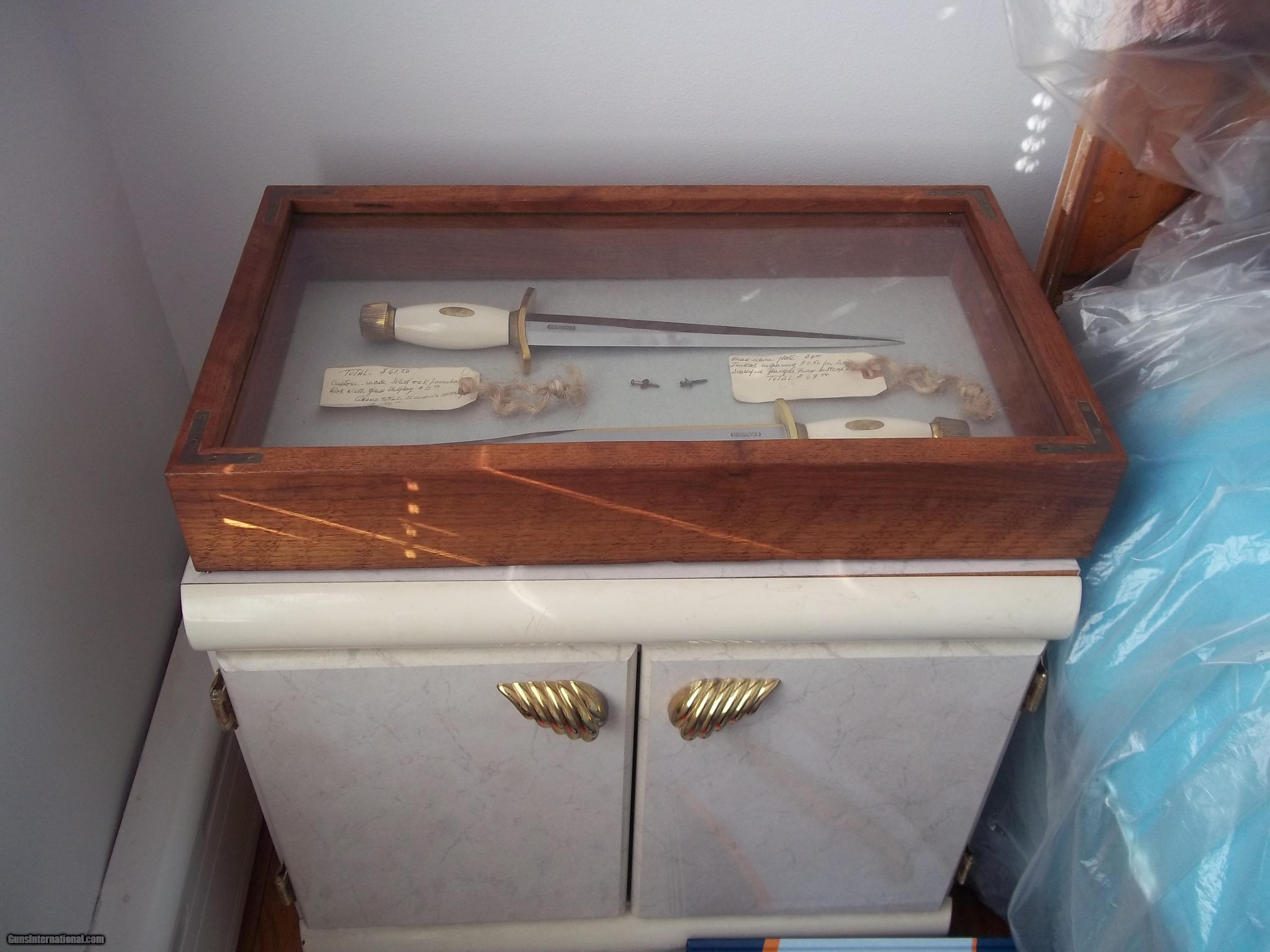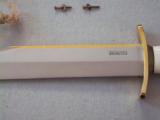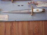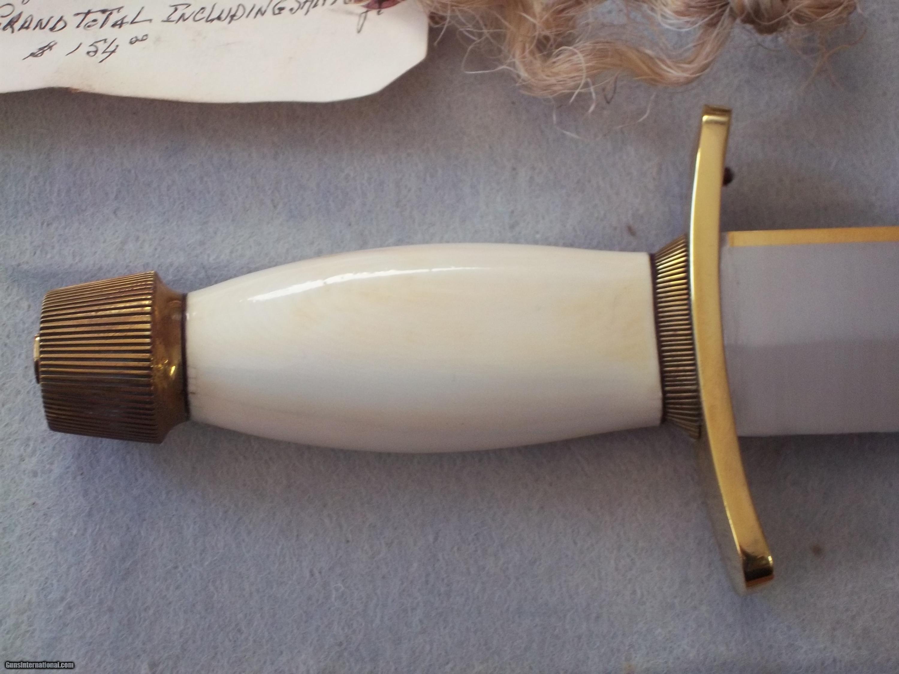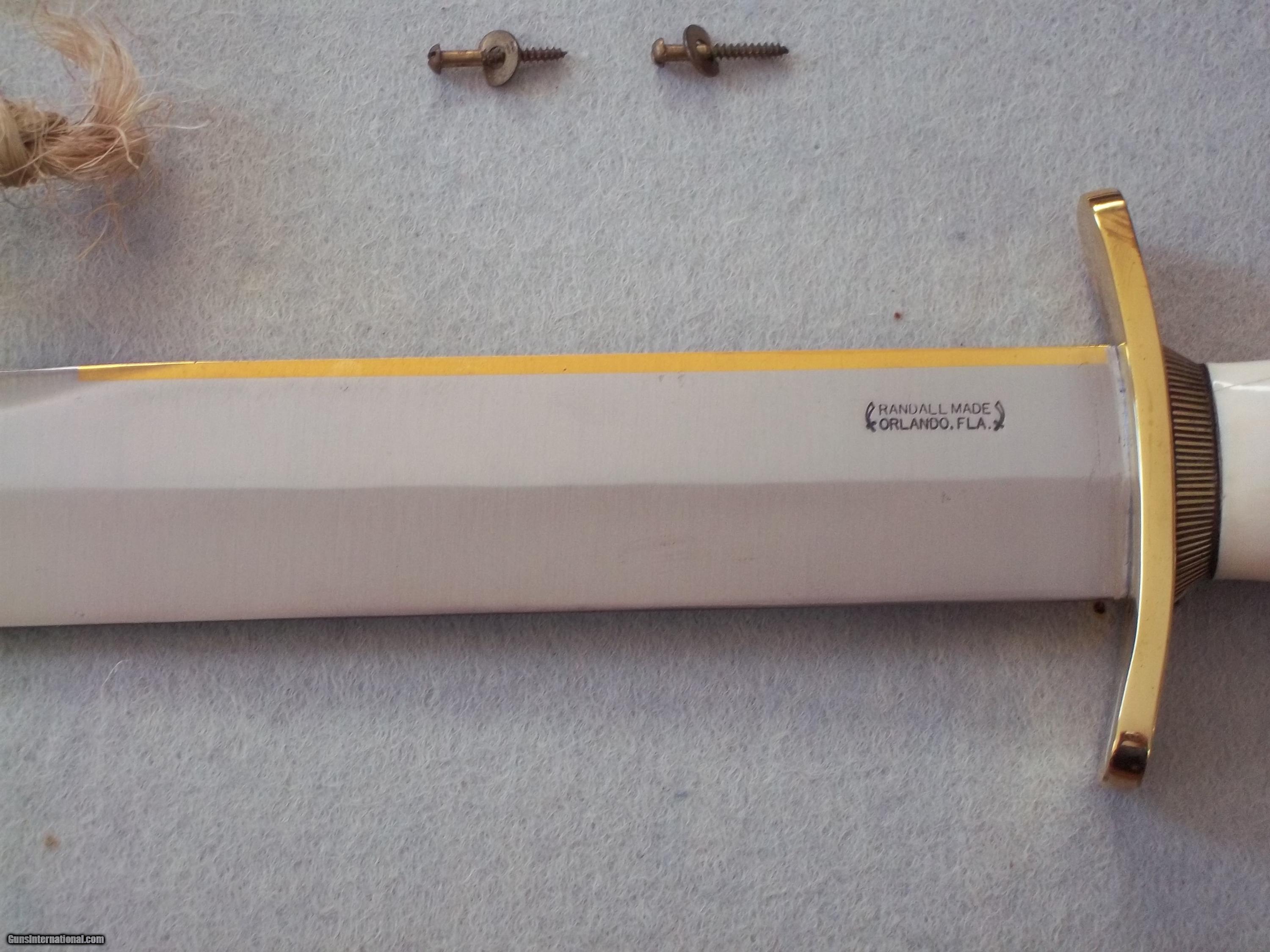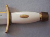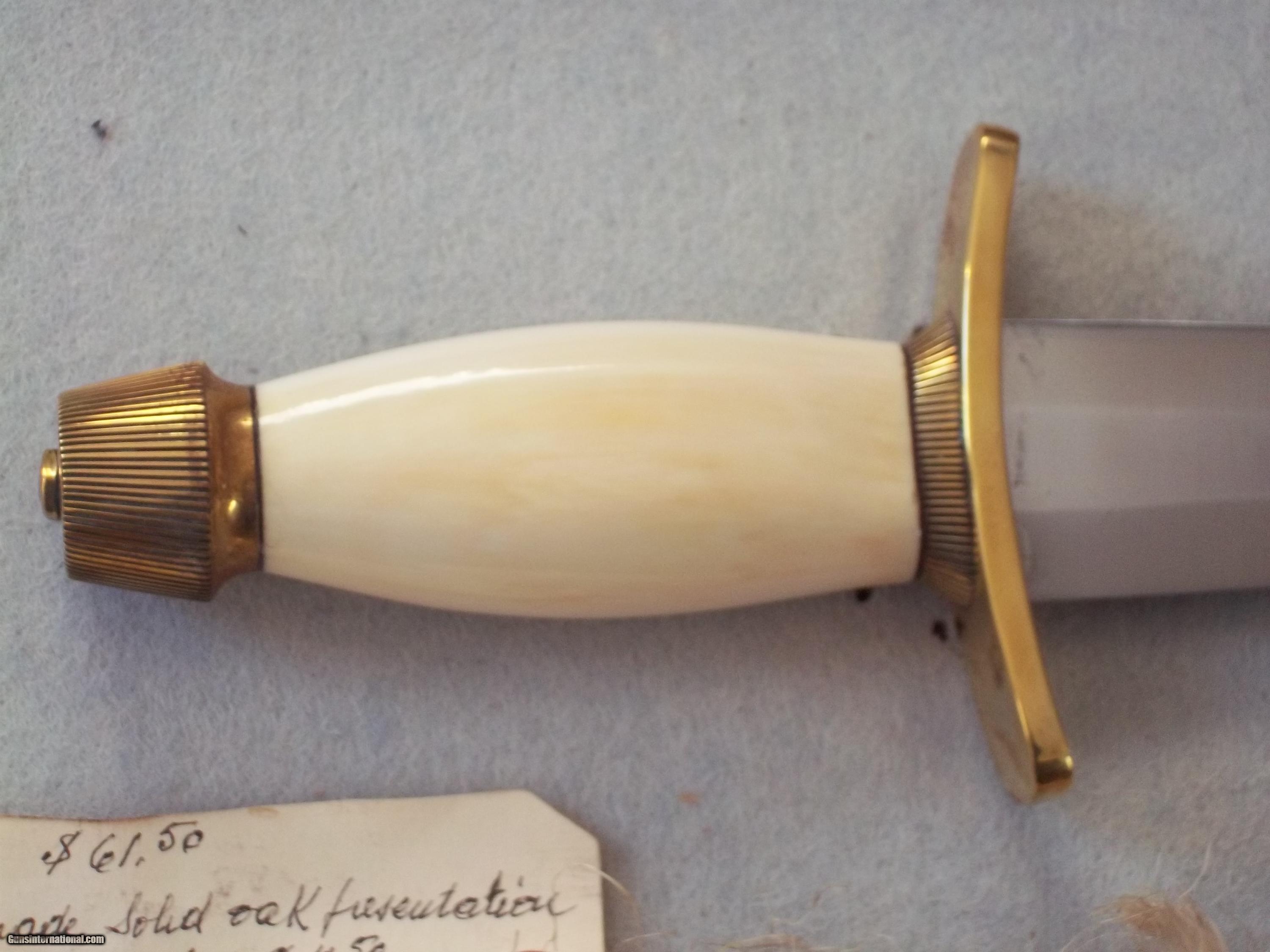 The condition of that particular set is by far the most spectacular you'll ever encounter today; as it is pristine-light check in the ivory handle which is typical of such precious material. This uniquely produced set presents these two knives in a private collection that belongs to the art of custom knives or in museums. This is the replica of the set that the Randall shop made for the late King Faisal II of Iraq back in April 1956. The only difference is that the shop could not rerproduce the King's Royal insigna and the King's initials on the brass name plate. Any "true" King Faisal set must have the Raymond Thorp Bowie with the brass back feature brazed on the knife's spine, Both knives have a scalloped brass collar, double brass guard with forward curve, female center cut elephant tusk ivory handle, a matching brass name plate and a scalloped flanged brass butt cap. One particular photograph denotes the imprint of both knives in the original felt seen at the bottom of the hand-made presentation oak case by Randall as they were originally held in place by four wires for about 44 years, before I acquire the set. The oak presentation case weighs over 10 lbs. At the very beginning, in the space of just few years, W.D. "Bo" Randall , founder of Randall Made Knives, managed to make his name and "forge" a place for his exceptional talents in hand-forging custom-made knives, and began to supply knives to our troops on their way to WWII, thus creating a dynasty that thrives today. It is during the 50's, 60's and early 70's that the Randall shop began to supply and produce some of the most stunning pieces ever created, as vouched by the fact that many of these exquisite knives resides in the Randall museum; should a customer have his own design or style of knife that he would like the Randall shop to produce.. Like a fine and outstanding piece of jewelry, this set represents elegance and prestige. Shown in a book about W.D. "BO" Randall. NOTE: If you know where a similar set can be purchased like the one being offered here at a lesser price, I'll be more than happy to match it, but the odds in finding such set in the same remarkable condition I am convinced, are slim to none. Free shipping USPS with tracking number ( USA only).