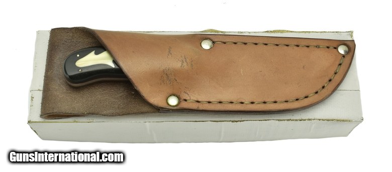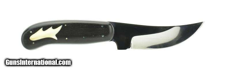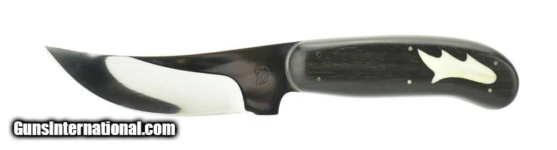 Description: Lion of Judah Ebony Hunter. Custom Hunter/Skinner out of Zumbrota, MN. Hand forged, mirror polished 4"" blade with Ebony wood scales inlayed with Mastodon Ivory. Comes with sheath and box. SOLD |