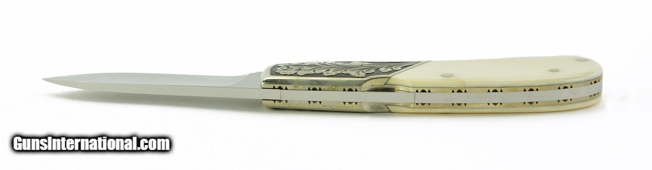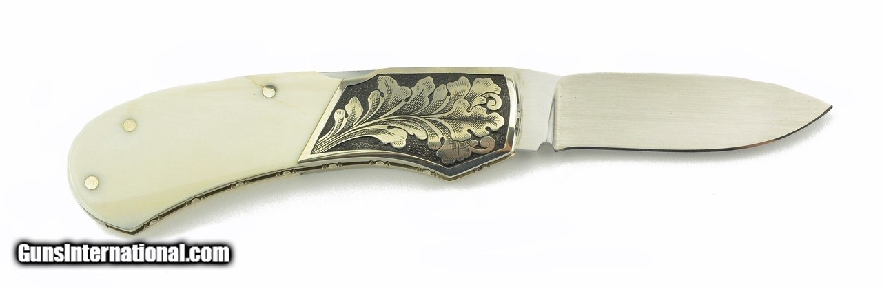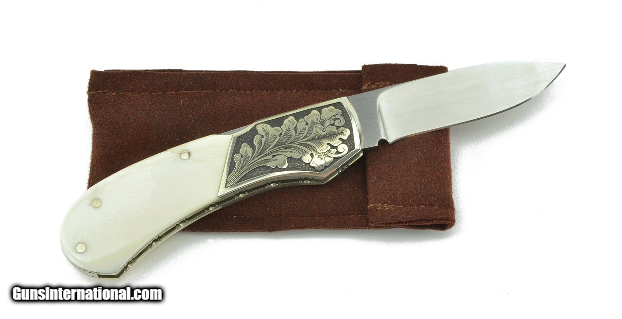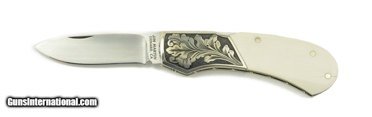 Description: "Jim Martin Lock Back Knife. Beautiful lock back knife with 2 ½" blade, engraved dovetail cut bolster, and bone handle. Grips are very good with minor cracks. Very good plus overall condition. A reasonably priced Jim Martin knife. Price: $800.00 Contact Seller |