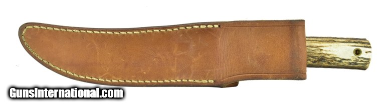 Description: "Jimmy Lile No.19 “Hunter’s Bowie". This is a No. 19 “Hunter’s Bowie" with a 5" blade. This knife was made between 1975-1991 with “LILE" in block letters. Blade is very fine. There is some staining near ricasso. Sheath is excellent. SOLD |