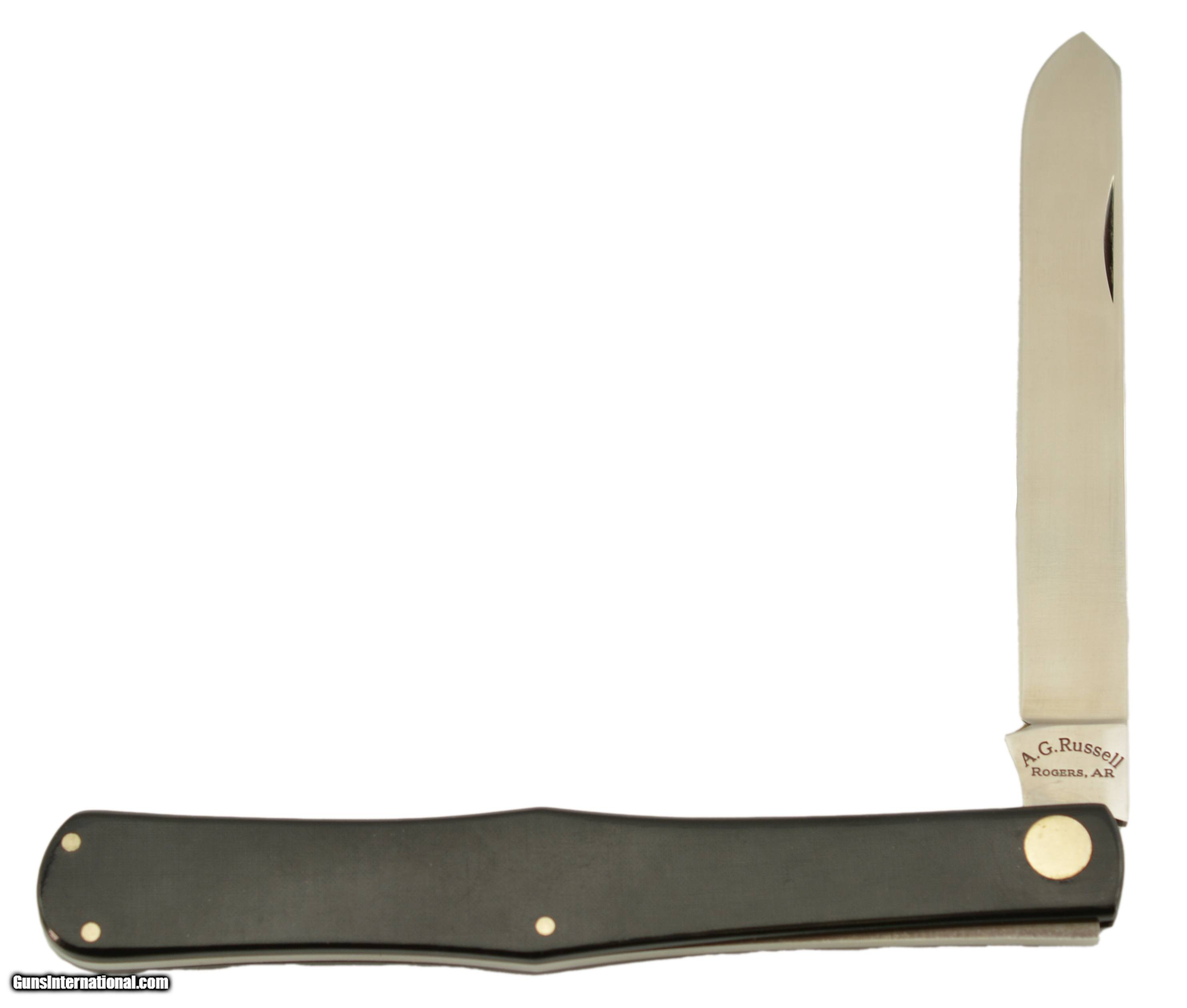Description: This is a black micarta handle scales A. G. Russell Melon Tester in excellent condition dated 2007. Satin finished stainless steel spey style melon tester blade. The blade has good strong snap. Tang stamped A.G. RUSSELL ROGERS, AR-2007. Stainless steel back spring, pivot pin, and handle pins. This knife is 5 3/8" closed with a 4 3/8" blade. Nice high quality melon tester knife by A.G. Russell. SOLD Manufacturer: Russel Model: Knife |
