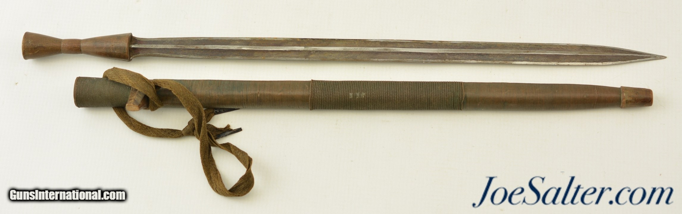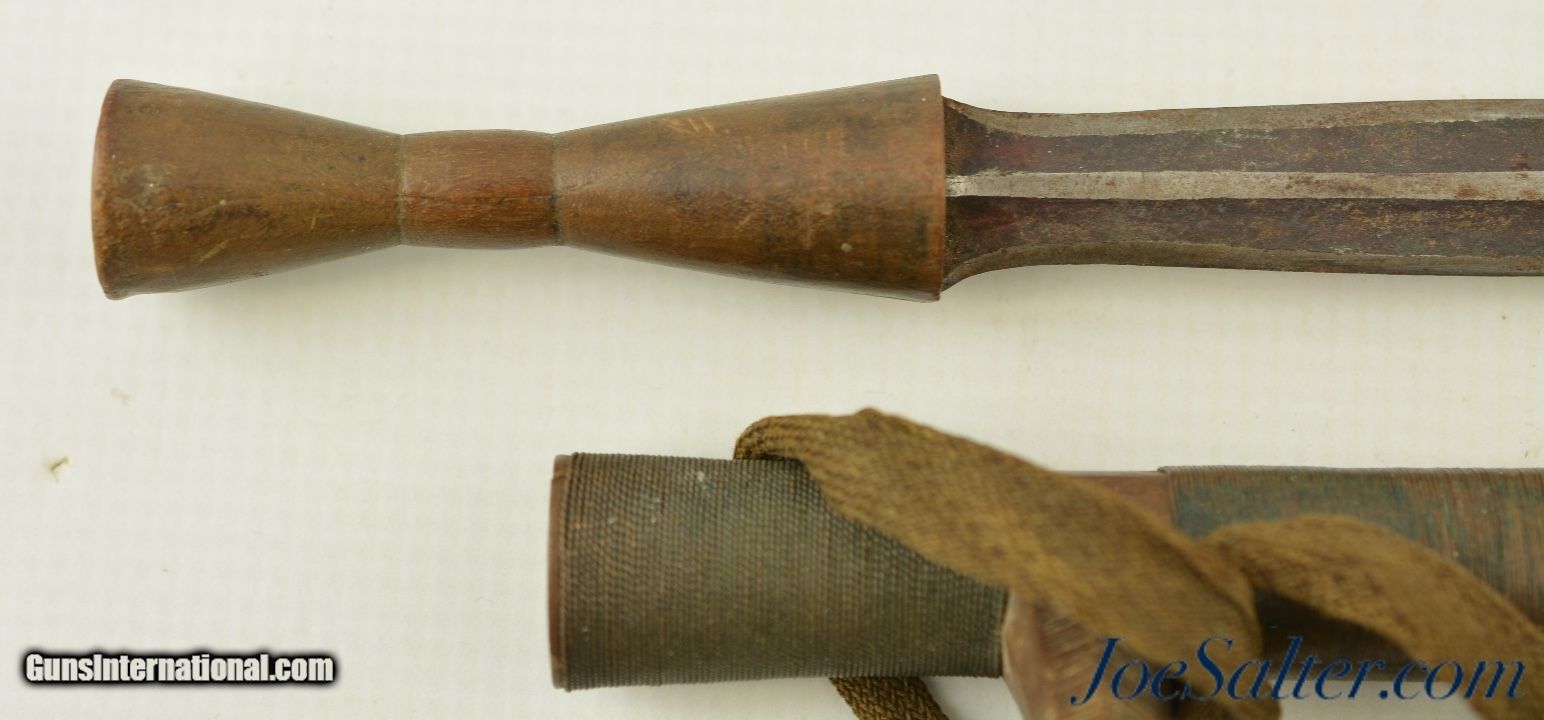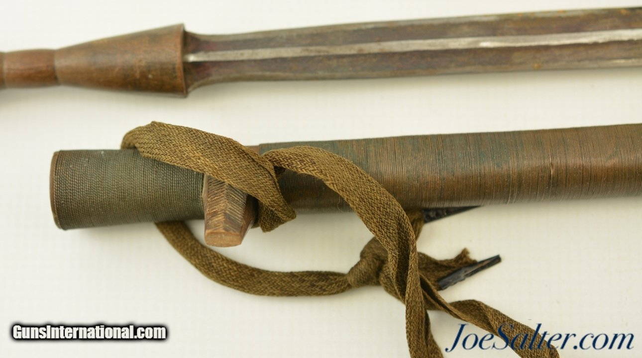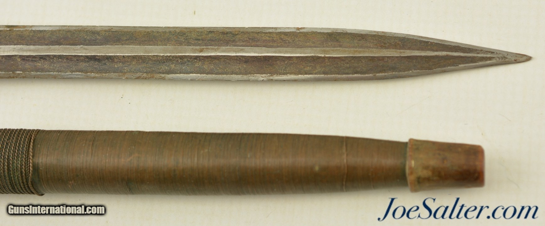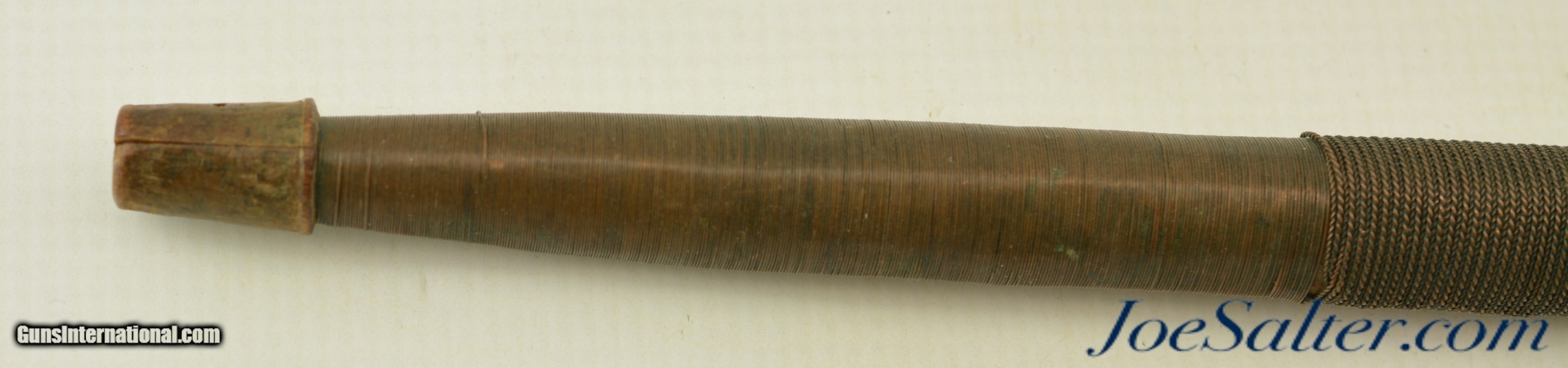 Description: This is an attractive knife that measures 18 7/8" overall with a 15 5/8" straight, double-edged blade with spearpoint tip and full-length double fullers. The blade has a dark patina within the fullers, and bright gray along the remainder and edges. The short wooden hilt is hourglass-shaped, and quite narrow in the middle (less than 1/2" in diameter), and has an exposed tang at the pommel. The wooden scabbard is tightly bound by copper wire in two styles: braided near the throat, simple wrap along the body, with a wide band of braided, heavier gauge wire about midway down. There is a single projection near the throat for a thong, or loop (it is broken at the tip, but it is an old break). The specific country of origin is unknown, but the dagger does bear many similarities to the "Bakatwa" daggers of what is now Zimbabwe.; SOLD |