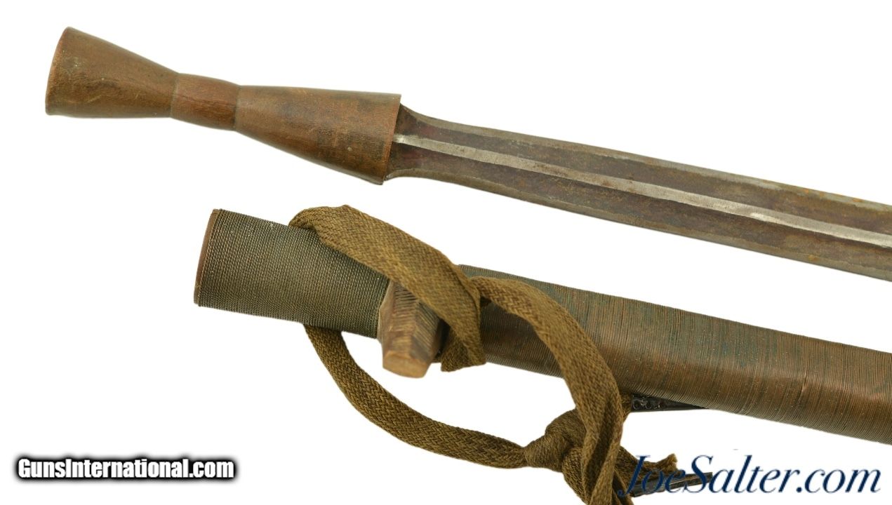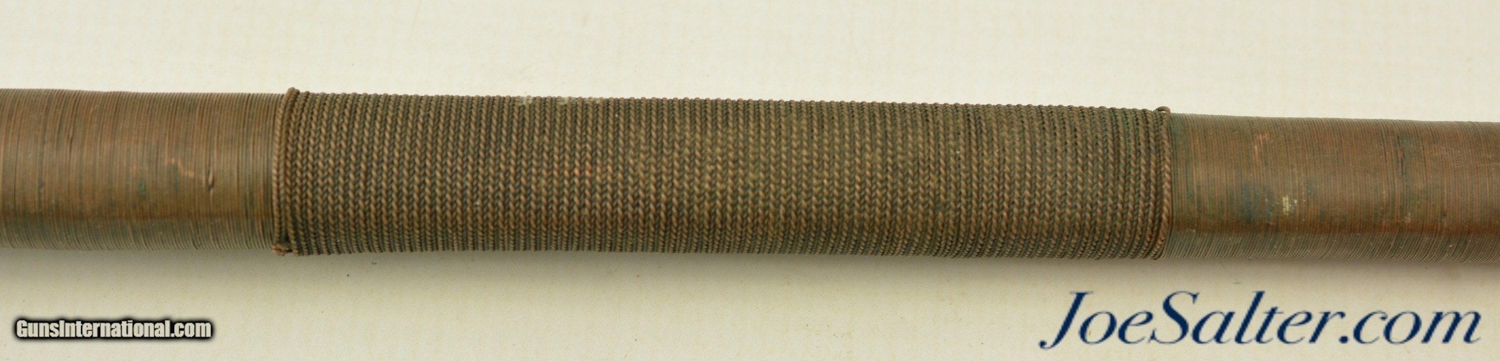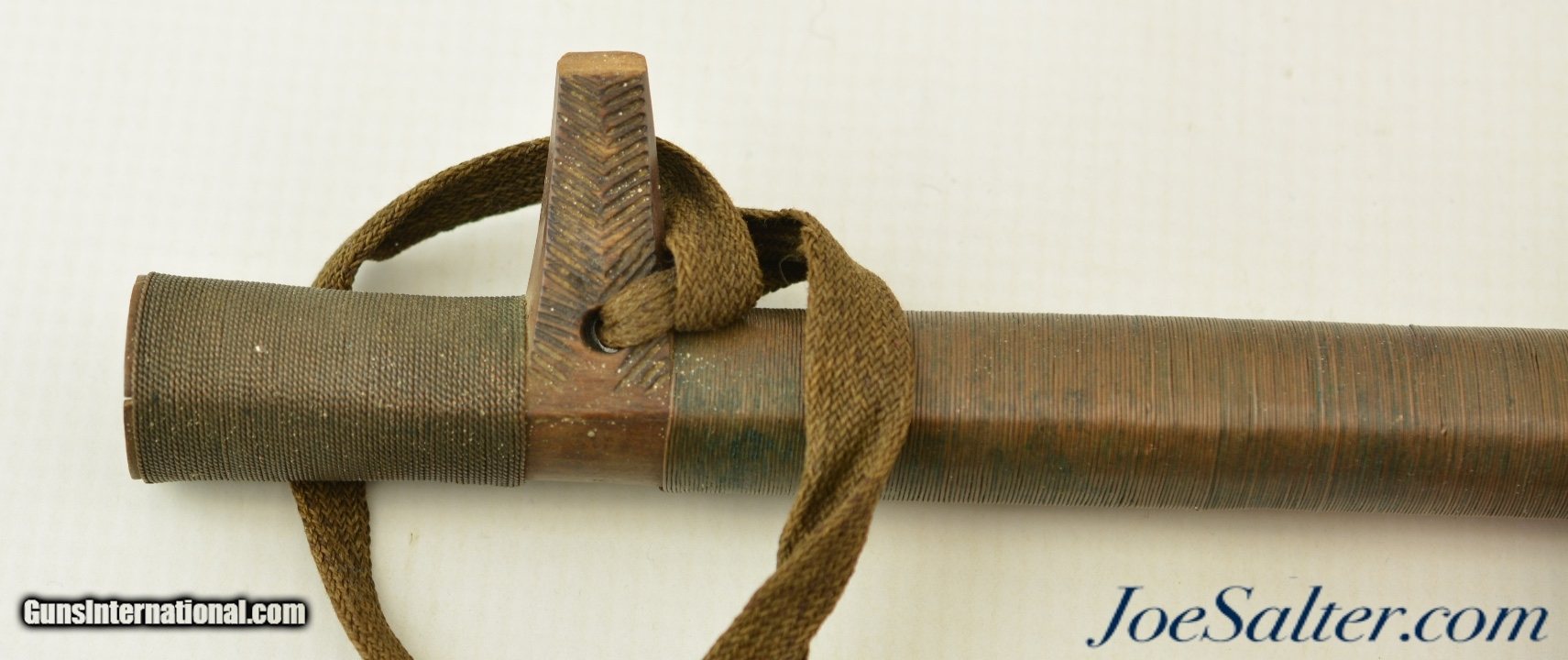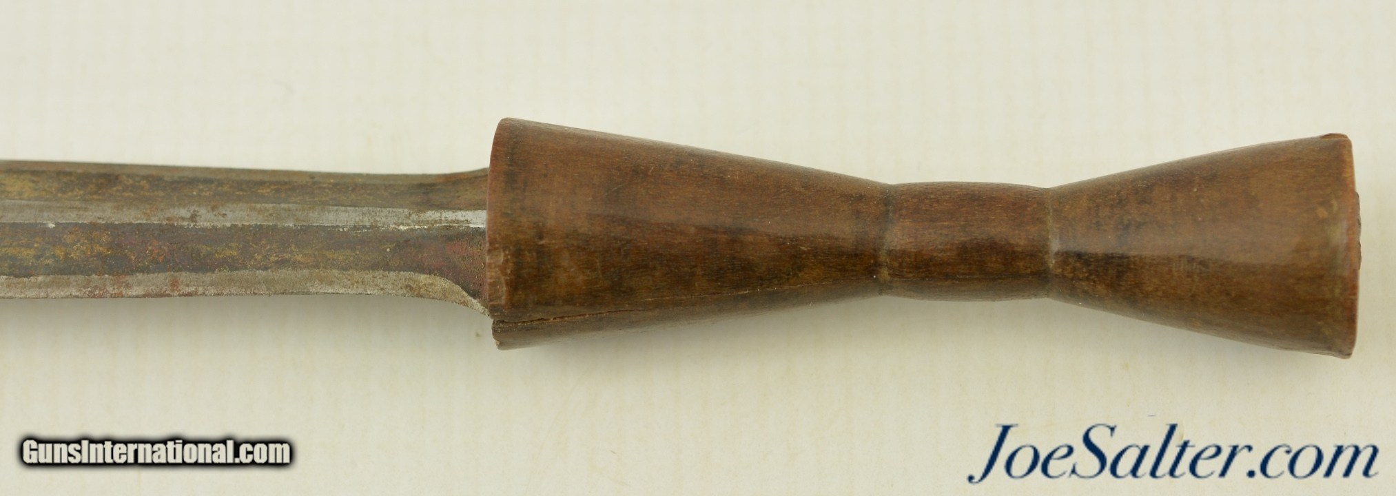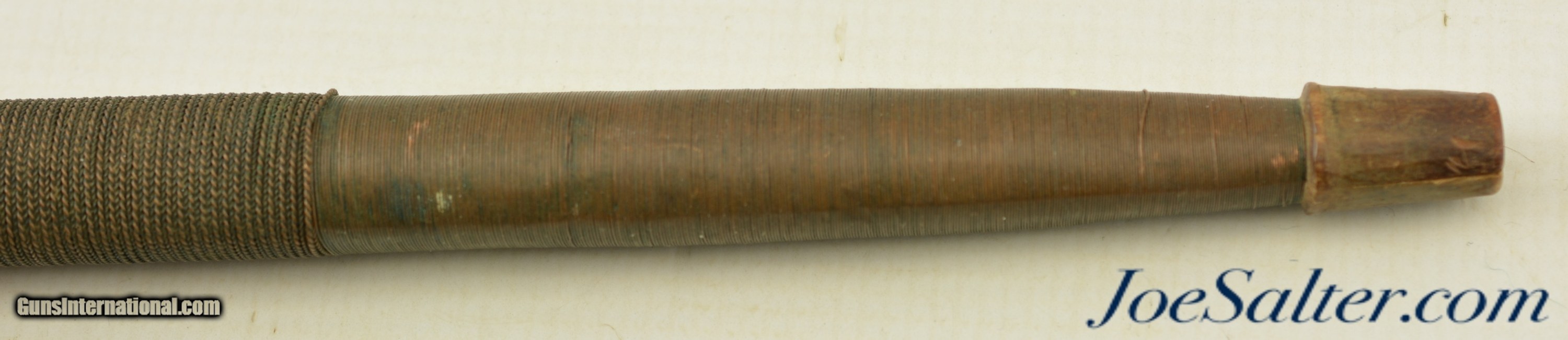 Description: This is an attractive knife that measures 18 7/8" overall with a 15 5/8" straight, double-edged blade with spearpoint tip and full-length double fullers. The blade has a dark patina within the fullers, and bright gray along the remainder and edges. The short wooden hilt is hourglass-shaped, and quite narrow in the middle (less than 1/2" in diameter), and has an exposed tang at the pommel. The wooden scabbard is tightly bound by copper wire in two styles: braided near the throat, simple wrap along the body, with a wide band of braided, heavier gauge wire about midway down. There is a single projection near the throat for a thong, or loop (it is broken at the tip, but it is an old break). The specific country of origin is unknown, but the dagger does bear many similarities to the "Bakatwa" daggers of what is now Zimbabwe.; SOLD |
