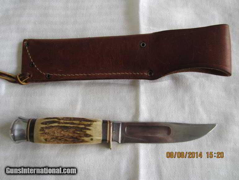 Description: NOTE: MY PICTURES DON'T DO THIS KNIFE JUSTICE. IT IS MUCH BRIGHTER THAN IT APPEARS .A beautiful Hunting (Bowie type) knife with a blood groove and STAG handle. The blade is 4 1/2" long and the overall length is 6 1/4". It is well marked with " Sabre, Solingen # 124 " on one side of the blade (near the handle) and " American Knife Co., Germany" on the other side . The blade and grip are in excellent condition with a few minor dings in the metal at the top of the grip. The blade is sharp with no chips, rust or staining. The pictures don't do it justice. The leather sheath is also in excellent condition (almost looks new) with just a few very minor marks. It is stamped "49ers" (see picture).. It has a snap strap retainer. I have owned this knife for about 50 years, and it is older than that. A quality, well made piece. Selling a large collection. See all under "Romsey". SOLD |