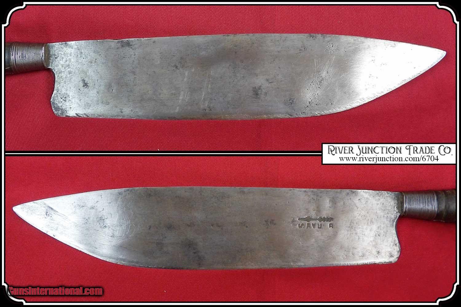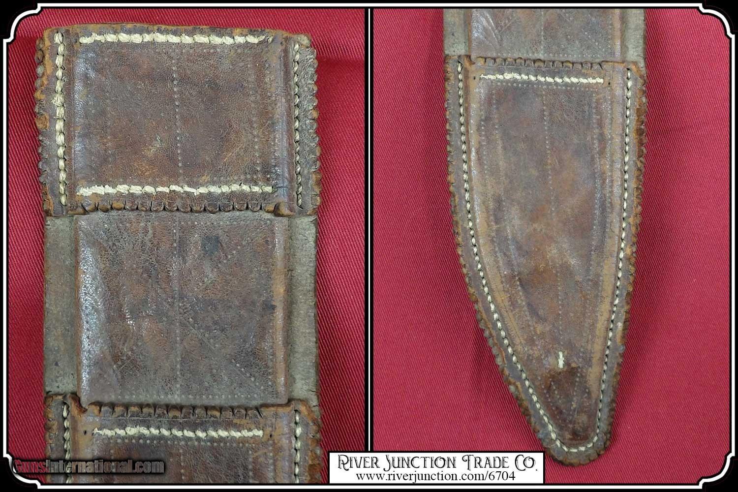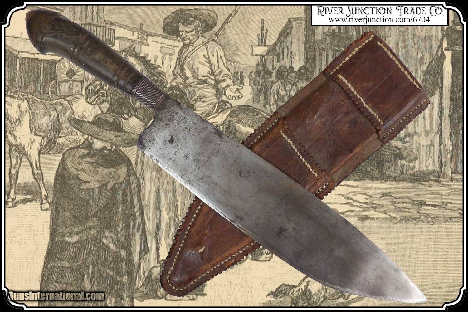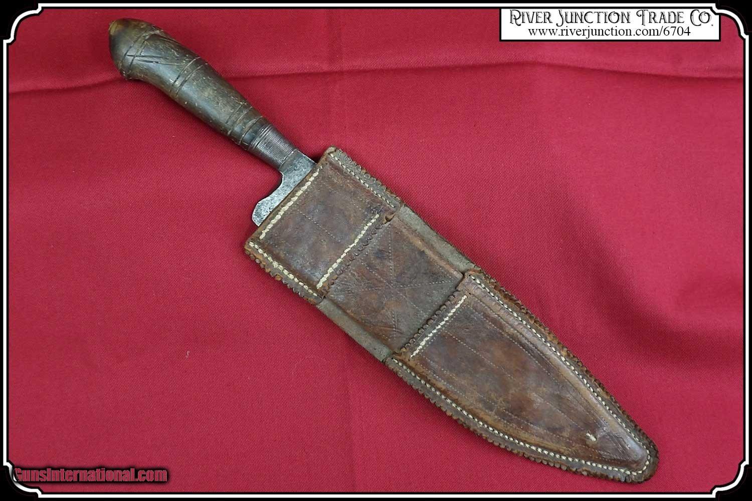 Description: This is an old Mexican knife. Marked with the makers sign (an arrow see photo) and the letters (SAVU A) on the right side. The knife has a black bull horn handle and a 10” blade and is 15” overall. All parts are tight and solid. There are no chips, cracks or moth chews on the horn handle. This is a primitive knife that would give many century of service. Mexicans were notoriously deadly knife fighters. It is in good solid condition. This is a very well-made Mexican knife dating to about 1870 to 1910. The sheath is just as interesting as the knife its self. It is made with primitive leather stamping all combine to make a uniquely interesting knife and sheath from common materials. It is the talent of the maker that makes it so appealing. All stitching is intact and displays very well. I have had this knife in the collection for 45 years. It is time to pass it to another caretaker. Payment: Item, can be ordered on line with a credit card or paypal on our sight. Just Google (riverjunction) and type in the River Junction Trade Co. item number (6704) in the search box. Before you checkout you will see shipping cost and total. OR If you prefer: Pay by cash, postal money order, cashiers check, personal & business checks. We wait for checks to clear. We always answer questions and entertain offers. Have questions? Call me 563-880-4588. Jim SOLD |