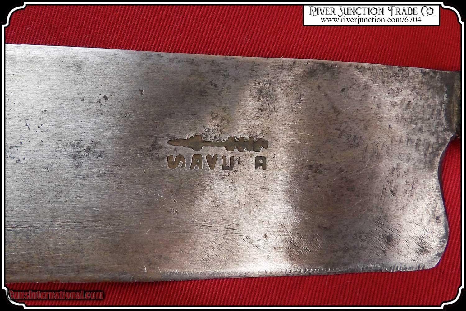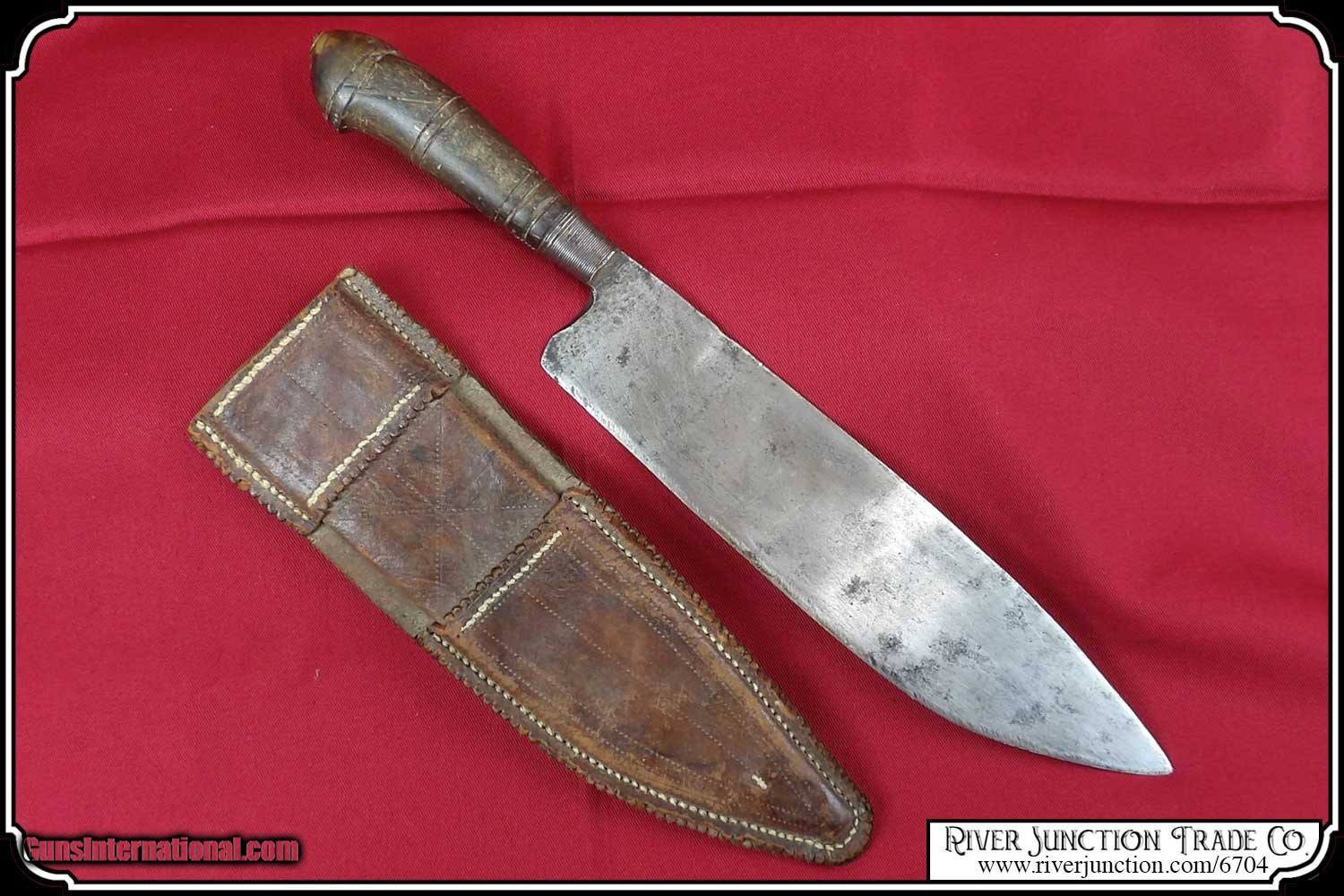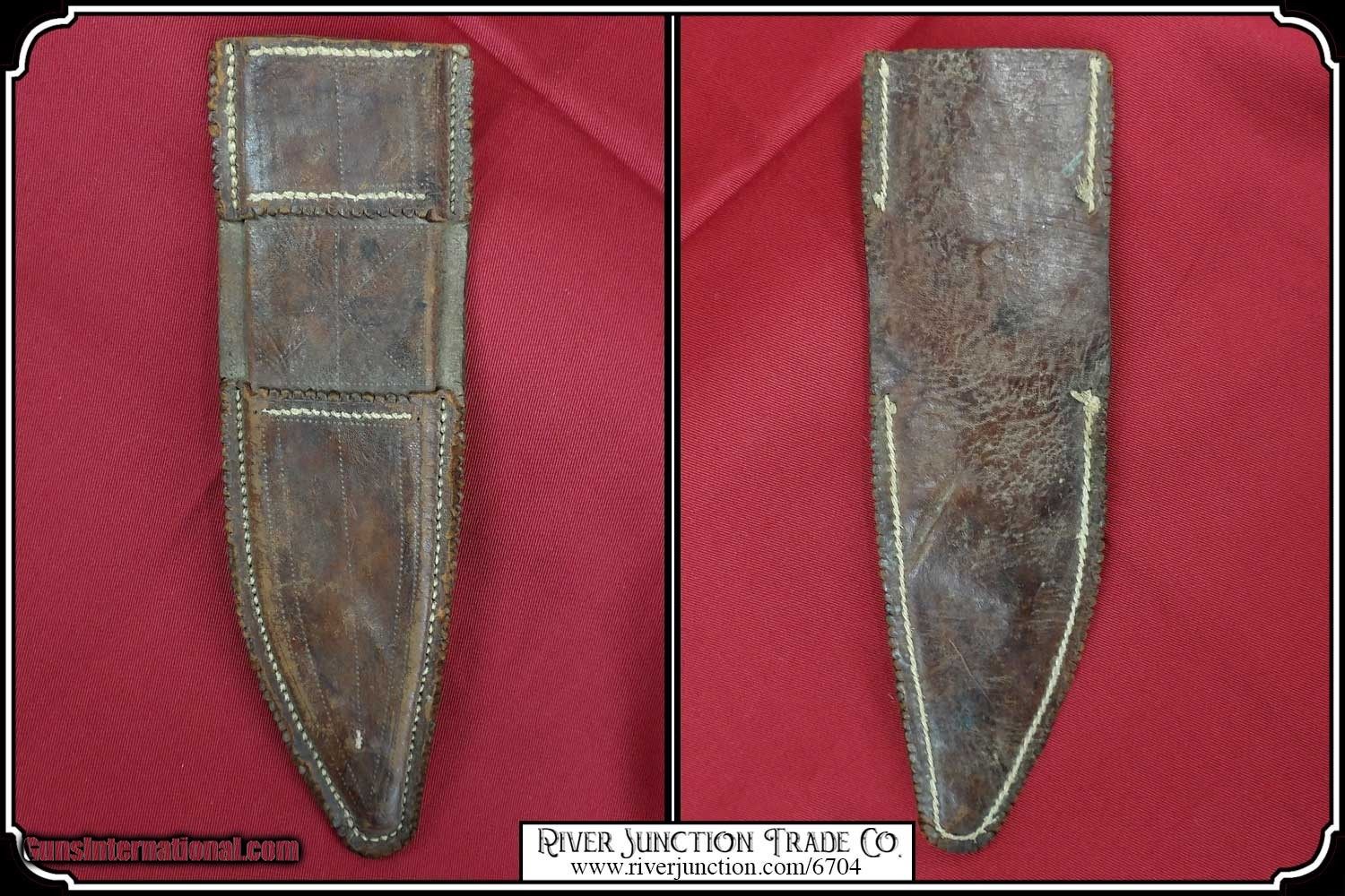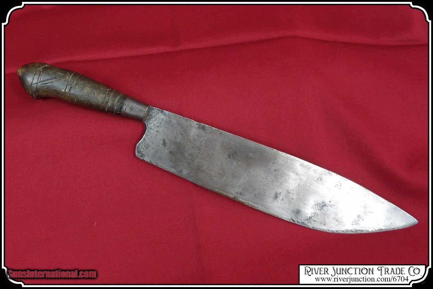 Description: This is an old Mexican knife. Marked with the makers sign (an arrow see photo) and the letters (SAVU A) on the right side. The knife has a black bull horn handle and a 10” blade and is 15” overall. All parts are tight and solid. There are no chips, cracks or moth chews on the horn handle. This is a primitive knife that would give many century of service. Mexicans were notoriously deadly knife fighters. It is in good solid condition. This is a very well-made Mexican knife dating to about 1870 to 1910. The sheath is just as interesting as the knife its self. It is made with primitive leather stamping all combine to make a uniquely interesting knife and sheath from common materials. It is the talent of the maker that makes it so appealing. All stitching is intact and displays very well. I have had this knife in the collection for 45 years. It is time to pass it to another caretaker. Payment: Item, can be ordered on line with a credit card or paypal on our sight. Just Google (riverjunction) and type in the River Junction Trade Co. item number (6704) in the search box. Before you checkout you will see shipping cost and total. OR If you prefer: Pay by cash, postal money order, cashiers check, personal & business checks. We wait for checks to clear. We always answer questions and entertain offers. Have questions? Call me 563-880-4588. Jim SOLD |