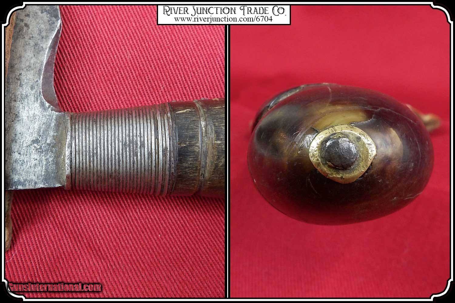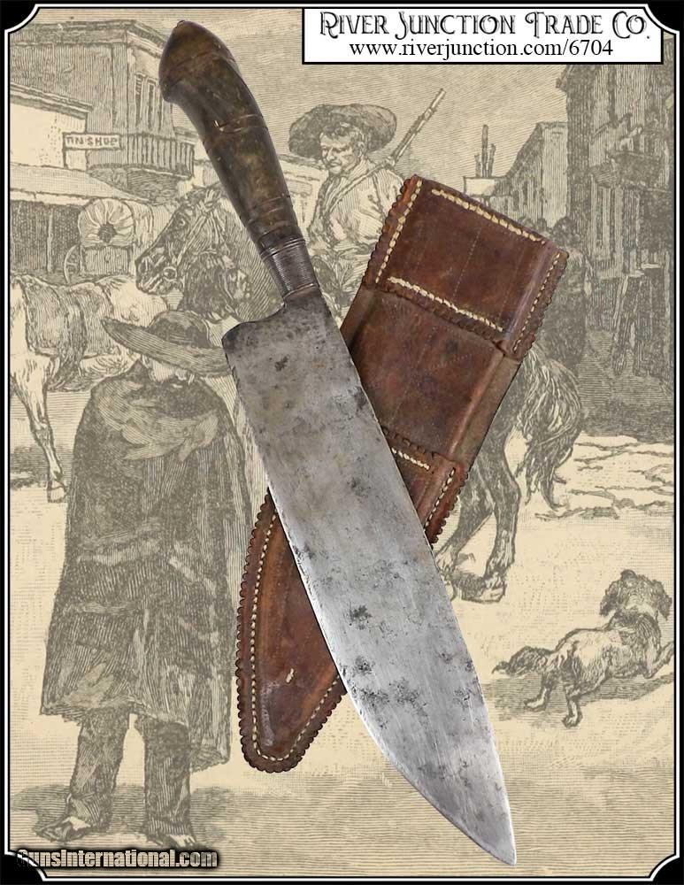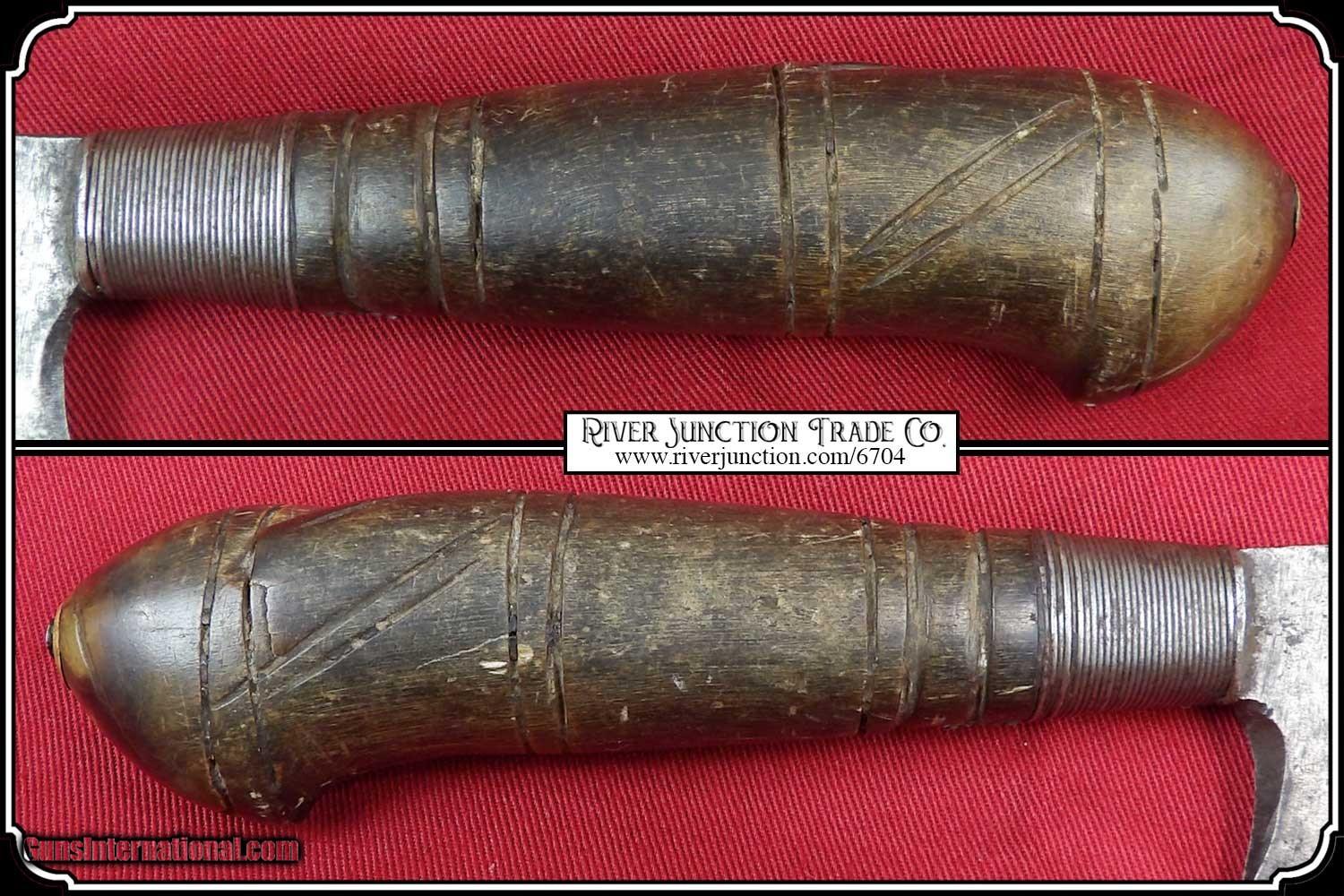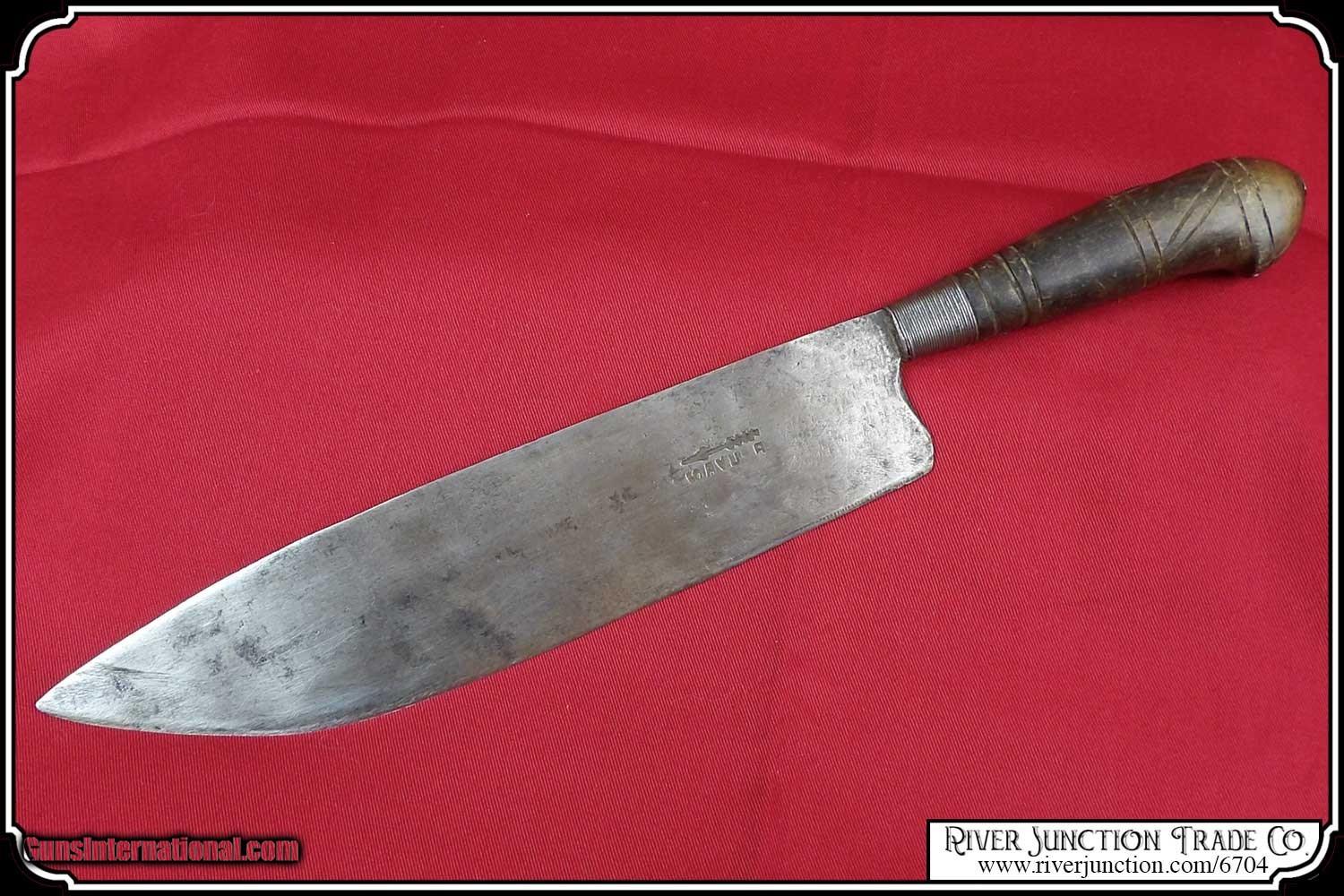 Description: This is an old Mexican knife. Marked with the makers sign (an arrow see photo) and the letters (SAVU A) on the right side. The knife has a black bull horn handle and a 10” blade and is 15” overall. All parts are tight and solid. There are no chips, cracks or moth chews on the horn handle. This is a primitive knife that would give many century of service. Mexicans were notoriously deadly knife fighters. It is in good solid condition. This is a very well-made Mexican knife dating to about 1870 to 1910. The sheath is just as interesting as the knife its self. It is made with primitive leather stamping all combine to make a uniquely interesting knife and sheath from common materials. It is the talent of the maker that makes it so appealing. All stitching is intact and displays very well. I have had this knife in the collection for 45 years. It is time to pass it to another caretaker. Payment: Item, can be ordered on line with a credit card or paypal on our sight. Just Google (riverjunction) and type in the River Junction Trade Co. item number (6704) in the search box. Before you checkout you will see shipping cost and total. OR If you prefer: Pay by cash, postal money order, cashiers check, personal & business checks. We wait for checks to clear. We always answer questions and entertain offers. Have questions? Call me 563-880-4588. Jim SOLD |