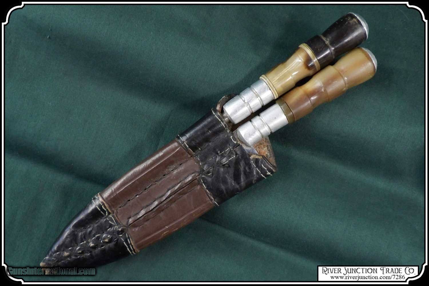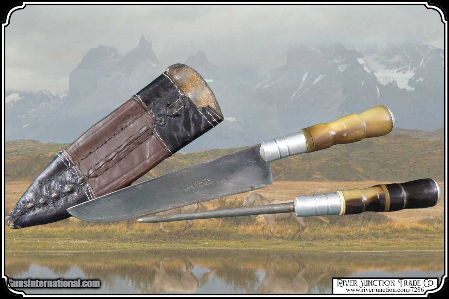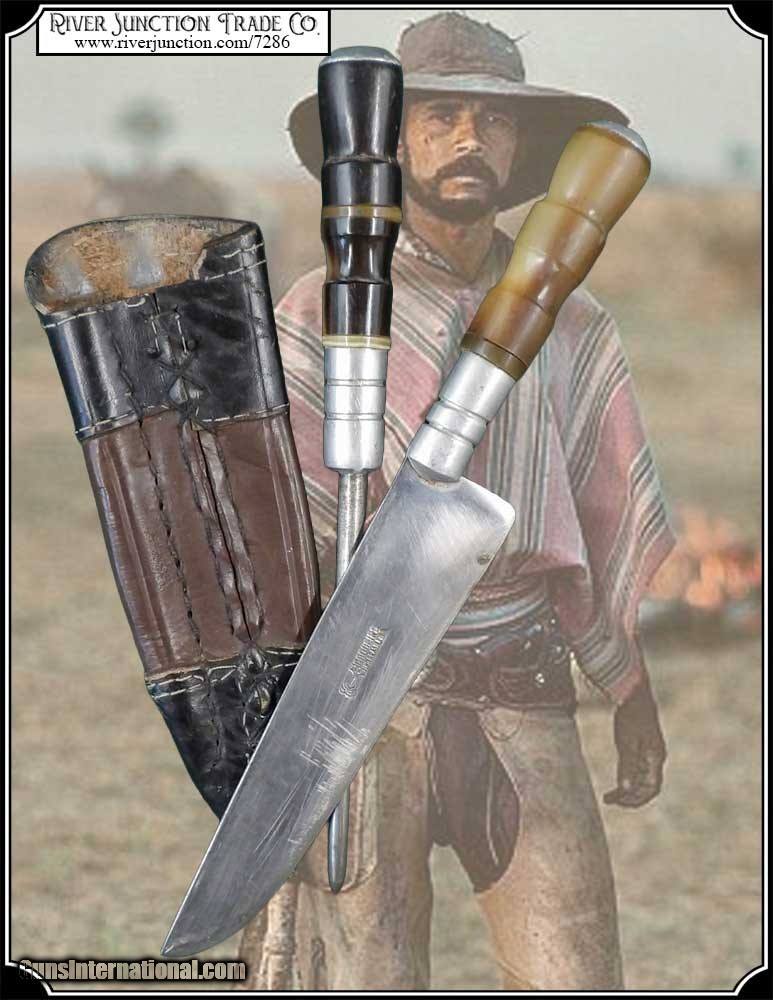 Description: The Gauchos rode the frontier outback of Brazil, Uruguay, Paraguay and most especially the Argentine pampas. In Argentina, the Gaucho is an even more potent cultural symbol than the American cowboy of the USA. They ride still. A rich history there, other than Butch and Sundance holing up there until their luck ran out in Bolivia. This Handcrafted 2Pcs Gaucho Knife and Sharpening Steel with a 6" blade knife and one 5" Sharpening Steel in a leather sheath. It will be a wonderful addition to your collection of Cowboy Regalia . This Gaucho style set is handmade in Brazil. Features a polished Steel blade, with horn handles, Leather Sheath, and Sharpening Steel made in Brazil Price: $169.95 Buy Now Contact Seller |